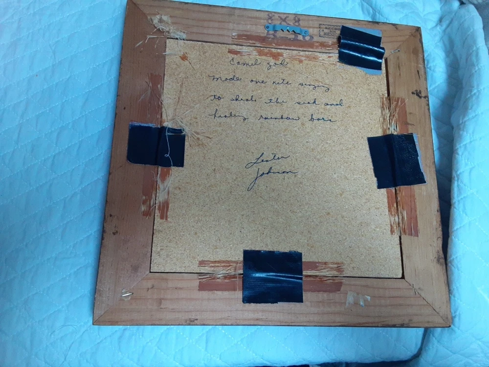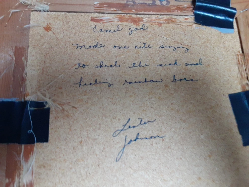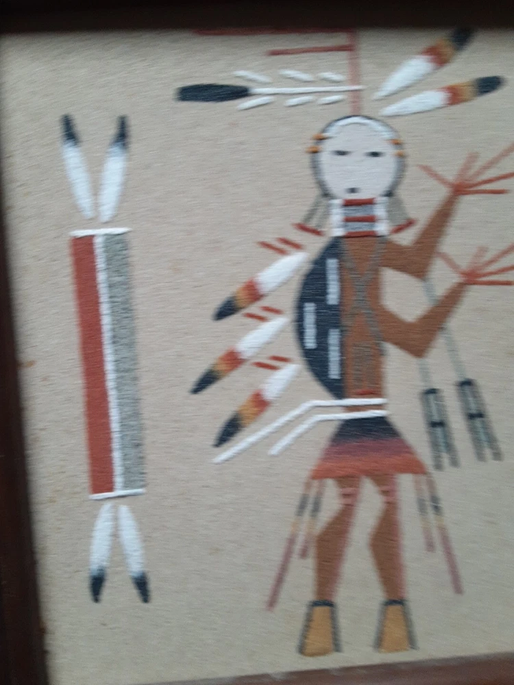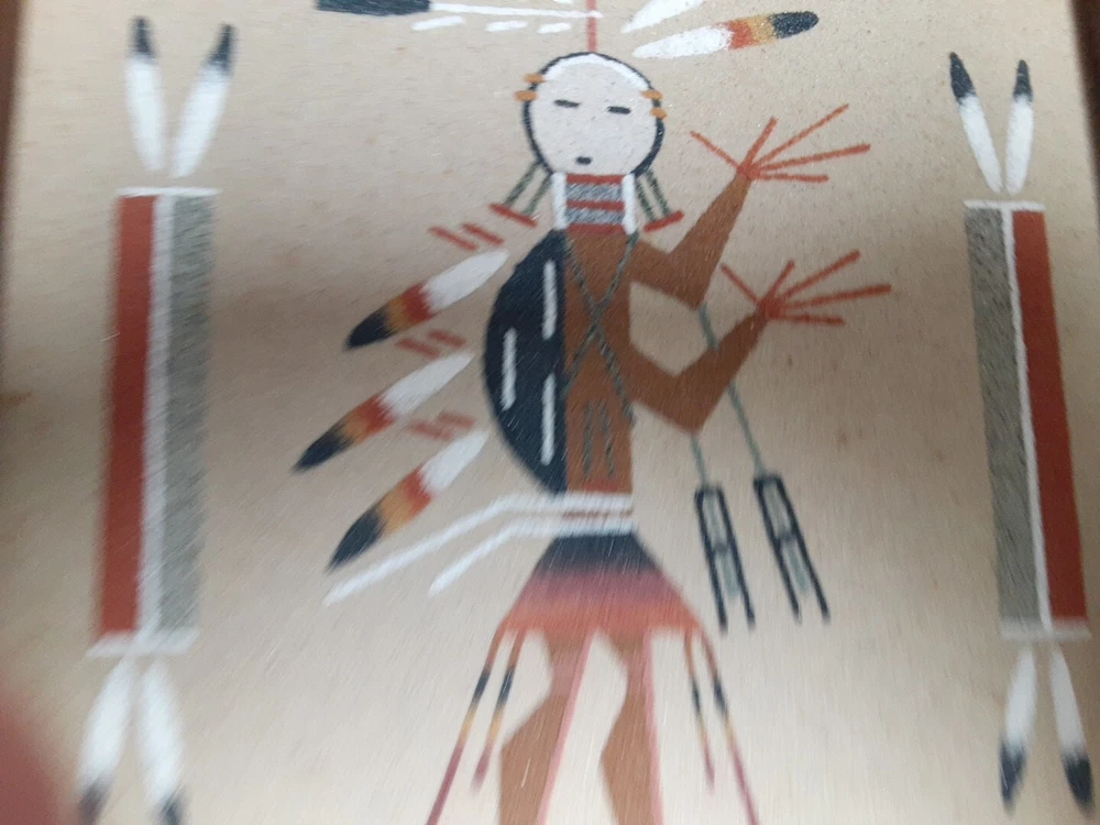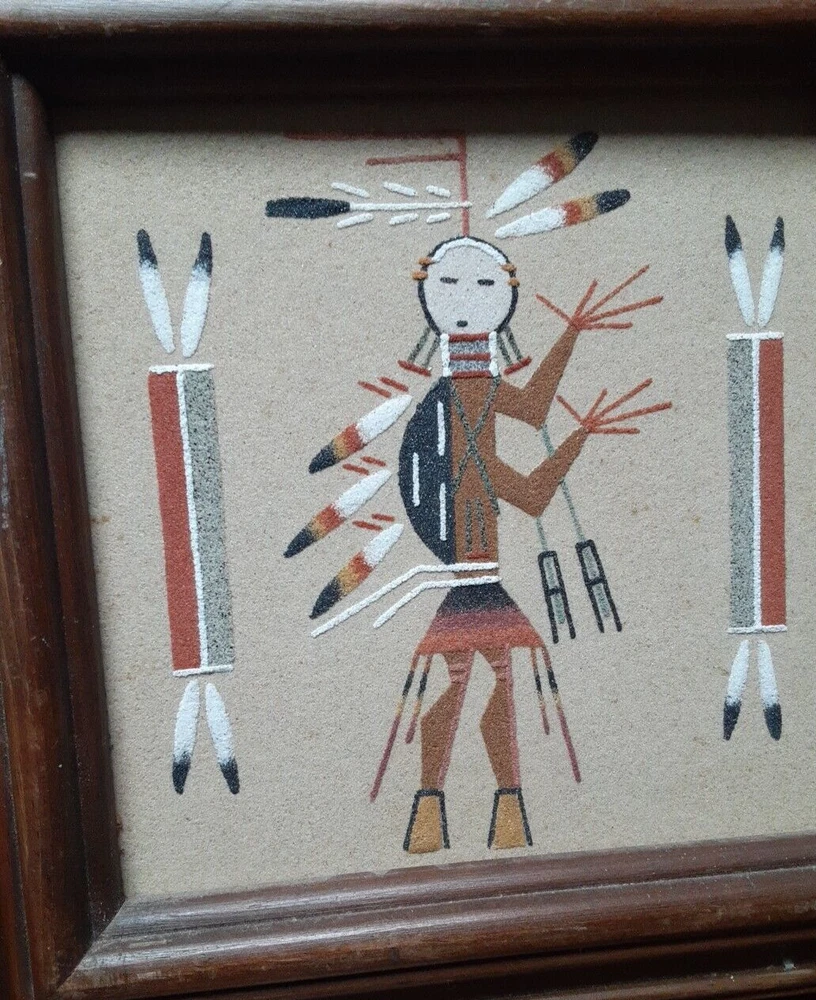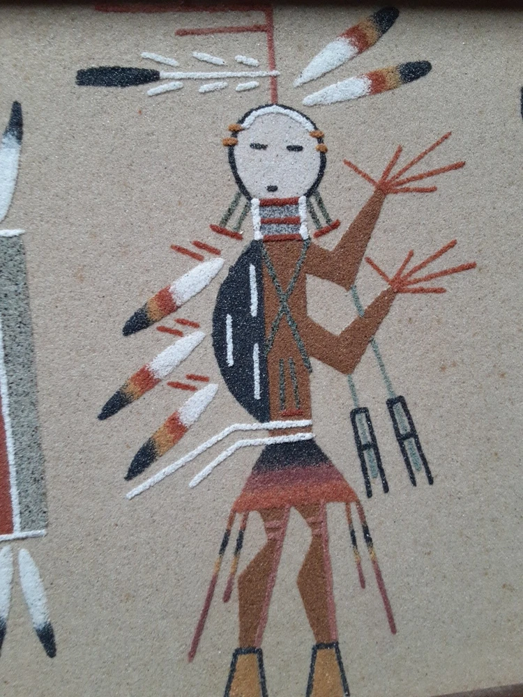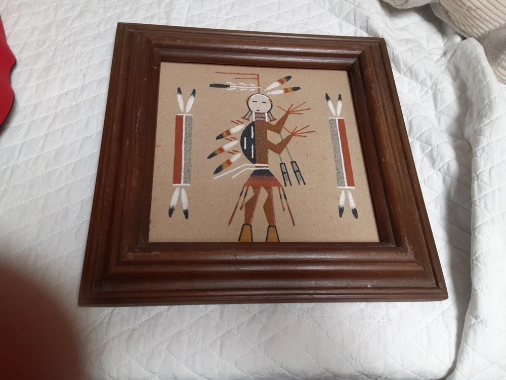 Hand Made South Western Sand Art Figure in Wood Frame Framed needs staple together. Very good condition. signed by Lester Jordan
