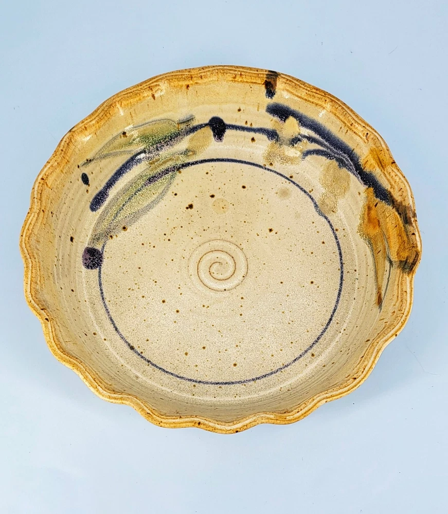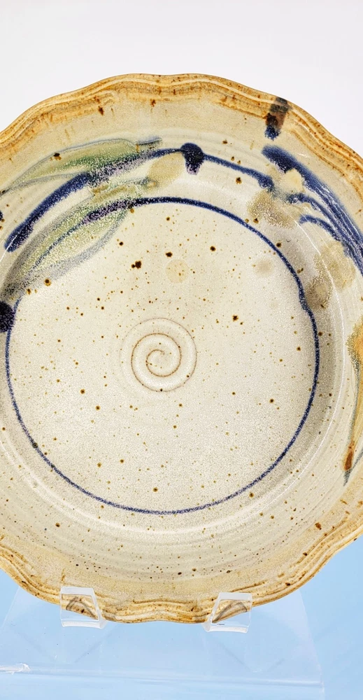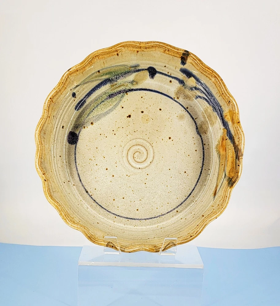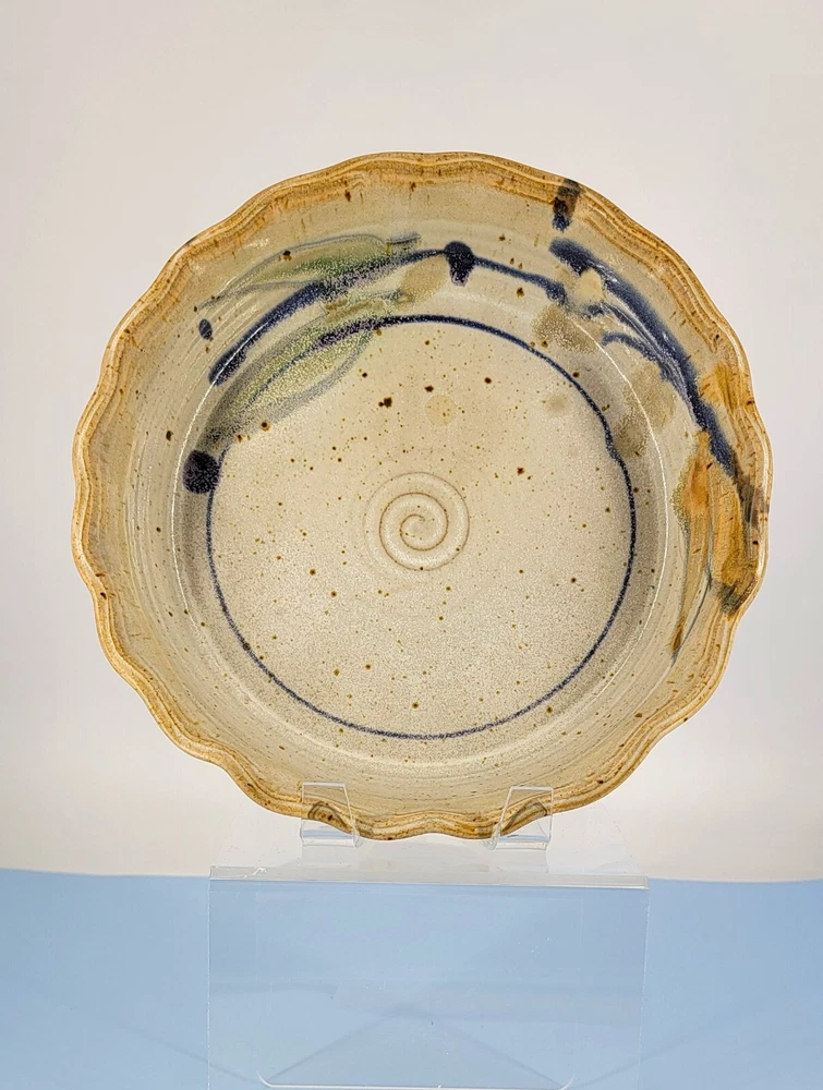 BRAND: This is a beautiful hand made studio pottery piece that appears to be new and unused. The bottom is artist signed however I can't confirm the name. It is an excellent serving piece and looks to be the work of a master potter. COLORWAY" Off White (Natural), Gold, Navy Blue, Celadon Green, Brpwn. SIZE: Approximately 10" Wide and 2.25" Tall. CONDITION: This unique piece of studio pottery is expertly done. The painting in the inside rim of the dish is a stylized stem with leaves and flower buds or berries. It curves around the dish and draws the eye to the spiral swirl in the middle of the piece. It is flecked with brown paint and embellished with gold paint along the ruffled edge. It is a perfect Country or Farm House decor or kitchen piece. Whether you choose to use it for pies or simply displays it for beauty in your home it is certainly a quality addition. There are no signs of chips, cracks, or crazing, looks to be unused. Please see my photos for exact detail.