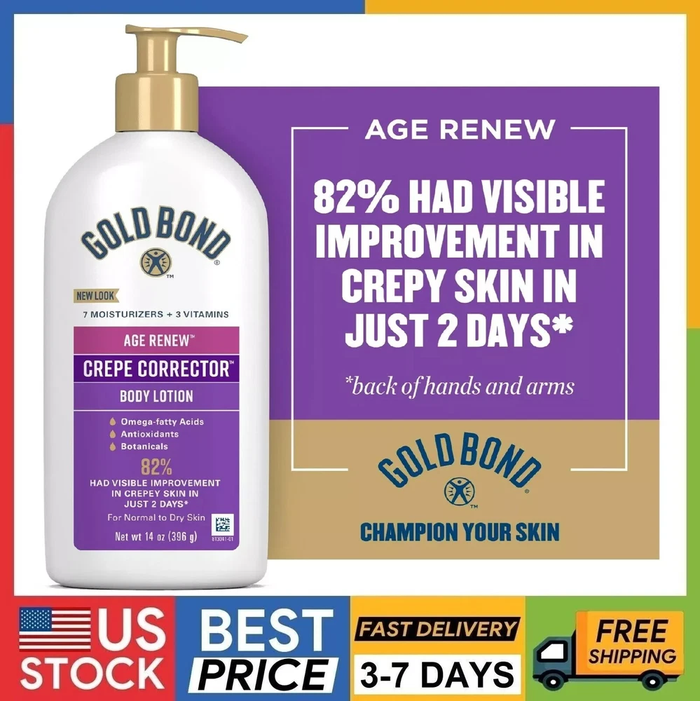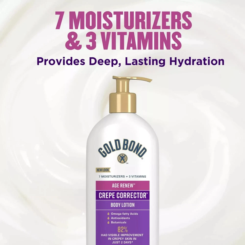 Gold Bond Age Renew Crepe Corrector Hand Moisturizer, Body Lotion, and Face Cream for Tighter Skin, 14 oz Contains: One (1) 14-oz. bottle of Gold Bond Age Renew Crepe Corrector Body Lotion, Replenishing & Smoothing Formula. Gold Bond Crepe Corrector Lotion helps diminish visible signs of crepey skin, such as fine, thin wrinkles. Gold Bond Lotion for dry, crepey skin moisturizes skin for 24 hours for lasting hydration. This lightweight lotion is fragrance free, fast absorbing, non-greasy and tested by dermatologists. This unique smoothing concentrate features protective antioxidants, powerful botanicals and nourishing omega-fatty acids. Level up your #trifecta skincare routine with Gold Bond Age Renew Crepe Corrector Hand, Face and Body Lotion.