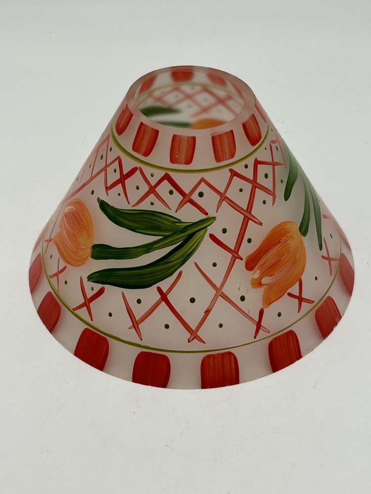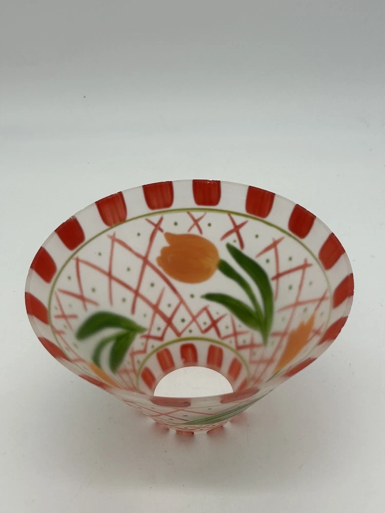 Hand Painted Artglass Glass Tealight Candle Holder/Lamp Orange & Green w/ Tulips
