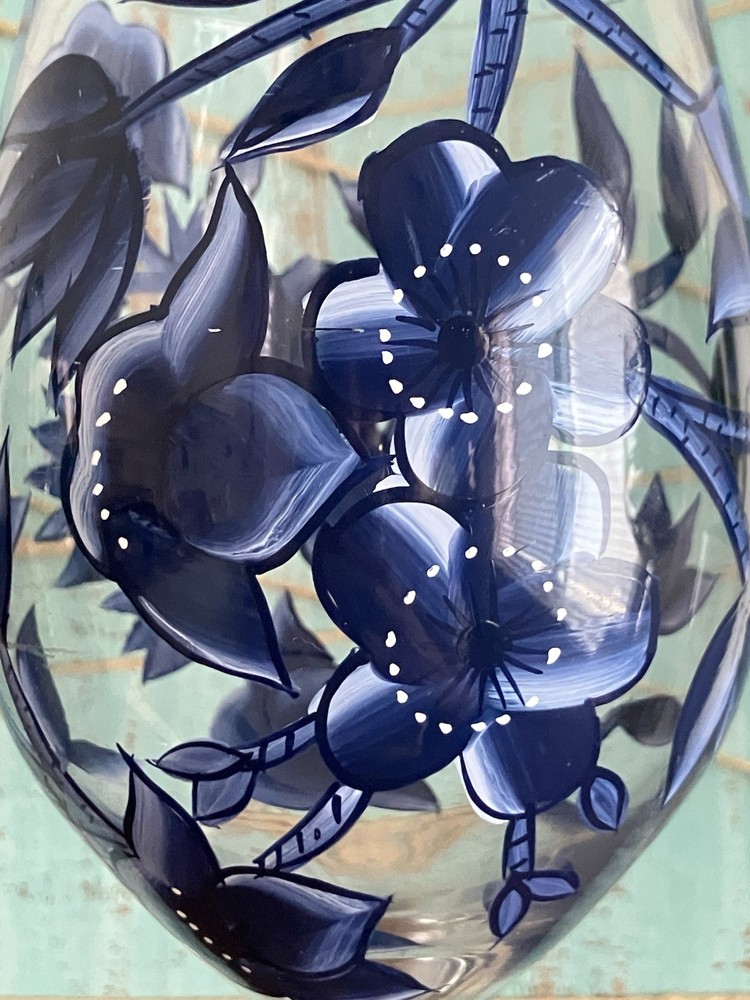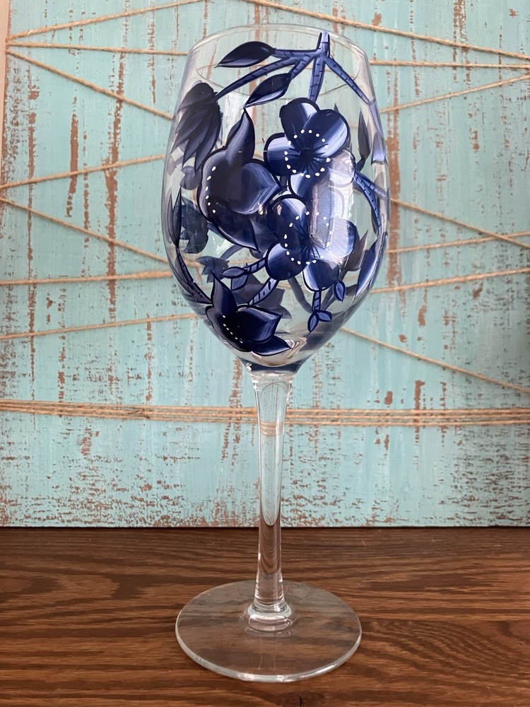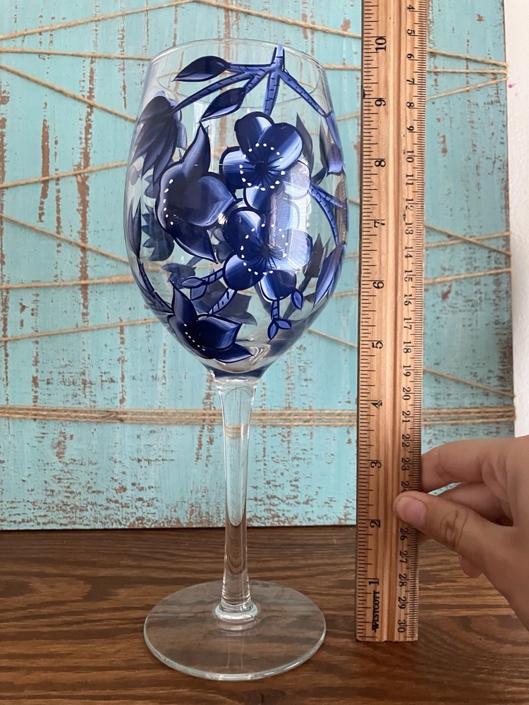 Add a touch of elegance to your next wine party with this set of 2 hand painted wine glasses. The beautiful blue flowers and vines design on each stem is meticulously crafted by hand, making these glasses a unique addition to your collection. The glasses are made of high quality materials and are perfect for any occasion. Whether you're a wine connoisseur or just looking for a special gift, these glasses are sure to impress.