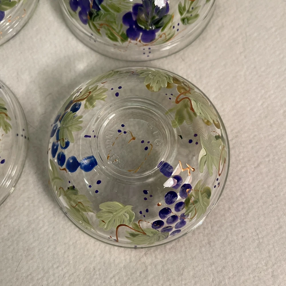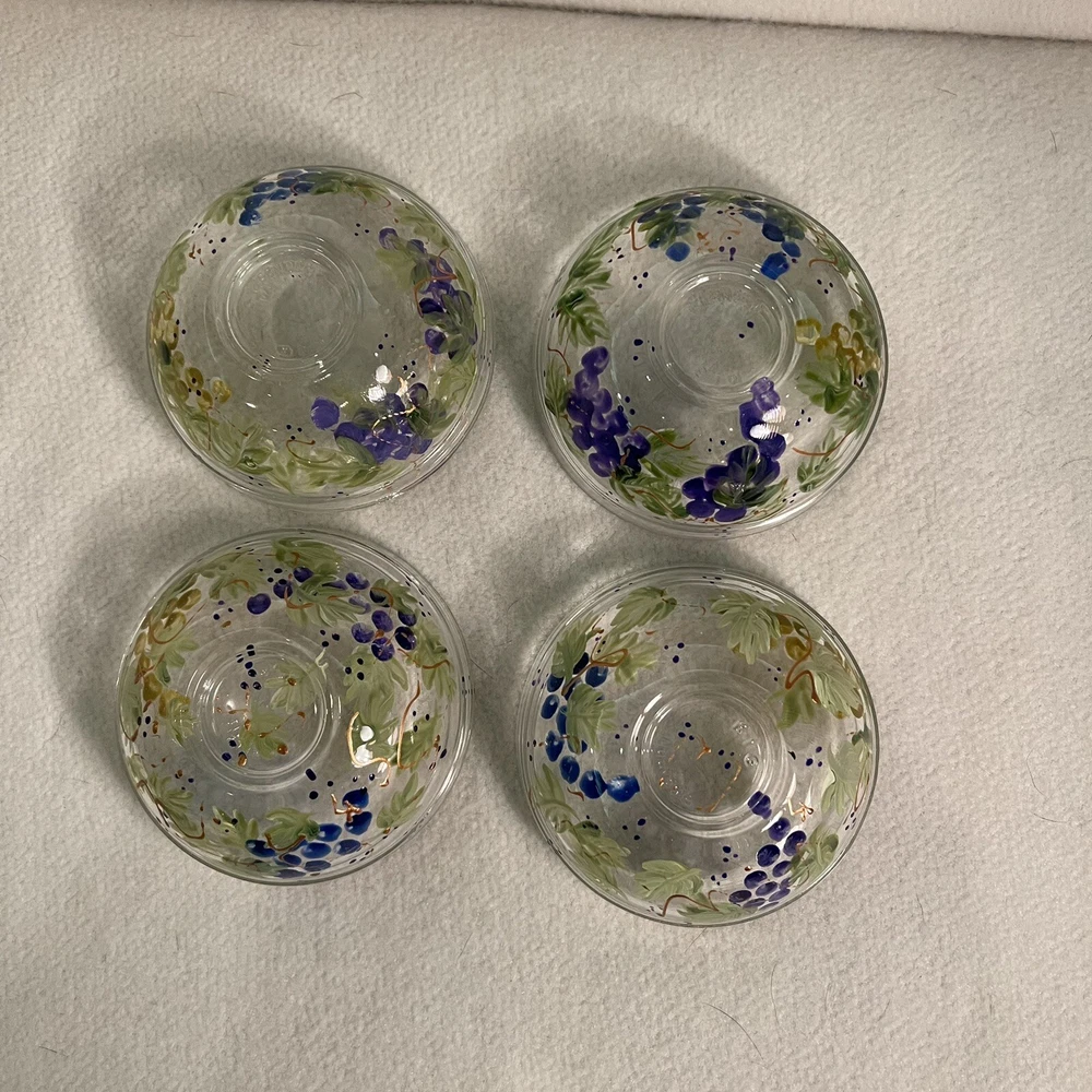This is a vintage set of four hand-painted decorative bowls made of clear glass. Each bowl has a grapevine pattern fused into the glass, giving it an art nouveau style. Measuring 3.5 inches in diameter and 1.5 inches in height, these bowls are suitable for all occasions and can be used for serving dips, sauces, or as prep bowls. The set weighs 25.8 ounces and is from the 1980s, featuring a multicolor design that adds a touch of elegance to any table setting. Excellent condition. No chips or cracks.