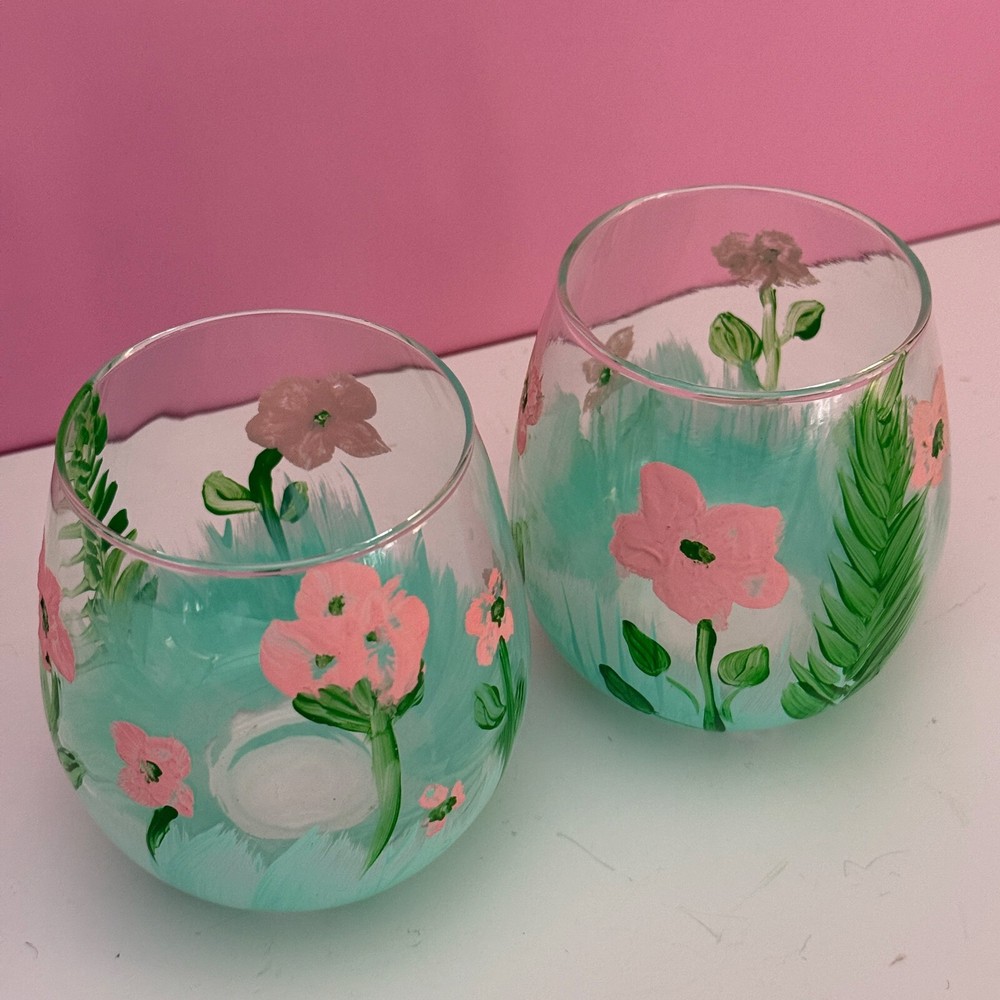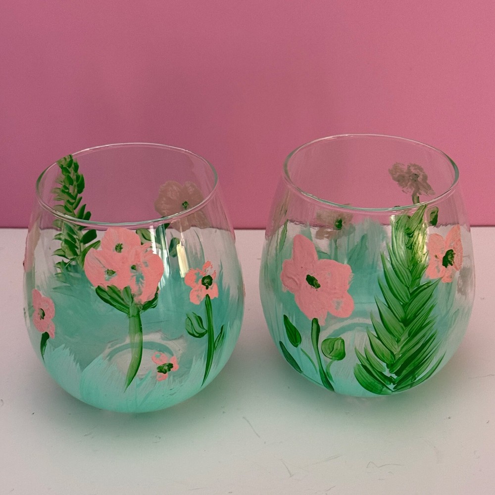 Set Includes: Stemless Wine Glass Occasion: All Occasions Glassware Type: Stemless Glass Brand: Unbranded Features: Hand Painted Number of Items in Set: Two-Piece MPN: N/A Material: Glass Item Height: 4 in Style: Hand-Painted Type: Stemless Wine Glass Theme: Floral Shape: Round Color: Multicolor Service For: 2