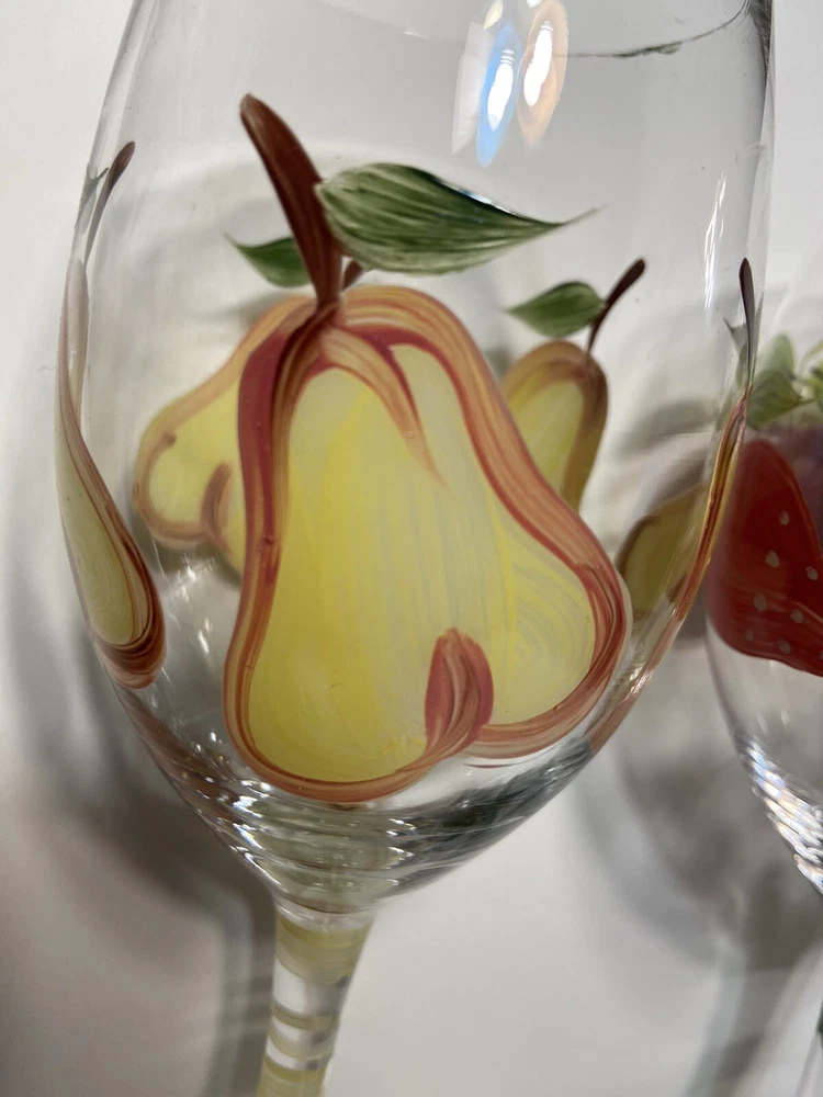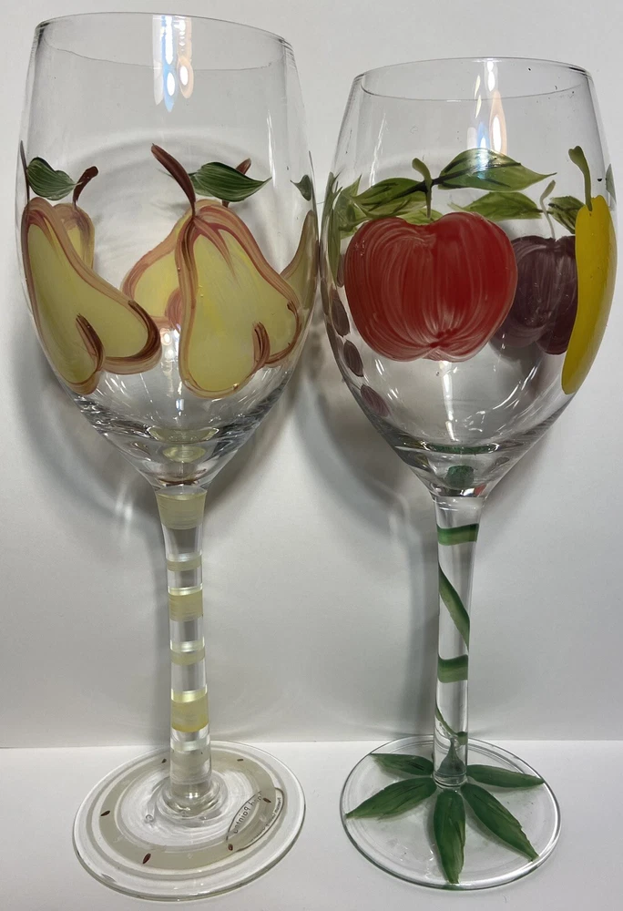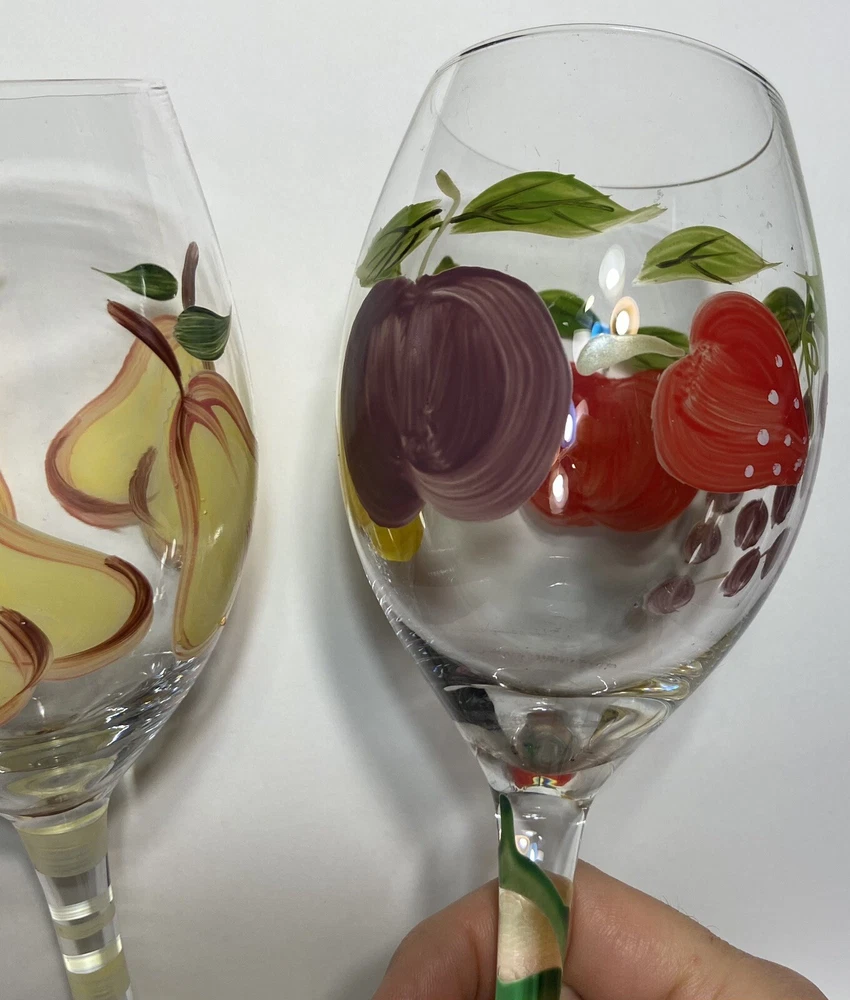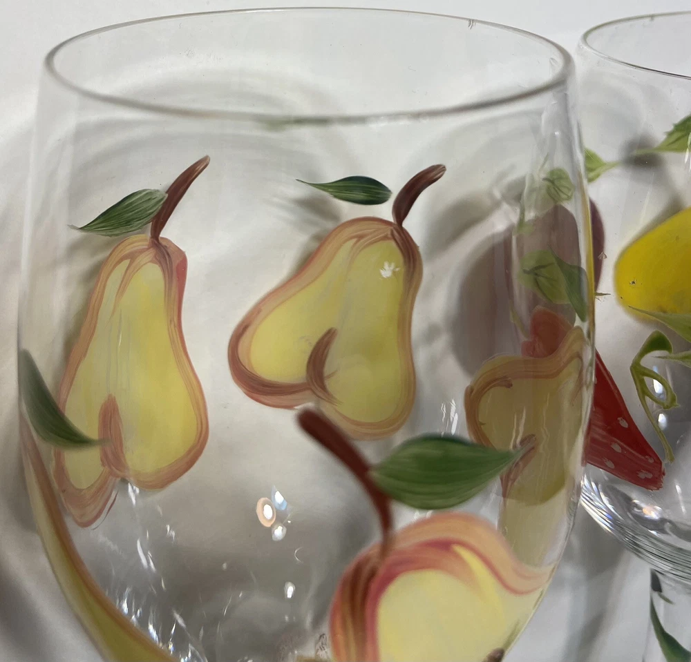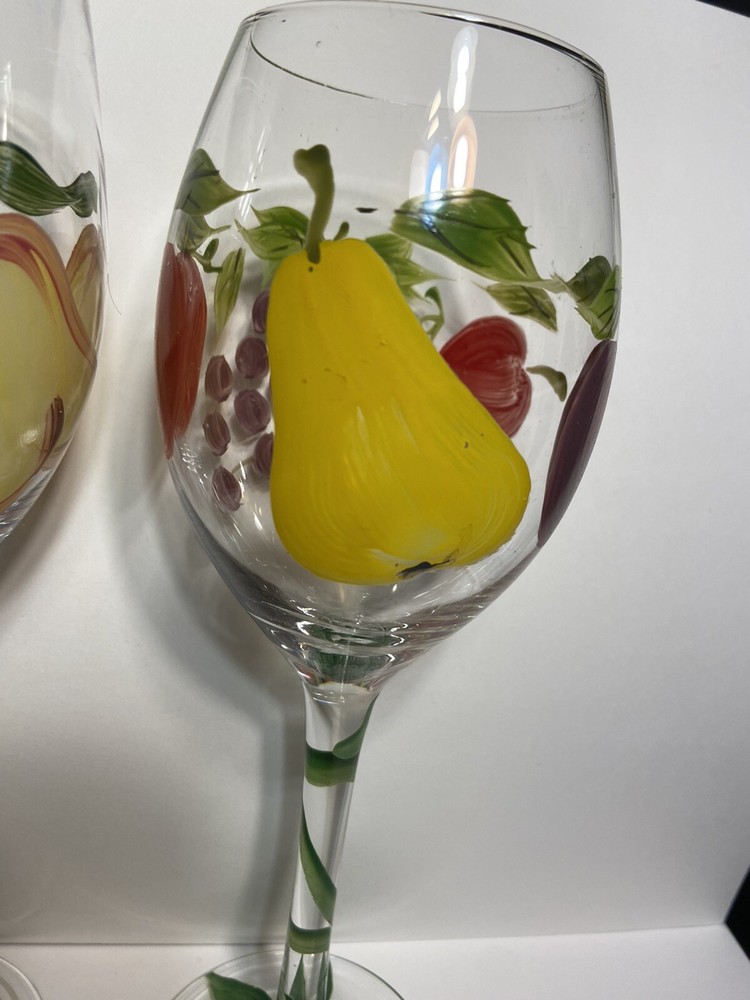 Fruit Wine Glasses Pears Apples Hand Painted Set Of 2 Harvest Gold Burgundy Rare.