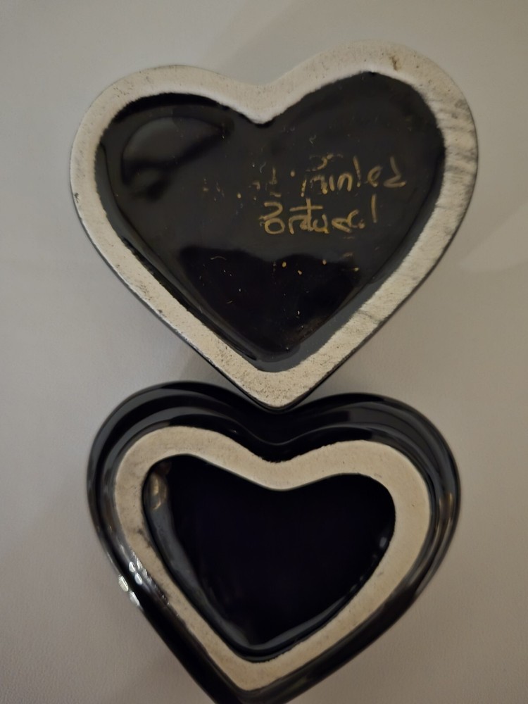 This beautiful trinket box is a unique addition to any collection. With a heart-shaped design and hand-painted floral pattern, it is a true work of art. Manufactured in Portugal in the 1980s, this small box measures 2.5 inches in length and width, and 2.25 inches in height, with a weight of 6 ounces. The box is made of black glossy porcelain and features a multicolor floral pattern that adds a touch of romance to any room. It is perfect for storing small keepsakes or jewelry, and can be cleaned with a damp cloth. This original piece from the Keepsake Boxes collection is a must-have for any collector or lover of vintage items.