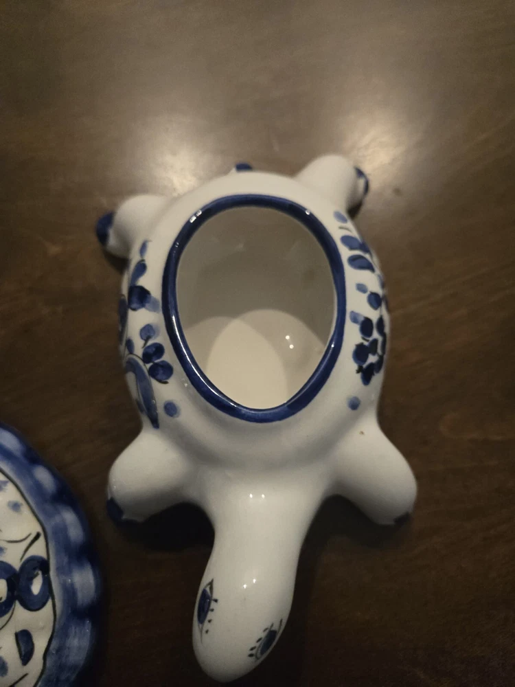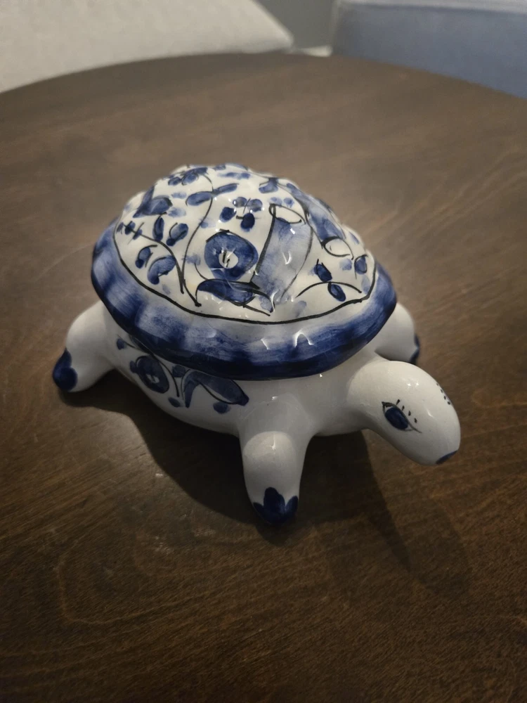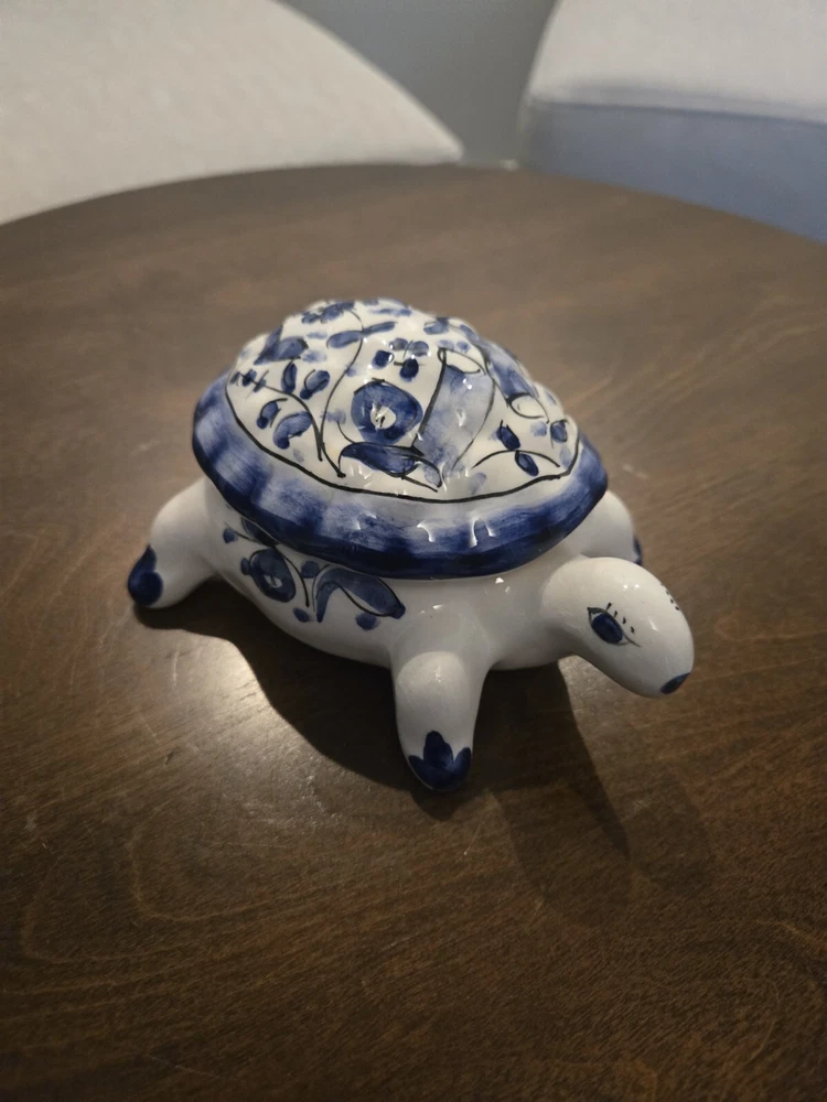 This beautiful trinket box is a true work of art. Crafted in Portugal from high-quality porcelain, it features a delightful hand-painted turtle design. The box is perfect for storing small treasures and trinkets, and will add a touch of elegance to any room. The intricate details of the turtle design make this box a true collector's item. Whether you're a fan of boxing or simply appreciate beautiful decorative pieces, this trinket box is sure to impress. Add it to your collection today and enjoy the beauty and functionality of this exquisite piece.