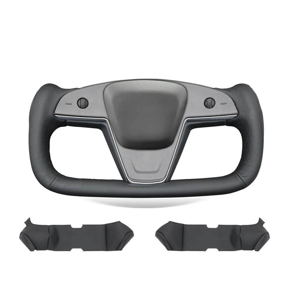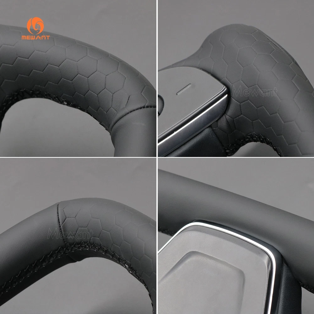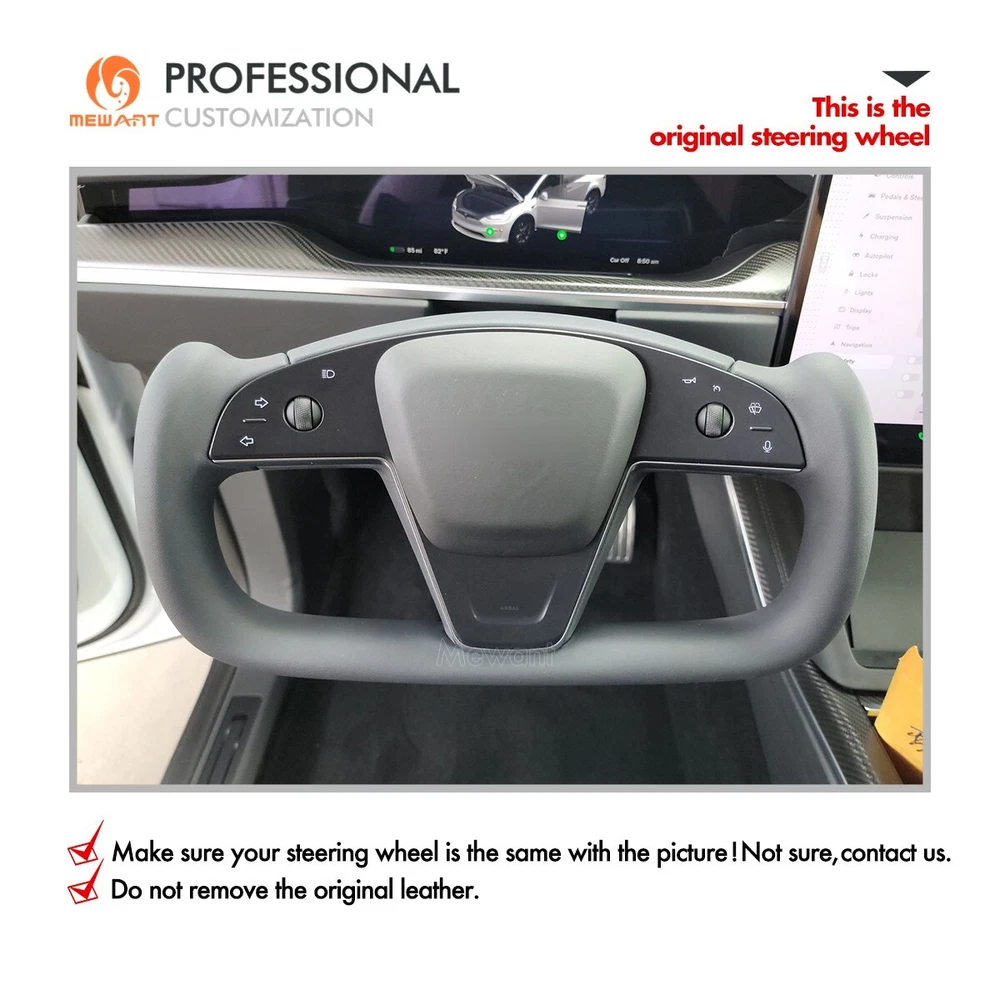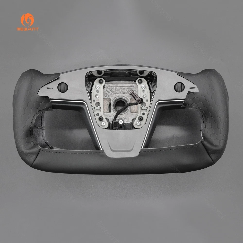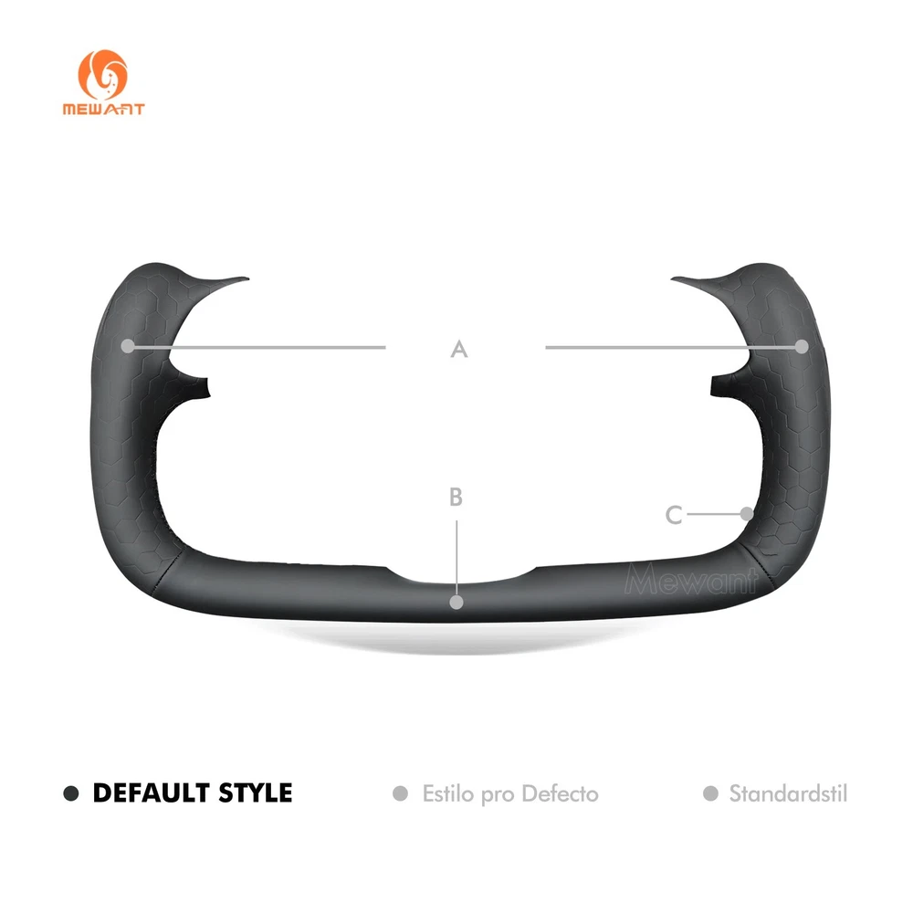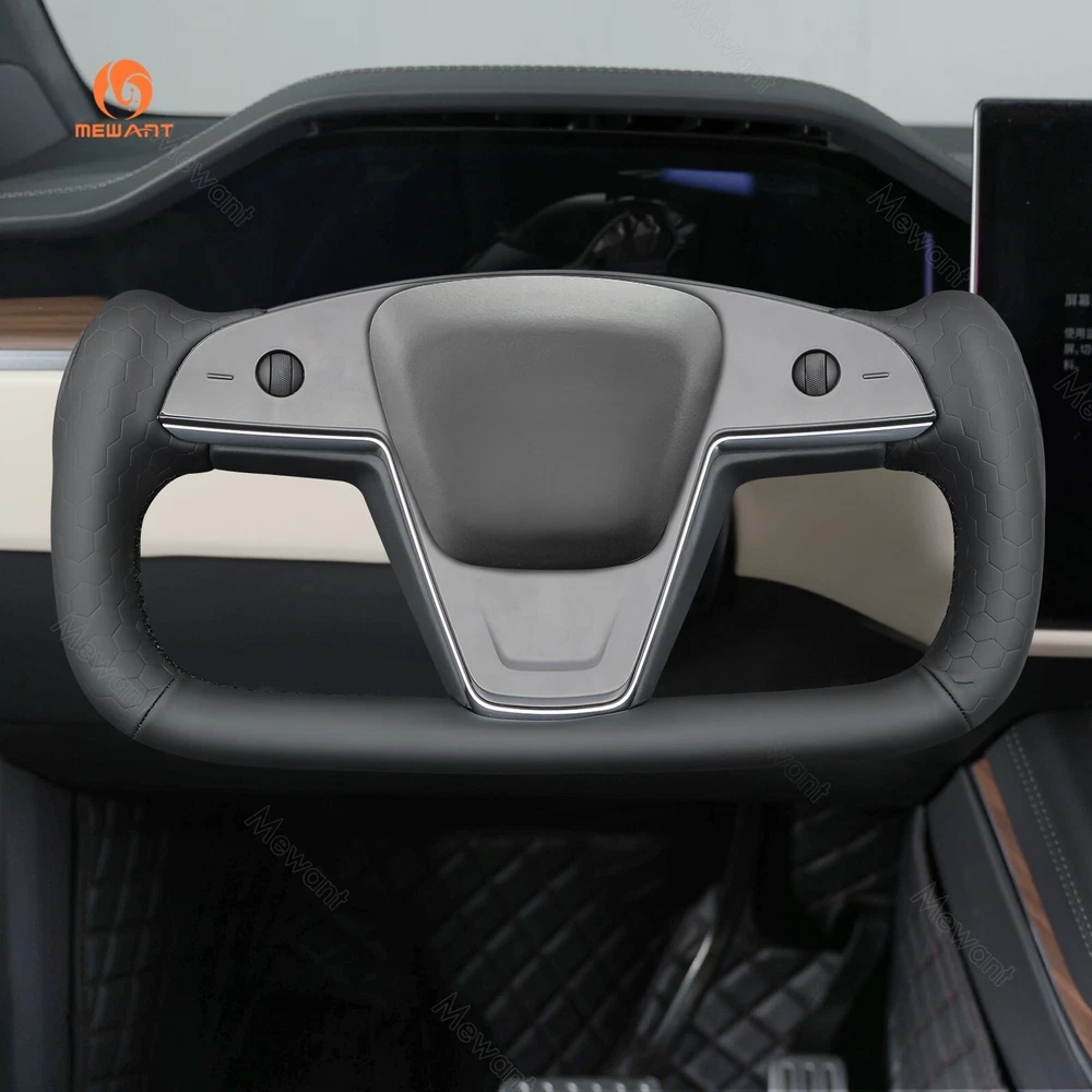 Embossed PU Leather Steering Wheel Cover for Tesla Model S Yoke Model X ONE Car ONE Template Factory buy brand new steering wheels from all over the world, to make the templates which could 100% fit the corresponding car model. Personalized customization Many colors of thread and material for choose to customize. According to the colors and materials you could customize a new style cover. Multiple protection With soft synthetic suede and glossy PU carbon fiber, guarantees a good grip while driving. With 100% fit Mewant cover, it won’t slip while driving. Original Steering Wheel: NOTICE This cover Suitable car model: for Tesla Model S 2021-2023 / Model X 2021-2023(Yoke shape steering wheel) Suitable car model name and launch year are just a reference, different countries have different model name and launch time, so please pay attention to the steering wheel picture above, make sure they are the same , if not sure, feel free to contact us. The Default Design: Design Elements: A: Black Hive-pattern Embossed Artificial Leather B: Black Smooth Artificial Leather C: Black Thread If you want to change the material or color, please contact our customer service when you order. Features * Increased Safety :High quality leather, super soft & smooth , non-slip & durable. it provides great grip on the steering wheel, massage your palm and relieve drive fatigue , bring you a great touch and feel . * Top Quality: delicate workmanship, super technology and flat sewing stitches, The steering wheel gloves are the perfect way to transform the look of your vehicles interior while protecting your original steering wheel at the same time from wear and tear. Self-installation Needed: Our steering wheel covers need to stitch by yourselves, the installation tools, video and instructions were provided to assistant, please do NOT remove the original leather before the installation, or it will not fit. Attachment:Needle,thread,double sided tape,yellow small blade