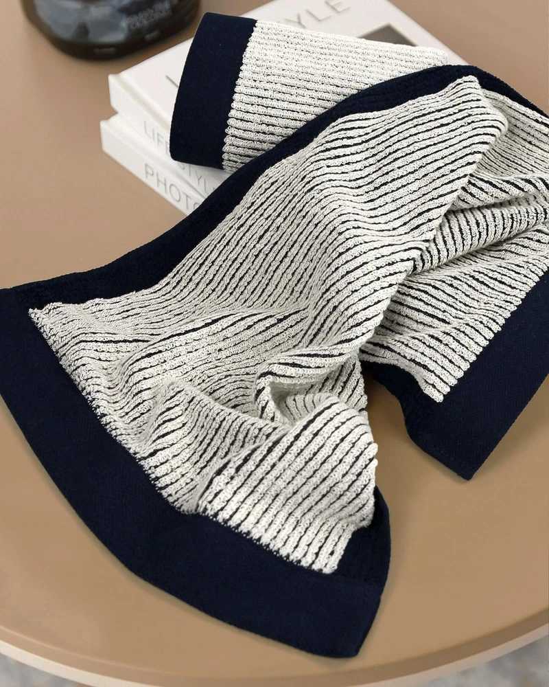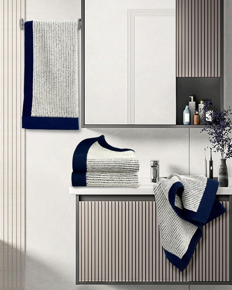 Decorative Hand Towels for Bathroom: The 4 hand towels are made of 100% cotton, the edges are wide navy-blue color, and the middle is white, individual textured lines; The stylish jacquard weaved design makes them both beautiful and practical, especially great for bathroom decoration Soft & Comfortable – Each hand towel has 56 intricately woven lines, each line has more than 1600 loops, so, each surface has more than 89,000 terry loops. This high-density texture provides a soft and gentle feel, perfect for everyday use Durable & Color-Fast – Thoughtfully designed with reinforced edges and double-stitched corners to enhance durability. The medium-weight 3.8 oz fabric strikes a balance between absorbency and breathability. Thanks to our reactive dyeing process, the colors stay vibrant wash after wash Long-lasting: We’ve poured care into every inch; Each 3.8 oz towel, perfect in its medium thickness, boasts edges that are diligently reinforced; Corners? Double-stitched for longevity; And with our reactive dyeing process, you’ll find the colors remain bright and fresh, wash after wash For Every Occasion: Whether you're decking out your guestroom, need a gym companion, want a stylish presence near your kitchen sink, or looking for a thoughtful gift, our set of 4 towels has got you covered; The jacquard design isn't just an aesthetic choice; it's a statement of elegance