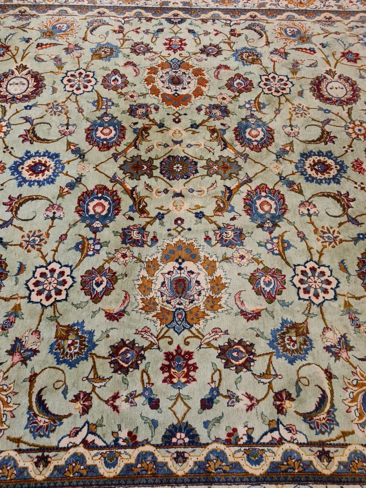 Königlicher Handgeknüpfter Orientteppich – Perser Keshan Palast-Teppich Erleben Sie den majestätischen Charme des antiken Perser Keshan Palast-Teppichs . Mit seiner exquisiten Pistazien grünen Farbgebung und dem durchlaufenden Blumenmuster, das sich über die gesamte großzügige Fläche von 404 cm x 268 cm erstreckt, ist dieser Teppich ein atemberaubendes Beispiel persischer Handwerkskunst. Dieser Teppich wurde vor etwa 70 Jahren aus feinster Korkwolle gefertigt, die auf einer robusten Wollbasis geknüpft ist, und verfügt über eine beeindruckende Knotendichte von 350.000 Knoten pro Quadratmeter. Details: Farbe: Pistaziengrün Muster: Durchlaufende Blumen Material: Feinste Korkwolle auf Wolle Knotendichte: 350.000 Knoten pro Quadratmeter Maße: 404 x 268 cm Artikelnummer: GJ/BL139 Zustand: Sehr gut Besonderheit: Feinste Korkwolle Alter: 70 Jahre Höhepunkte: Elegantes Blumenmuster: Das durchlaufende Blumenmuster dieses Keshan Palast-Teppichs ist eine Hommage an die Natur und füllt den Raum mit seiner harmonischen und doch lebhaften Darstellung floraler Motive. Es symbolisiert das ewige Leben und die beständige Schönheit, die jeden Raum in eine Oase der Ruhe verwandelt. Luxuriöse Korkwolle: Dieser Teppich ist aus feinster Korkwolle gefertigt, die für ihre außergewöhnliche Weichheit und Widerstandsfähigkeit bekannt ist. Korkwolle ist eine seltene und hochwertige Form von Schafwolle, die den Teppich besonders luxuriös und langlebig macht. Hervorragende Handwerkskunst: Mit einer Knotendichte von 350.000 Knoten pro Quadratmeter zeigt dieser Teppich eine beispiellose Präzision und Detailtreue. Diese hohe Knotendichte ermöglicht es, komplexe und filigrane Muster mit außergewöhnlicher Klarheit darzustellen, was den Teppich zu einem wahren Kunstwerk macht. Imposante Größe: Mit seinen beeindruckenden Maßen von 404 cm x 268 cm ist dieser Teppich ideal für große Räume oder Empfangshallen. Er setzt ein markantes Statement und verleiht Ihrem Zuhause eine königliche Eleganz. Königlicher Keshan: Keshan-Teppiche sind weltbekannt für ihre edlen Designs und die meisterhafte Knüpftechnik. Dieser Palast-Teppich ist ein Paradebeispiel für die hervorragende Qualität und das traditionelle Design, das Keshan-Teppiche auszeichnet. Sehr guter Zustand: Obwohl dieser Teppich bereits 70 Jahre alt ist, ist er in einem bemerkenswert guten Zustand. Die Farben sind kräftig und leuchtend, und die Struktur ist fest und unbeschädigt, was ihn besonders wertvoll für Sammler und Liebhaber antiker Teppiche macht. Besonderheit: Dieser Perser Keshan Palast-Teppich besticht durch seine außergewöhnliche Farbgebung in Pistaziengrün und seine exquisite Verarbeitung aus feinster Korkwolle. Seine Größe und seine künstlerischen Details machen ihn zu einem zentralen Element jeder Raumgestaltung. Dieser Teppich ist nicht nur ein dekoratives Stück, sondern auch ein Ausdruck von Luxus und kulturellem Reichtum. Er bietet eine seltene Gelegenheit, ein Stück persischer Geschichte und Handwerkskunst zu besitzen und zu schätzen.