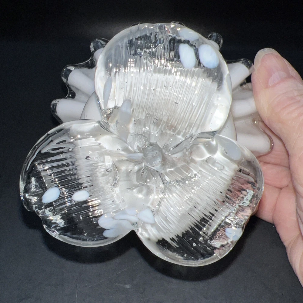 UPC: N/A Theme: Flowers Production Technique: Hand Blown Glass Antique: No gtin13: N/A Handmade: Yes Signed: No Suitable For: Tea Light Origin: Unknown Brand: Unmarked Model: Hand-Blown Art Glass Production Style: Art Glass Seller Notes: “No chips or cracks” MPN: N/A Vintage: Yes Type: Tea Light Holder Color: White/Clear Material: Glass