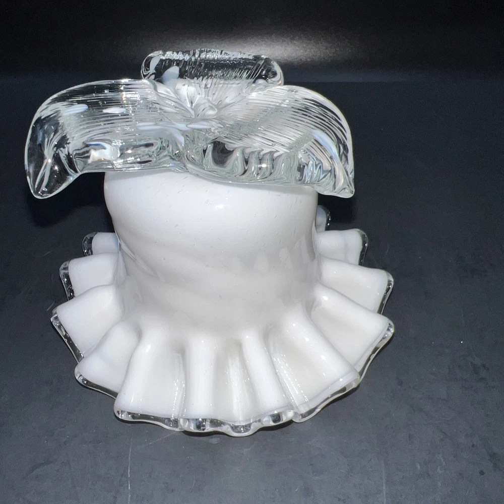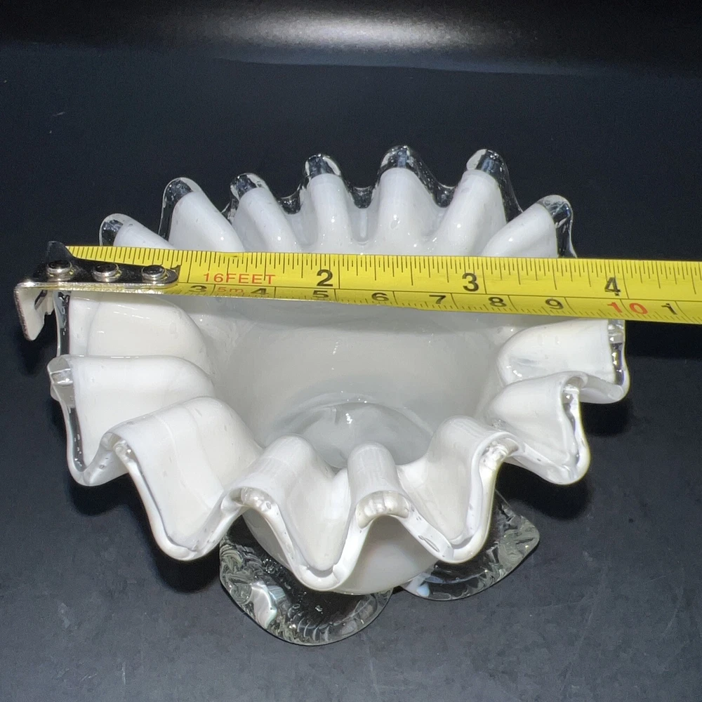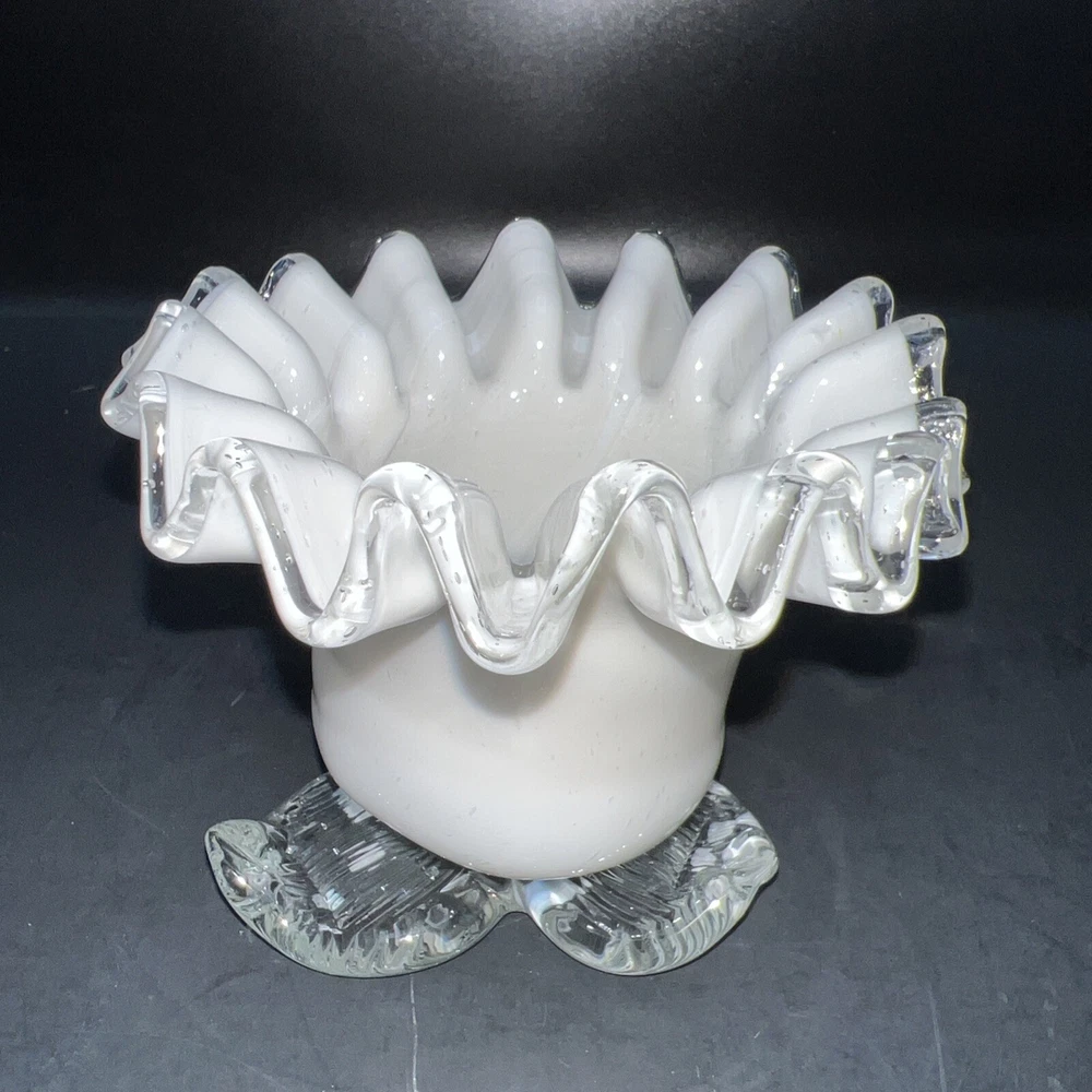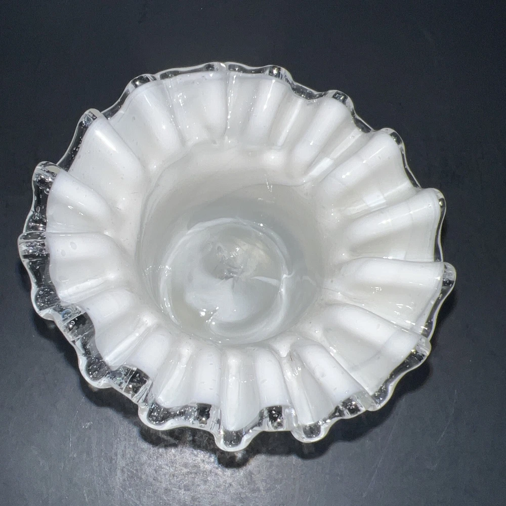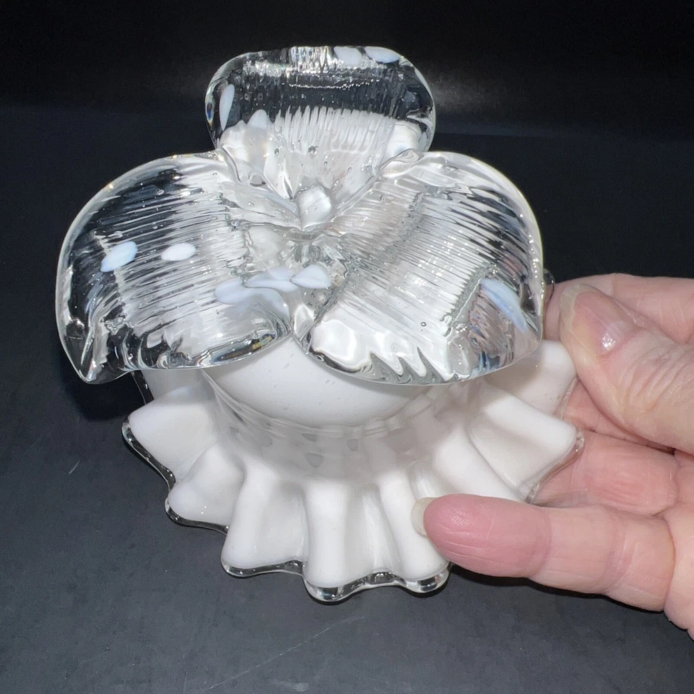 This exquisite piece of hand-blown art glass is sure to catch your eye. The flower-shaped tea light holder features a beautiful white swirl pattern and silver crested edges that give it an elegant and luxurious look. The glass is of the highest quality and has been expertly handcrafted to create a unique and one-of-a-kind piece. This tea light holder is suitable for any home decor style and is perfect for adding a touch of sophistication to your living space. The holder is handmade and features intricate details that make it a true work of art. Whether you're a collector of art glass or just someone who appreciates beautiful things, this tea light holder is sure to impress. I will pack with care and get it to you ASAP Thank you for looking !