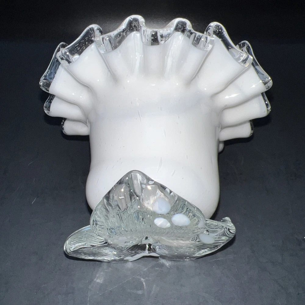 Hand-Blown Art Glass Flower Shaped White Swirl Silver Crested Tea Light Holder
