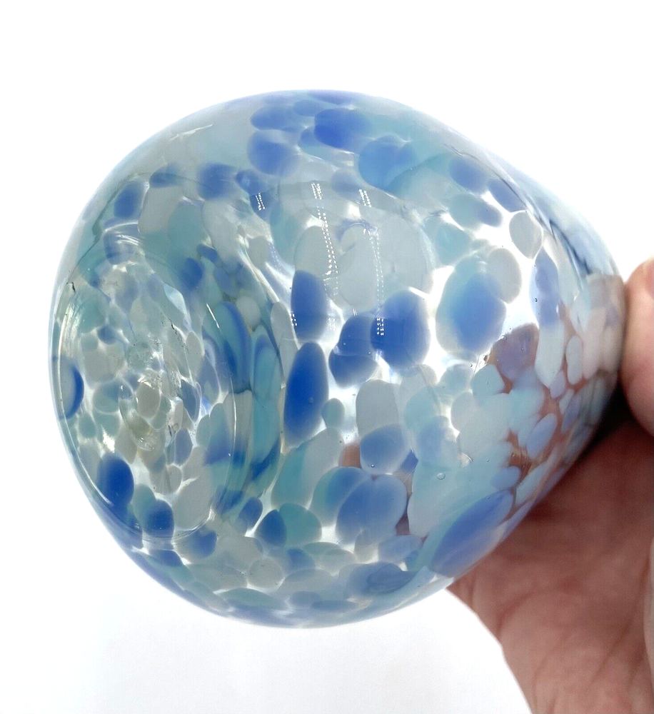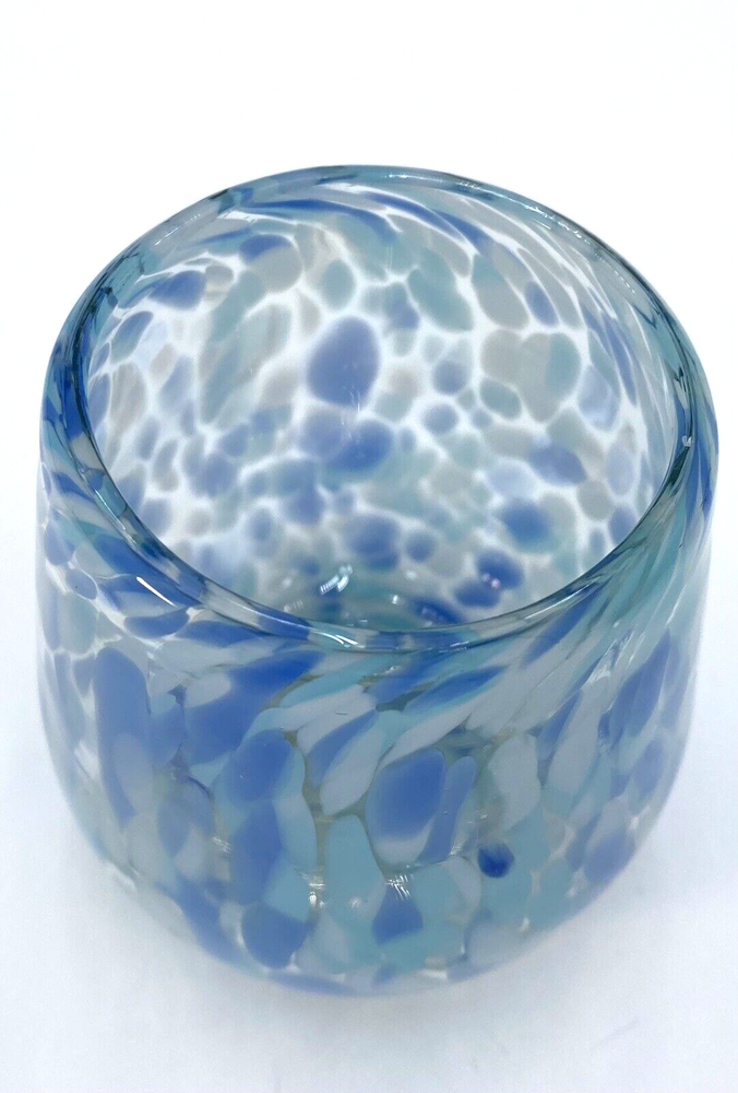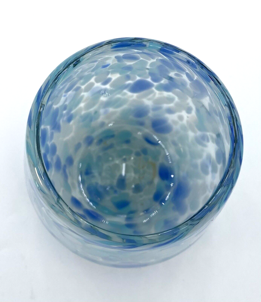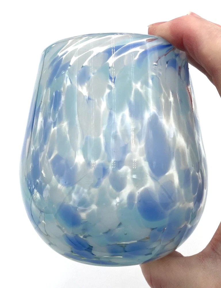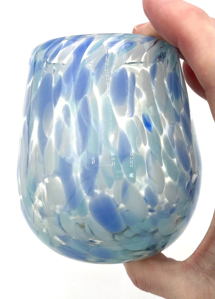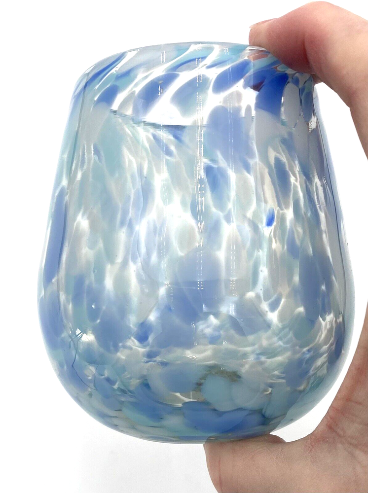 Elevate your drinkware collection with this unique, stemless wine glass that boasts a hand-blown design, ensuring that each piece is one-of-a-kind. The glass features a playful confetti pattern in a soothing blue, periwinkle and white color scheme, perfect for marking special occasions or simply adding a touch of whimsy to your everyday wine enjoyment. Crafted from high-quality glass, this wine glass is both durable and chic, with a graduated shape that adds an artistic touch to its appearance. It has a 12-ounce capacity and stands at 4.1 inches tall and 3.5 inches at its widest. Whether you're treating yourself or gifting it to a friend, this wine glass is a delightful addition to any celebrations. The wine glass is in excellent condition. There are no chips, cracks or signs of wear.