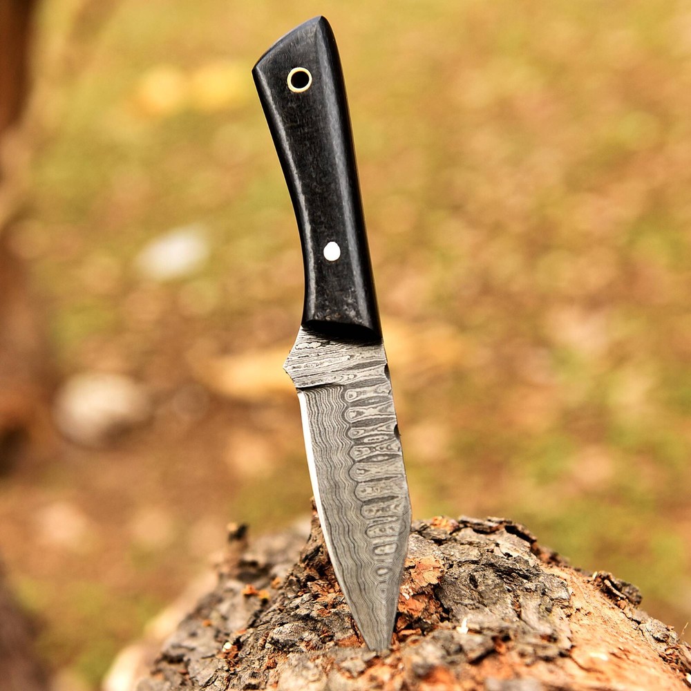 CUSTOM MADE HAND FORGED DAMASCUS STEEL BLADE HUNTING CAMPING SURVIVAL KNIFE Micarta Handle This superb design knife is hand forged. Blade of this knife has a nice file work and is made of 512 layers of 4340 stainless steel and 1075 high carbon steel and hardness 55-58 HRC . This robust knife is lab tested under intense conditions, the balance and shape of this knife ensures perfect grip. Overall Length: 7" Inches Blade Length: 3.6" Inches Handle Length: 3.6" Inches Damascus Design: Rain Drop Pattern Layers: 512 Package Includes: with Leather Sheath Warning: Keep fingers clear of blades. Store away from children.