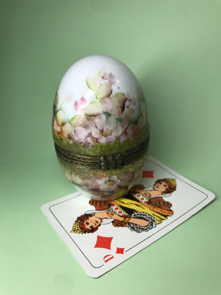 FROM MADEIRA WITH LOVE.... Found in an estate liquidation on the island of Madeira in Portugal, that of a family with ties to France. Purchased a decade ago at the Flea Market in Paris, a hand painted trinket box in the form of an egg. It stands 3 inches tall and was signed by the artist and dated 2006. Additionally marked "Peinte a`la Main" for hand painted. The artist name is i mpossible to decipher. It has survived in good condition, free of chips or cracks, no abrasions. I did notice a small drop of hardened glue on the inside of the lower half that I have left as found. I have inserted a standard size playing card in one photo as a reference for size. MUCH OBLIGED