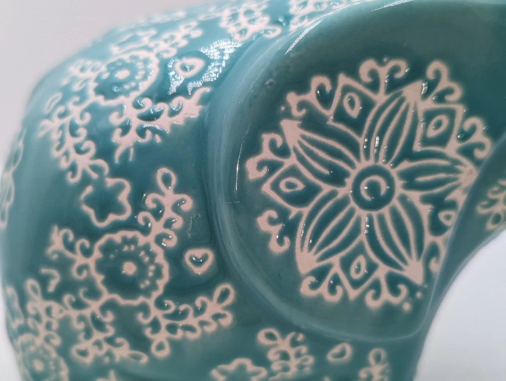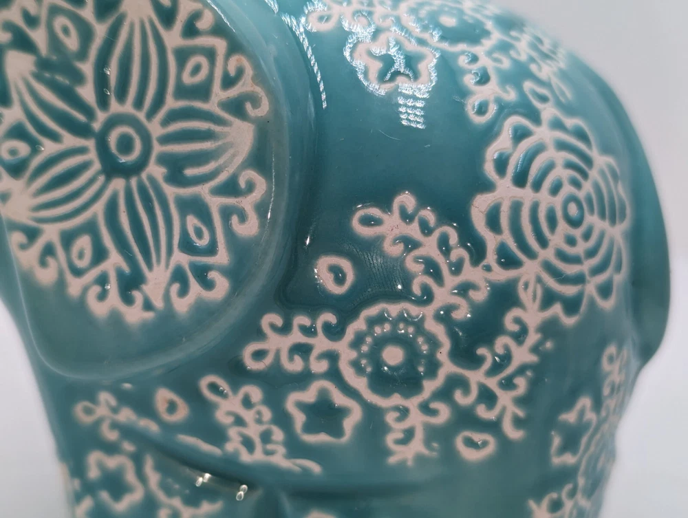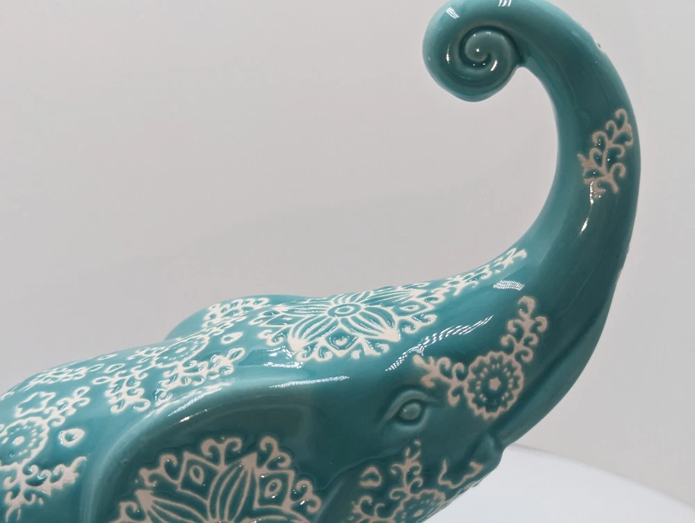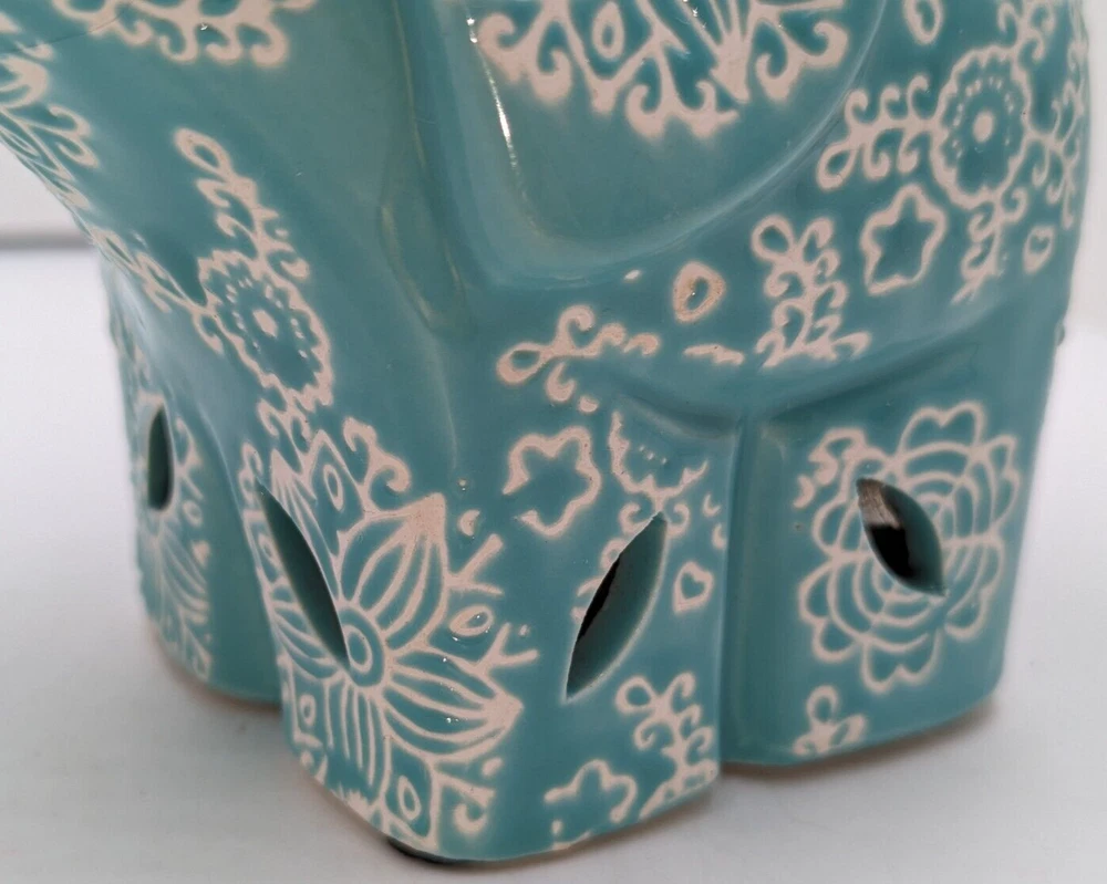 1. This adorable ceramic elephant is a charming addition to any room! The hand-painted turquoise details are vibrant, and the intricate design gives it a playful, whimsical feel. While the original potpourri scent has faded, it’s easy to refresh with new fragrance. The unglazed white clay adds a nice contrast, and the curled trunk is such a cute touch. Even without the rubber plug, it’s still a beautiful decorative piece. Love the unique cutouts around the base—such a creative detail! Perfect for adding a pop of color and personality to your space.