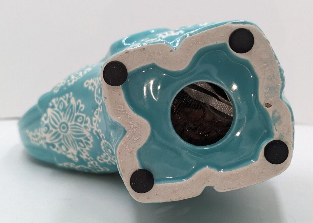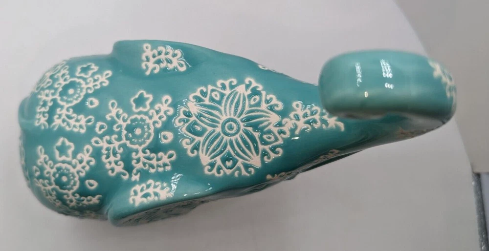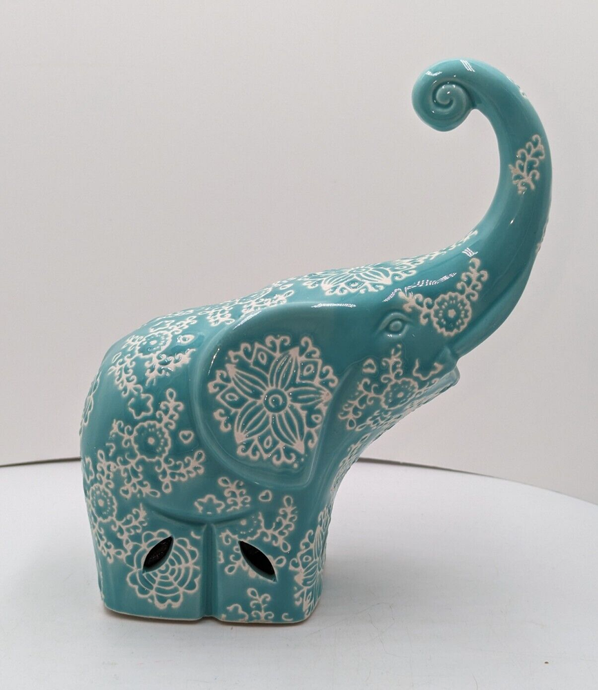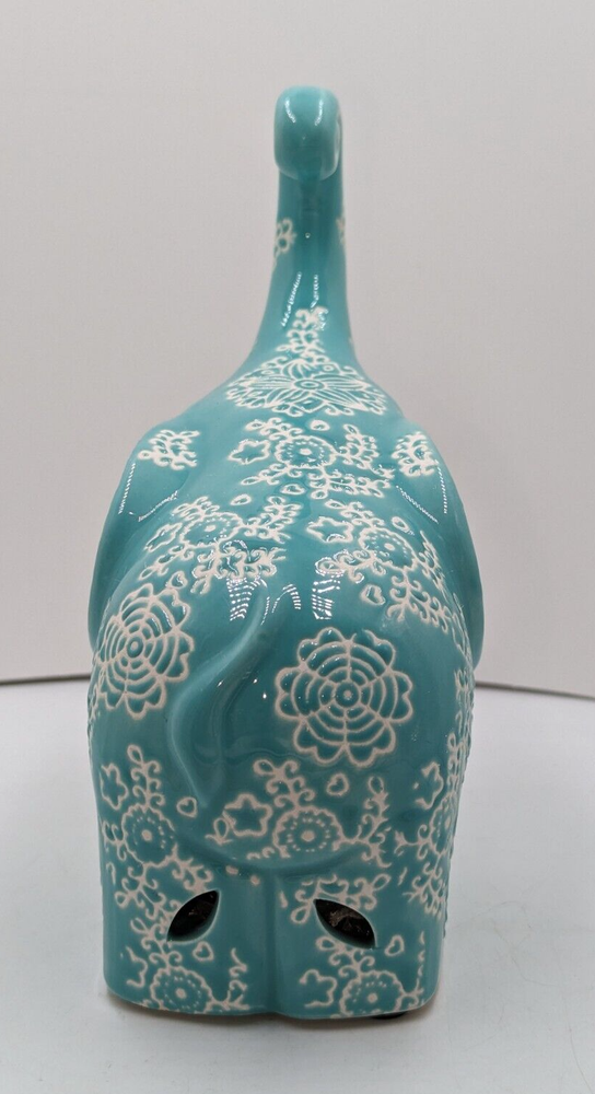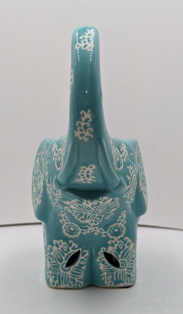 GC Home Ceramic Elephant Potpourri Holder Hand Painted Turquoise Color 7" H. There are no chips, cracks or breaks. The potpourri bag is still inside but it doesn't offer much fragrance anymore and could just be replaced. The rubber plug is missing. This elephant is a very whimsical, intricate design. The white areas are unglazed and show the white clay beneath. I'm not sure how the color is showing on your screen, but it is a light turquoise. The trunk is curled up and there are holes cut out around the base for the release of fragrance. All of my items are carefully packed for shipping, no matter their value - $5 items are wrapped with the same care as a $200 item. My goal is to have your purchase arrive safely. Large, heavy and fragile items are harder to use combined shipping with but just ask if you would like to purchase more than one item and I am more than happy to do so if feasible. Measurements are approximate or as close as I can get. Also, the color you see many not be the exact color depending on your computer or phone settings. Unpaid items will result in the buyer being blocked from further purchases. Please remit payment right away so we can get your item shipped out quickly.