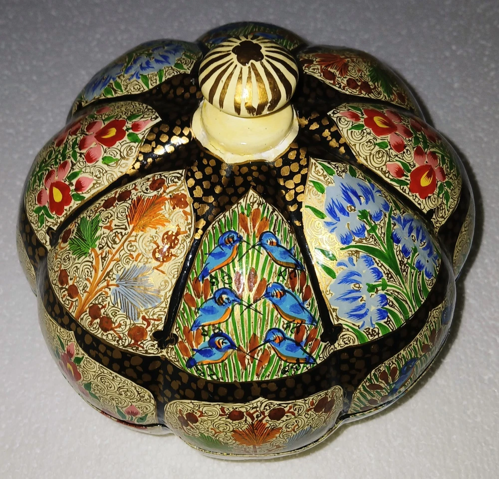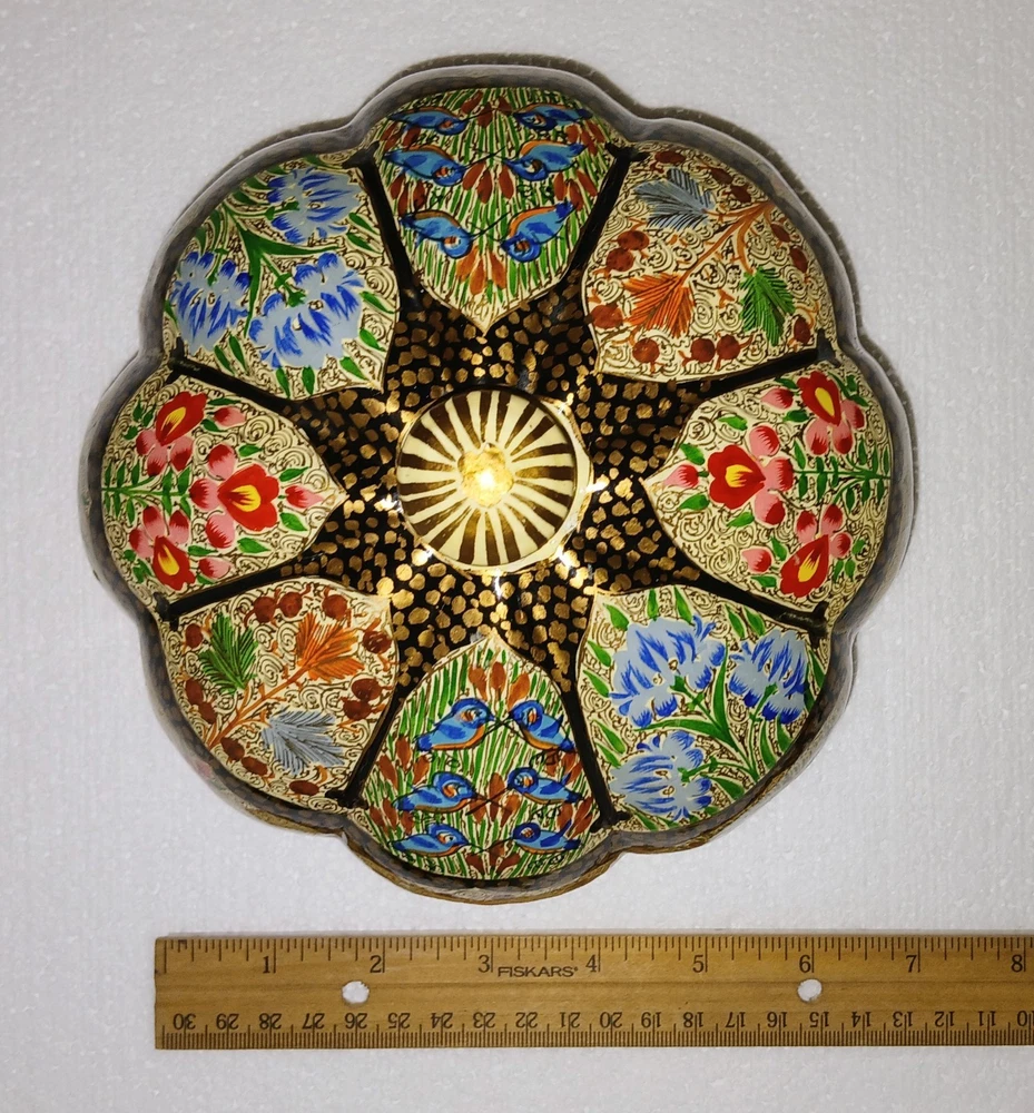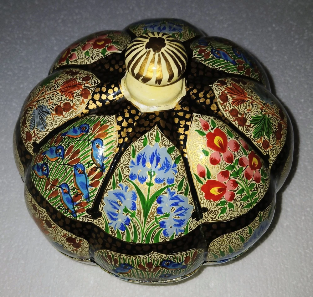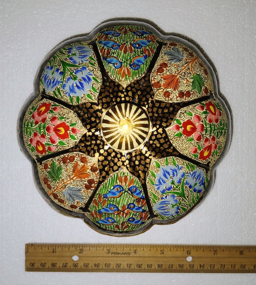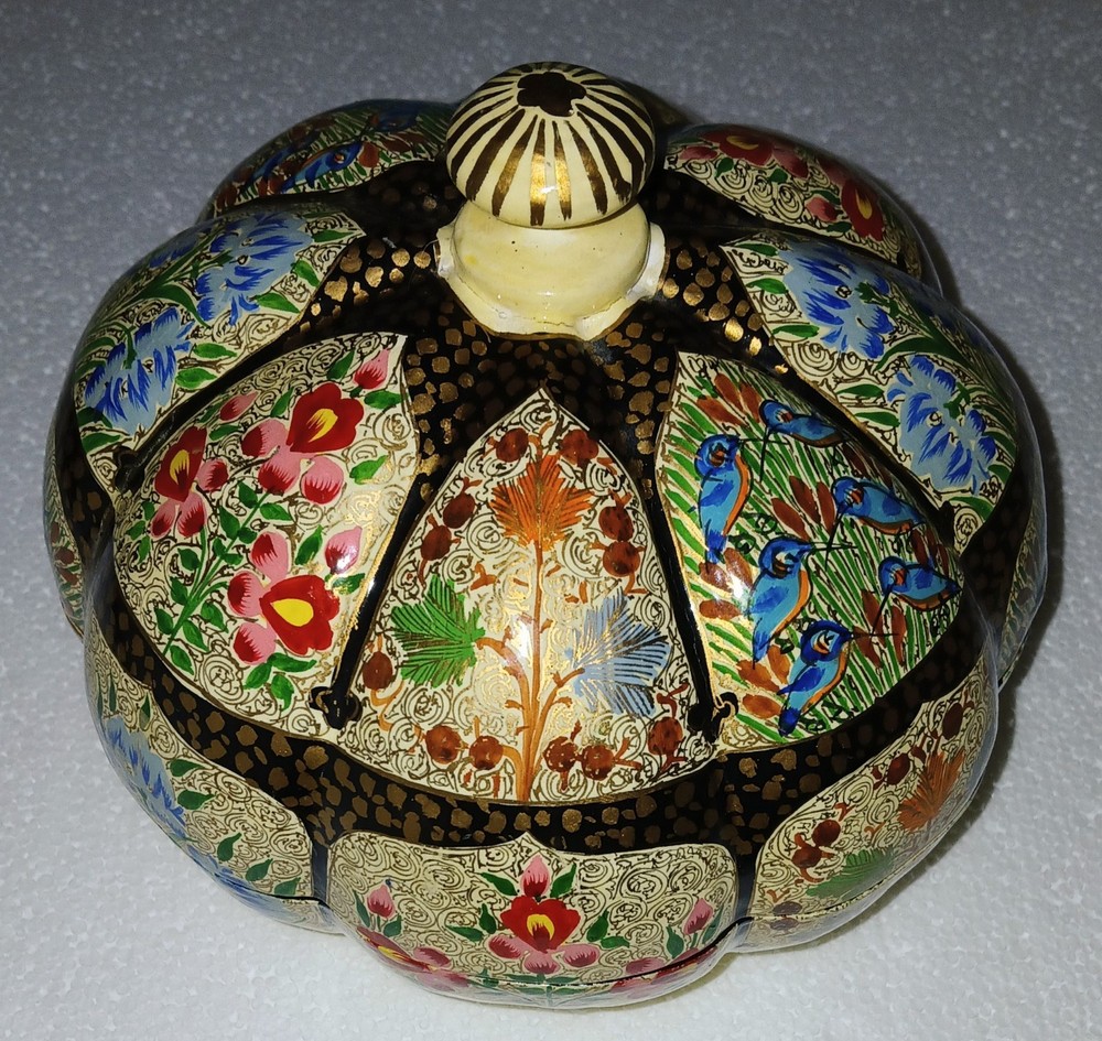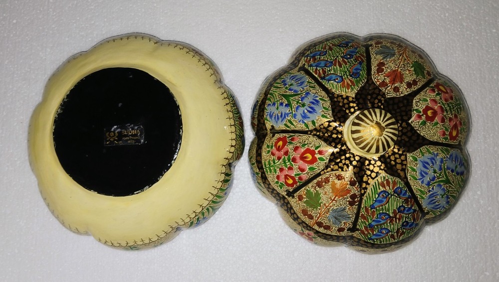 Room: Any Room Theme: Art Item Length: 6-1/4" Type: Trinket Box Brand: Kashmir Country/Region of Manufacture: India Handmade: Yes Features: Hand Painted Seller Notes: “Excellent used condition” Size: Large Finish: Lacquered Item Width: 6-1/4" Original/Reproduction: Original Collection: Keepsake Boxes Material: Papier Mache Number in Pack: 1 Style: Far Eastern Subject: Flowers and birds Color: Multicolor Pattern: Flora and fauna Item Height: 6" Closure Type: Lid Occasion: All Occasions Shape: Round