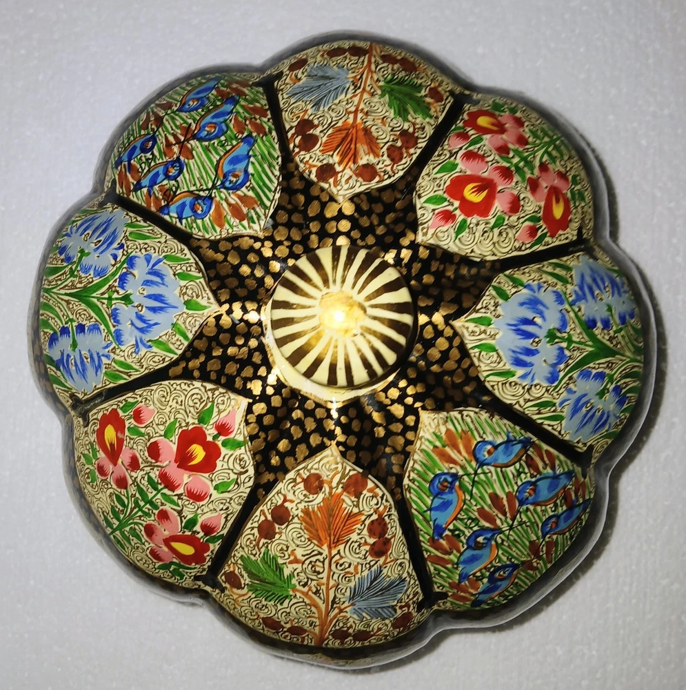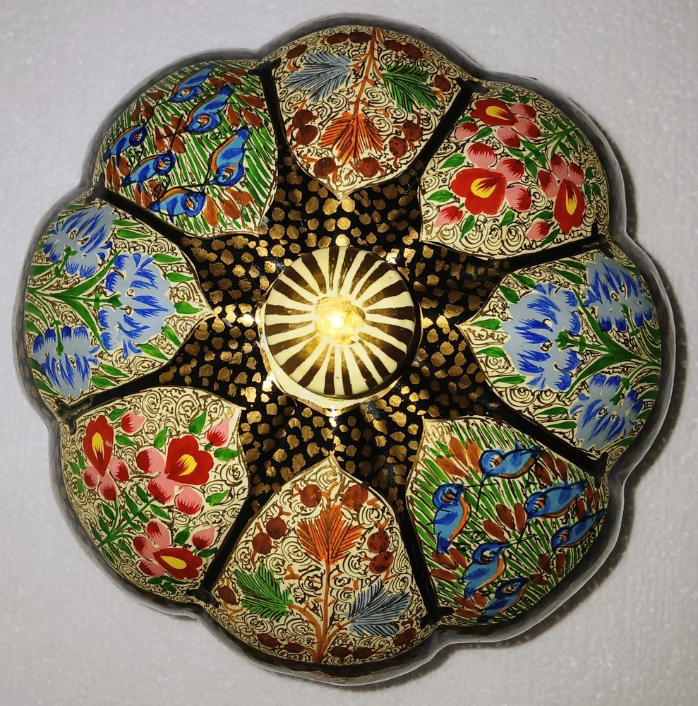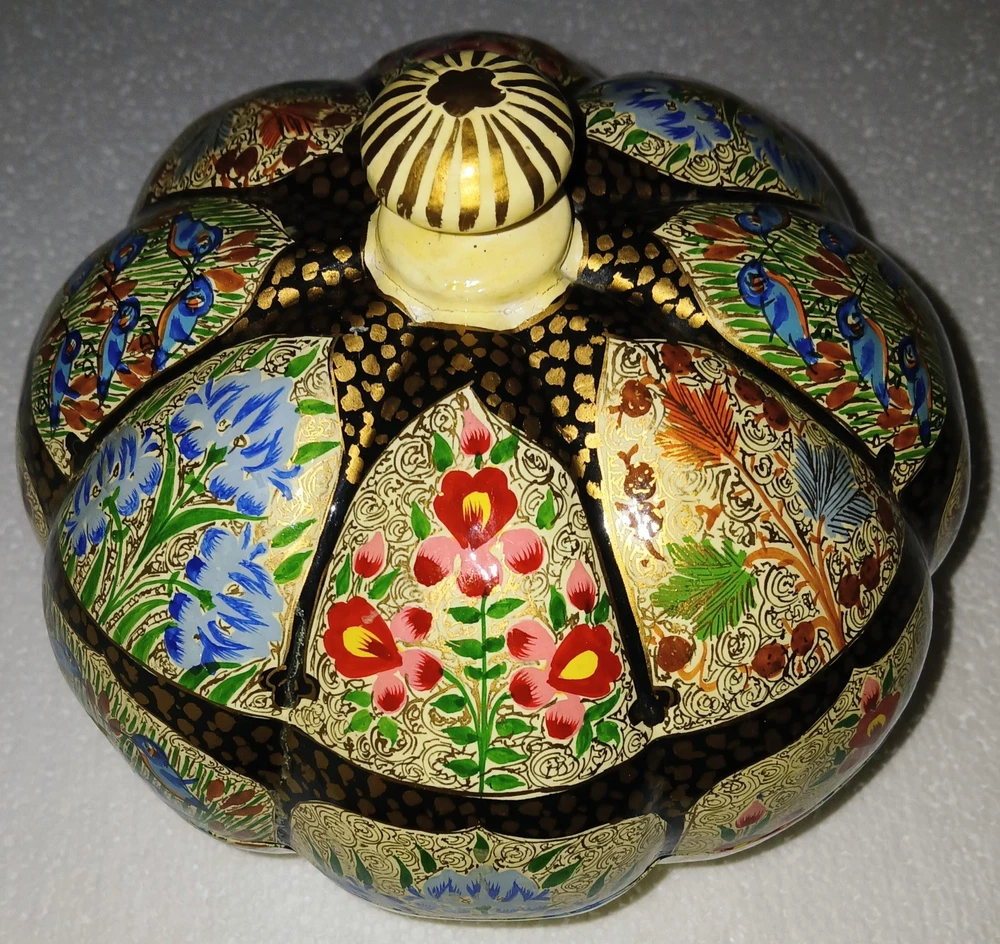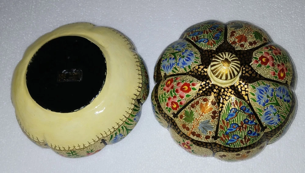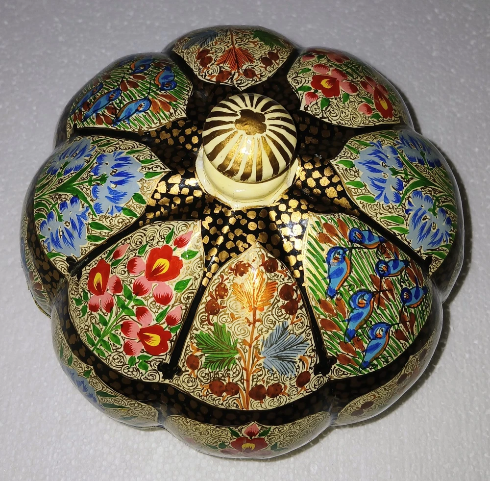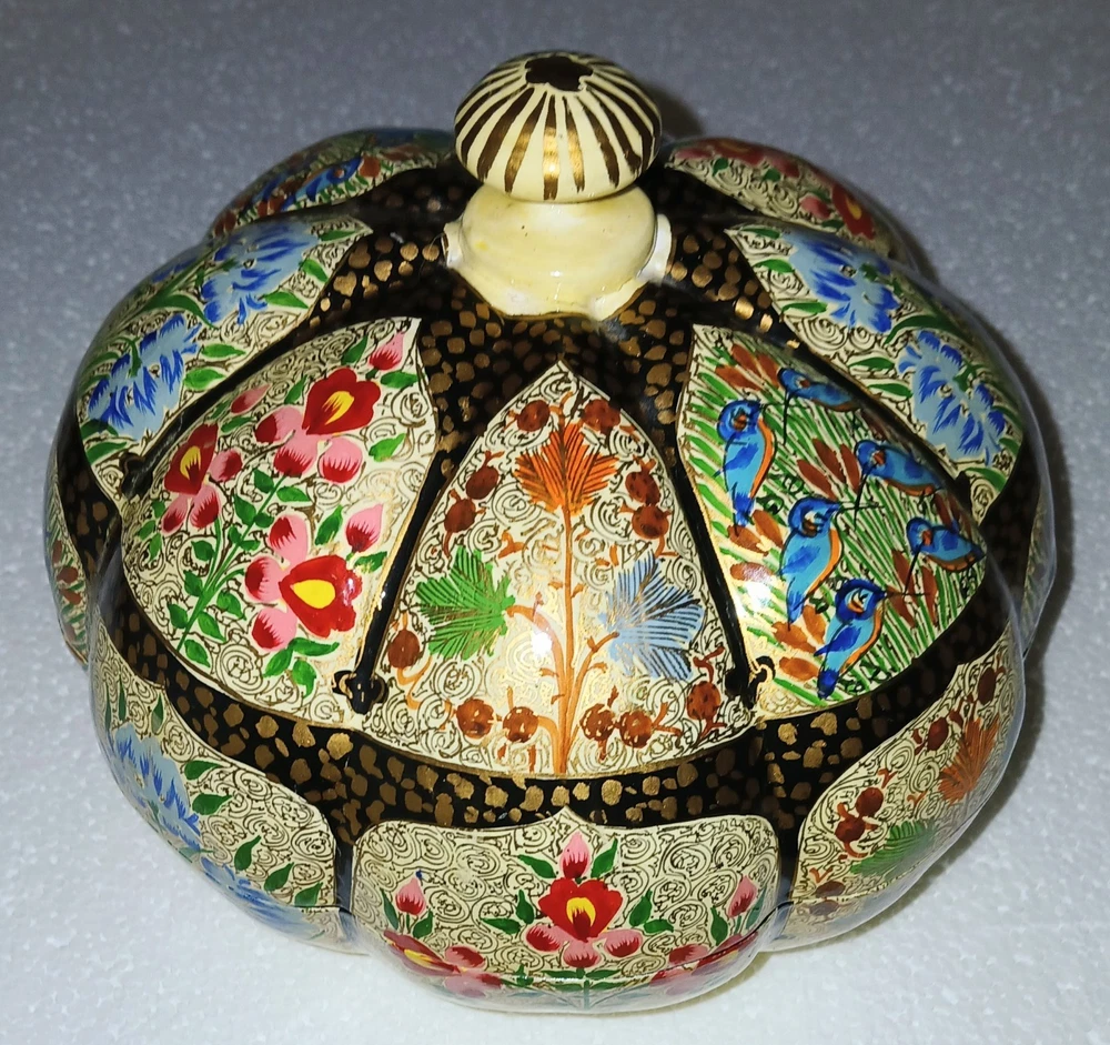Room: Any Room Theme: Art Item Length: 6-1/4" Type: Trinket Box Brand: Kashmir Country/Region of Manufacture: India Handmade: Yes Features: Hand Painted Seller Notes: “Excellent used condition” Size: Large Finish: Lacquered Item Width: 6-1/4" Original/Reproduction: Original Collection: Keepsake Boxes Material: Papier Mache Number in Pack: 1 Style: Far Eastern Subject: Flowers and birds Color: Multicolor Pattern: Flora and fauna Item Height: 6" Closure Type: Lid Occasion: All Occasions Shape: Round
