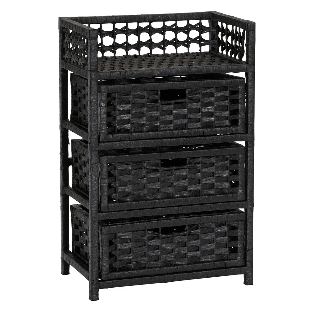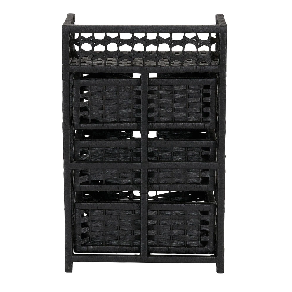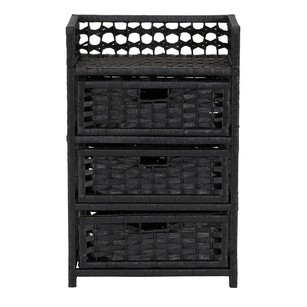 Tuck these compact 3-Drawer Chests into the nooks and crannies of your home and make the most of every cranny. Hand-woven, these paper rope chests are sturdy and beautiful, with a winsome charm that turns any space into an instant haven. Keep in the bathroom for linens, towels, and extra rolls of paper; place a bowl on the open top shelf filled with washcloths and soaps for a stylish and practical flourish. Place in the hall or closet to scarves and gloves, magazines, or anything else! Bring a little understated elegance to your world with these chic black chests and keep it all in order. Hand-woven, paper rope 3-Drawer Unit. Open top shelf. Finished with a chic black stain and protective coating. Humidity tested. Dimensions: 26. 4" H x 16. 9" W x 10. 6" D. Designer styled 3 drawer chest for use in any room Paper rope wicker Sturdy wood frame Black color Measures 26. 38-Inch high by 10. 63-Inch deep by 16. 93-Inch wide
