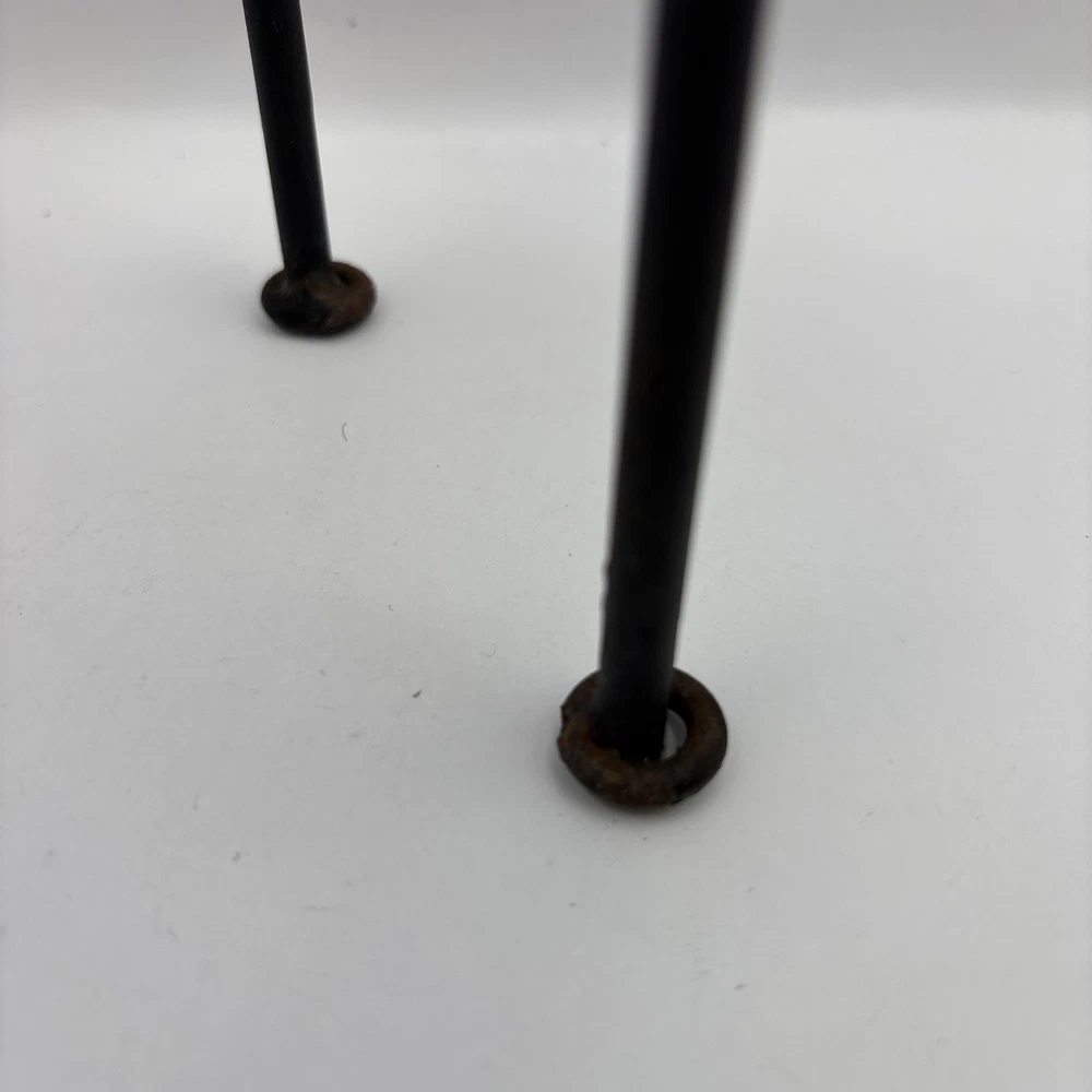 This is a blue and clear handblown tea light holder on a black metal base. 8 inches tall. Some rust on bottom of base legs as shown. I demonstrated using a battery powered tea light~not included. PP