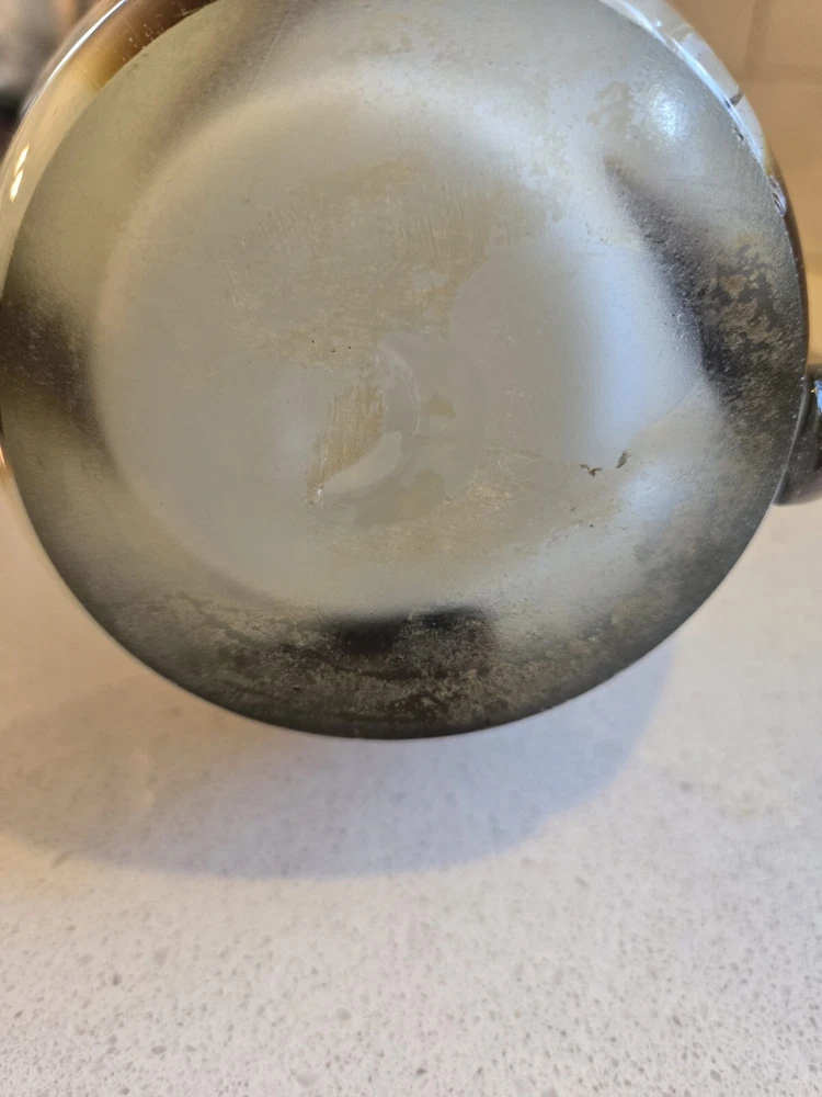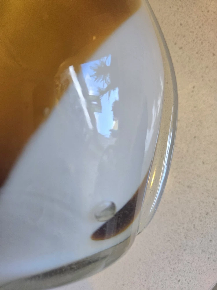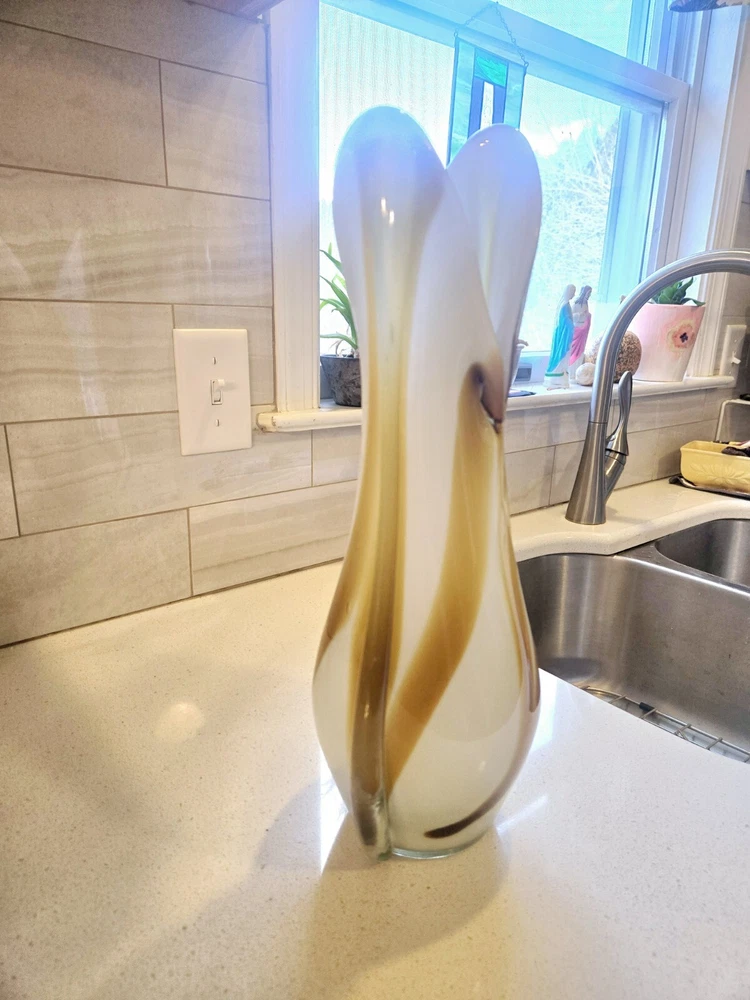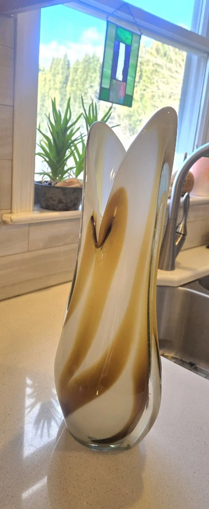 Unique swung-style glass vase with amber and white streaks. This vase is tall at a little over 15" and sleek with its curves and rounded bottom. It's heavy - around 4 lbs and the glass is thick. There is clear glass that juts out on the sides to add extra interest. Multiple bubbles can be found as well, which I believe adds character. The amber gradually lightens and darkens throughout the wide streaks. This vase begs to be put in just the right place in just the right home.
