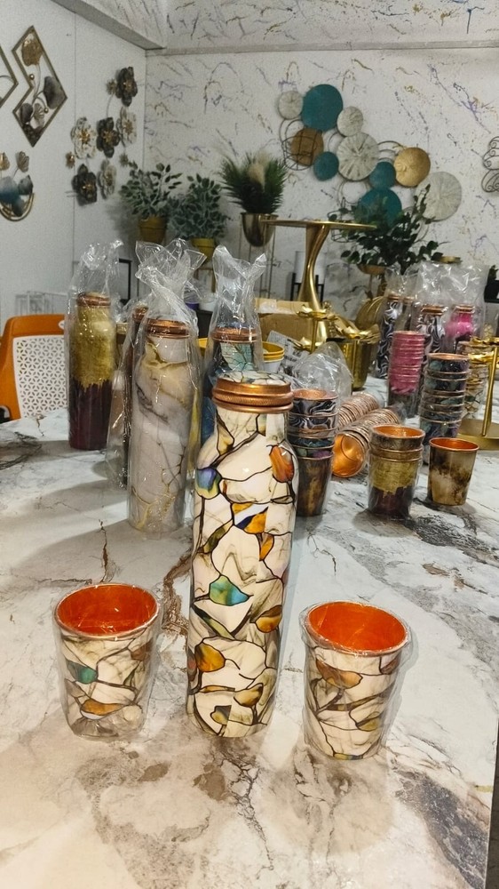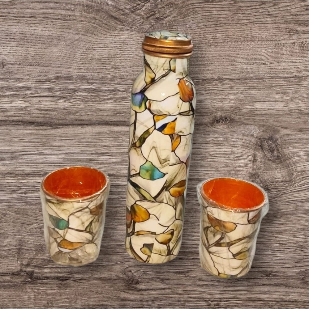 Stay healthy and hydrated in style with this premium handcrafted copper water bottle and tumbler set. Decorated with colorful floral and paisley motifs, this set combines traditional Indian craftsmanship with functional wellness. Copper vessels are known in Ayurveda for their health benefits, including improved digestion, joint health, and enhanced immunity. Set Includes: 1 x Copper Water Bottle (1 Liter capacity) 2 x Matching Copper Tumblers (300ml each) 1 x Leak-Proof Screw-On Lid Features: Pure copper interior for maximum health benefits Vibrant enamel-coated exterior with ethnic floral designs Durable, leak-proof, and eco-conscious Easy to clean (hand wash recommended) Ideal as a gift or for daily health-conscious use