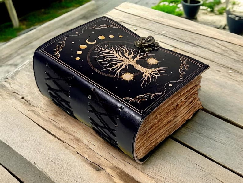 A Blank Spell Leather Grimoire Journal, Book of Shadows, printed with the Tree of Life is a handcrafted journal designed for those who wish to record their magical practices, rituals, spells, dreams, or spiritual reflections. The Tree of Life, a symbol found in various cultures, represents interconnectedness, growth, and the cycle of life. Key Features: Material : Crafted from genuine leather, often embossed with intricate designs. Design : The cover typically features an embossed or printed Tree of Life motif, symbolizing wisdom, strength, and the connection between all forms of creation. Closure : Equipped with a clasp or latch to securely close the journal. Pages : Contains unlined pages, allowing for freeform writing, sketching, or diagramming. Size : Dimensions can vary, but a common size is approximately 12.5 x 17.5 x 3 cm. Paper : Made from recycled cotton, providing a textured finish suitable for various writing instruments. Symbolism of the Tree of Life: In many traditions, the Tree of Life is a symbol of growth, strength, and a connection between all life forms. Its roots delve deep into the earth, its trunk stands firm, and its branches reach towards the heavens, embodying the interconnectedness of all existence. Availability in multiple size’s - 6x4 inches 7x5 inches 8x6 inches 10x7 inches 13x10 inches 200 pages is also available in this journal perfect gifts for him and her ● The witchcraft supplies journal is printed with a special “ Tree of life ” which helps to reveal inner truth within yourself and encourage self-awareness and self expression. We have taken extra to make sure that the emboss is perfect in every piece. ● Sketch, Doodle, Write on your Leather Blank Spell Journal with a Calligraphy Pen Fountain Pen, Brush Pen, Ball Pen, Acrylic Colours, Watercolor and many more. We guarantee no bleed through. ● Can be used as a notepad, journal, writing notebook, sketch book. 1.25 inch thickness, easy for handwriting, drawing or sketching and compact for carrying in your bag. Ideal for alternative ● Artist Sketchbooks, Photo Album, Traveling Notes, Business Executive, Logbook, Poetry Work, Journalists, Food Planner, Instagram Scrapbook and Bible Journaling. ● Best Gift For Your Companion: A Journal Is Like A Trusted Friend. You Can Use It To Solve Queries, Get Inventive, Or Record Valuable Memories For Them To Last Forever Or You Can Just Use It As A Gift For Your Wife, Son, Or A Daughter Or For Some Enthusiastic Writer In Your Family. Even For Looking For A Miraculous Spell Book Or A D&D Gamer Looking For His Quest Book. ● Perfectly Sized For Multi-Purpose Use: Length 5", Width 1", Height 7" Inches, This Easy To Carry Personal Diary Is Perfect To Use As A Health Journal, Sketchbook, And Poetry Journal. It’S An Ideal Journal Which Records Your Daily Thoughts And Life Lists.