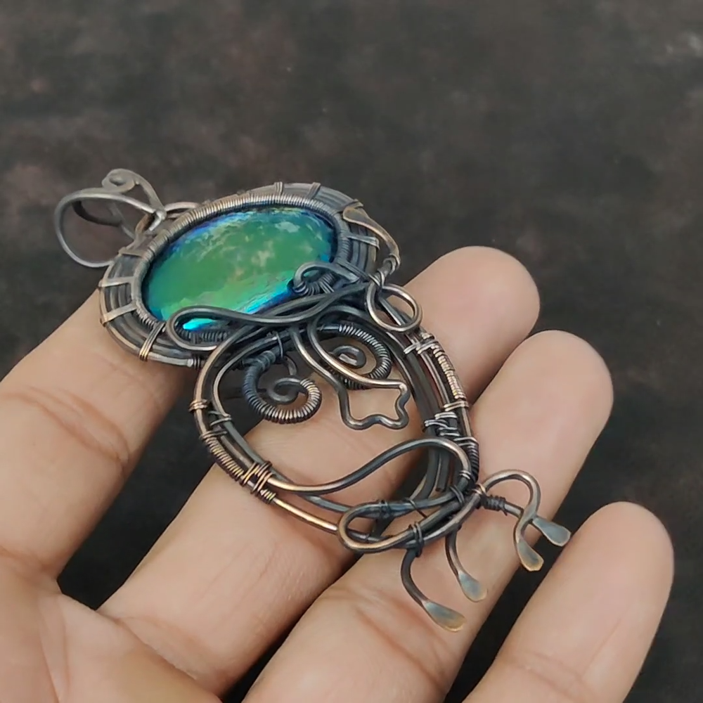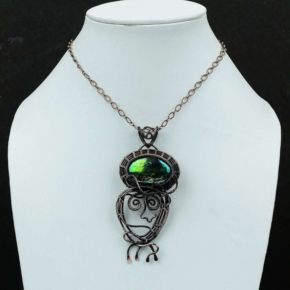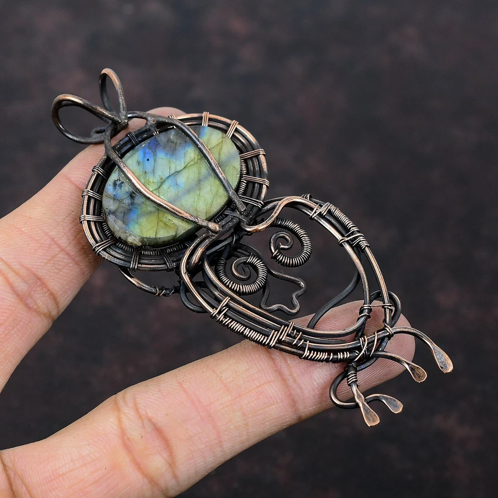 Note : Due to the natural formation of this gemstone. Slight variation in design and color are to be expected. Welcome to Silver Creation Handmade Pendant, Wire Wrapped Pendant, Wire Wrapped Jewelry, Copper Pendant, Copper Wire Pendant, Wrapped Jewelry, Wire Wrap Pendant, Wire Wrap Jewelry SKU : VFWP-1969 Gemstone : Mystic Fire Labradorite Stone Shape : Oval Metal Purity : Unknown Copper Length : 95 Millimetres Width : 44 Millimetres Copper has been used for jewelry making for thousands of years, dating back to ancient civilizations such as the Egyptians, Romans, and Aztecs. Copper was valued for its beauty, versatility, and durability, and was often used to make everything from jewelry and coins to cookware and tools. In addition to its historical significance, copper jewelry also offers several benefits. Copper is a natural conductor of heat and electricity, which makes it ideal for energy healing and therapeutic purposes. Wearing copper jewelry is believed to have various health benefits, such as improving circulation, reducing inflammation, and boosting the immune system. Some people also believe that copper jewelry has the ability to balance energy and improve mood. For Mother's Day Gift For Father's Day Gift For Promise For Valentine' Day For Halloween Party For Christmas Day Gift For New Year Party For Mom For Her If you can't find the information you need or need some advice for your design? Feel free to contact us. We are fast to reply :) All our work is made by hand with Love and Care in our workshop Thank you so much for visiting and hope you enjoy shopping with us Silvercreations is committed to delivering the best quality sterling silver jewelry to customers. As a handmade jewelry manufacturer, we offer an extensive selection of copper gemstone jewelry that showcases the brilliance of our craftsmanship. We are an experienced handmade jewelry supplier with expertise in embellishing gemstones to suit every style. We offer you the liberty to create your jewelry ensemble with sparkling, earthy, and pure gemstones. Our Talented artisans masterfully handcraft each piece of jewelry you see here. Our pieces are made with genuine gemstones.