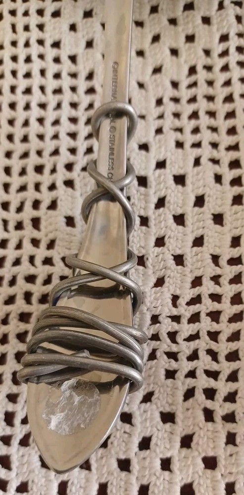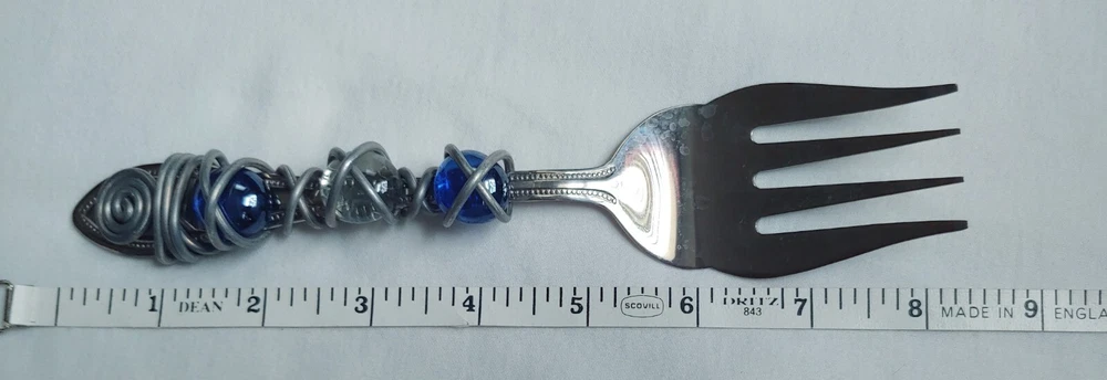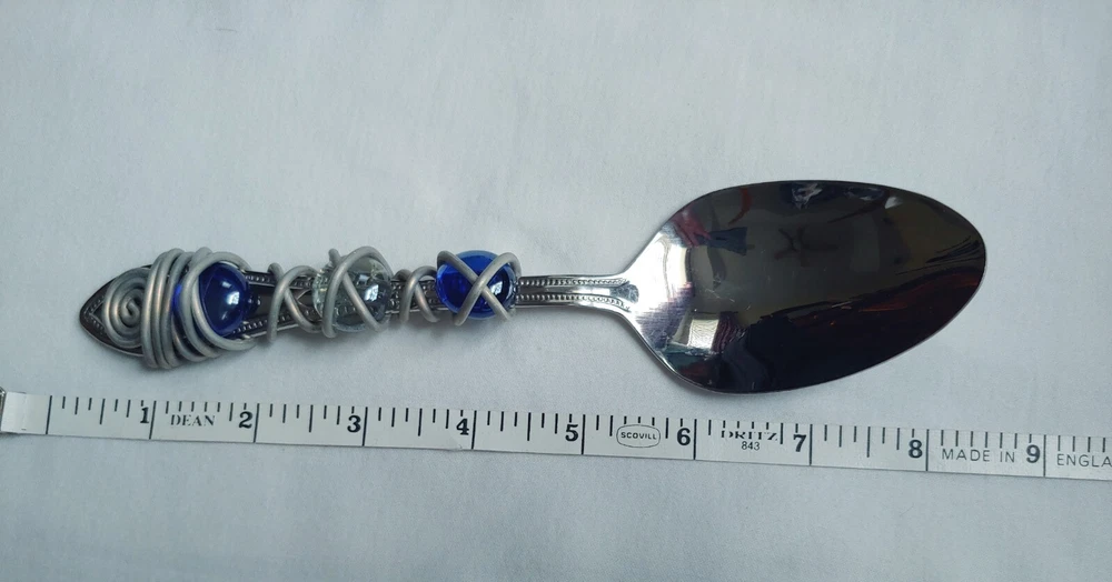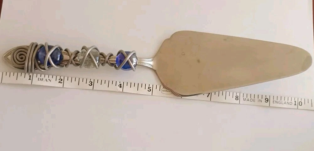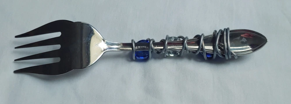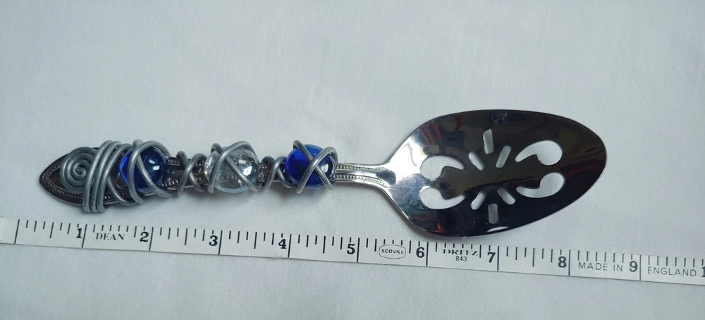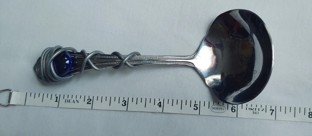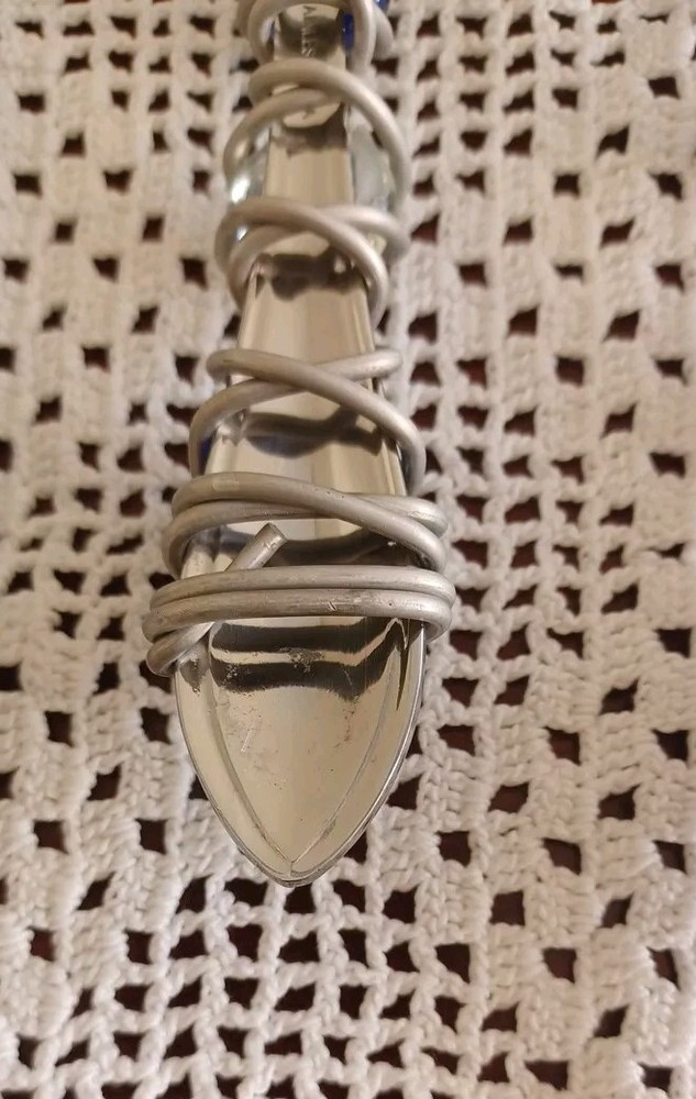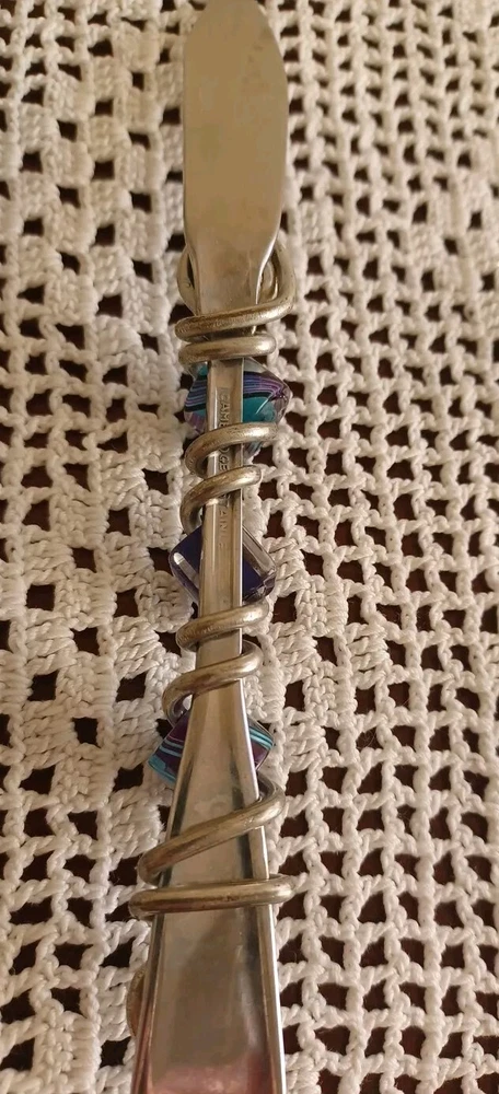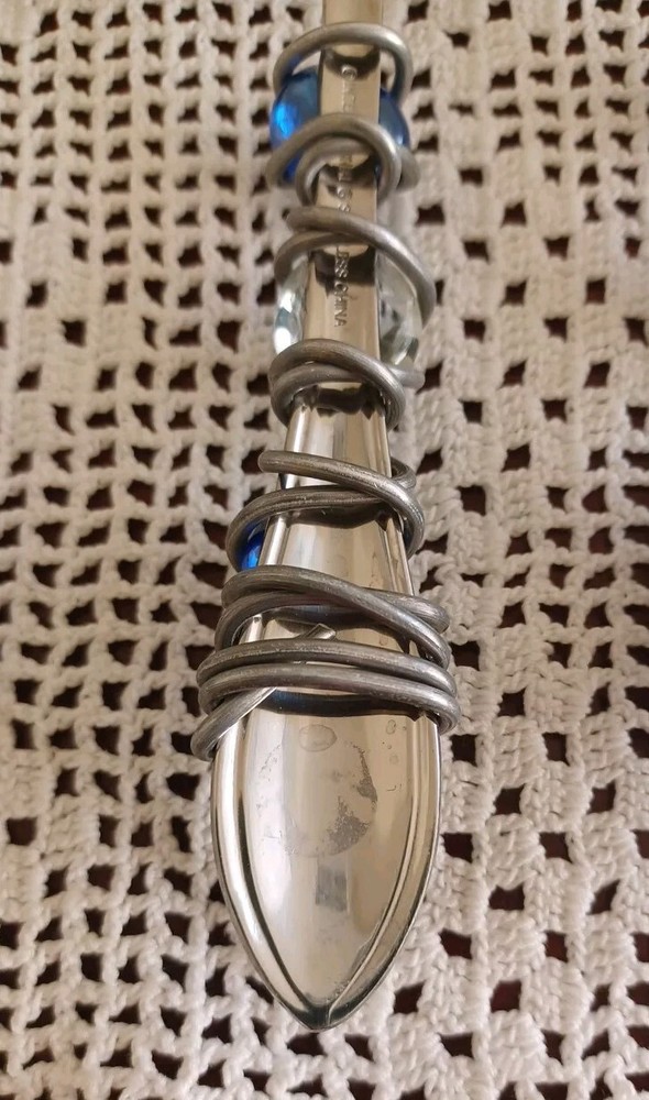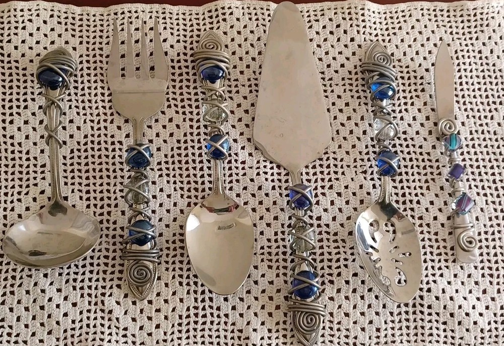 Set Of 5 Flatware Serving Pcs plus a spreader. Handcrafted Wire with Cobalt Blue Glass Bead Detailing Beautiful unique flatware set. Very little usage, but some scratching due to storage. Sticker residue is still present on a couple of pieces. These look very similar to Laura Moore designs, although the artisan can not be confirmed. Please review pictures for measurements and details and reach out with questions. Great for dinner parties, holidays, and special occasions to WOW your guests.
