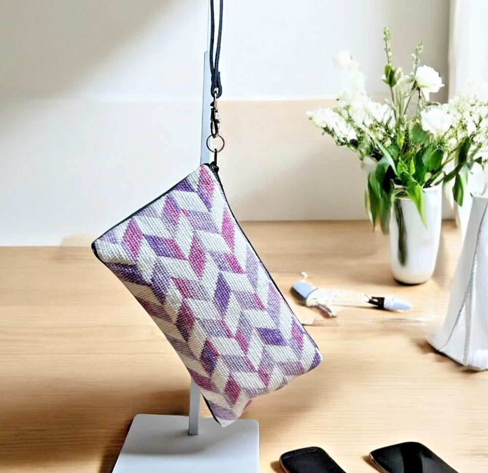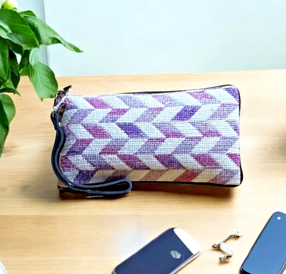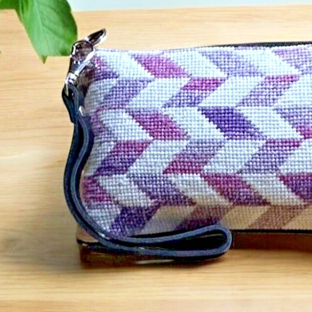 This handmade needlepoint cosmetic bag is a versatile accessory that can be used as a wristlet purse or pencil case. The variegated purple pattern and graphic design make it a unique addition to any collection. The bag is 8 3/4" x 4 1/2" in size and features faux leather backing and lining. The cosmetic bag is perfect for those who enjoy needlecrafts and want to put their skills to use. Its multiple uses make it a practical item that can be enjoyed for everyday use. Whether you're looking for a bag to carry your makeup or a pencil case, this handmade needlepoint cosmetic bag is sure to impress.