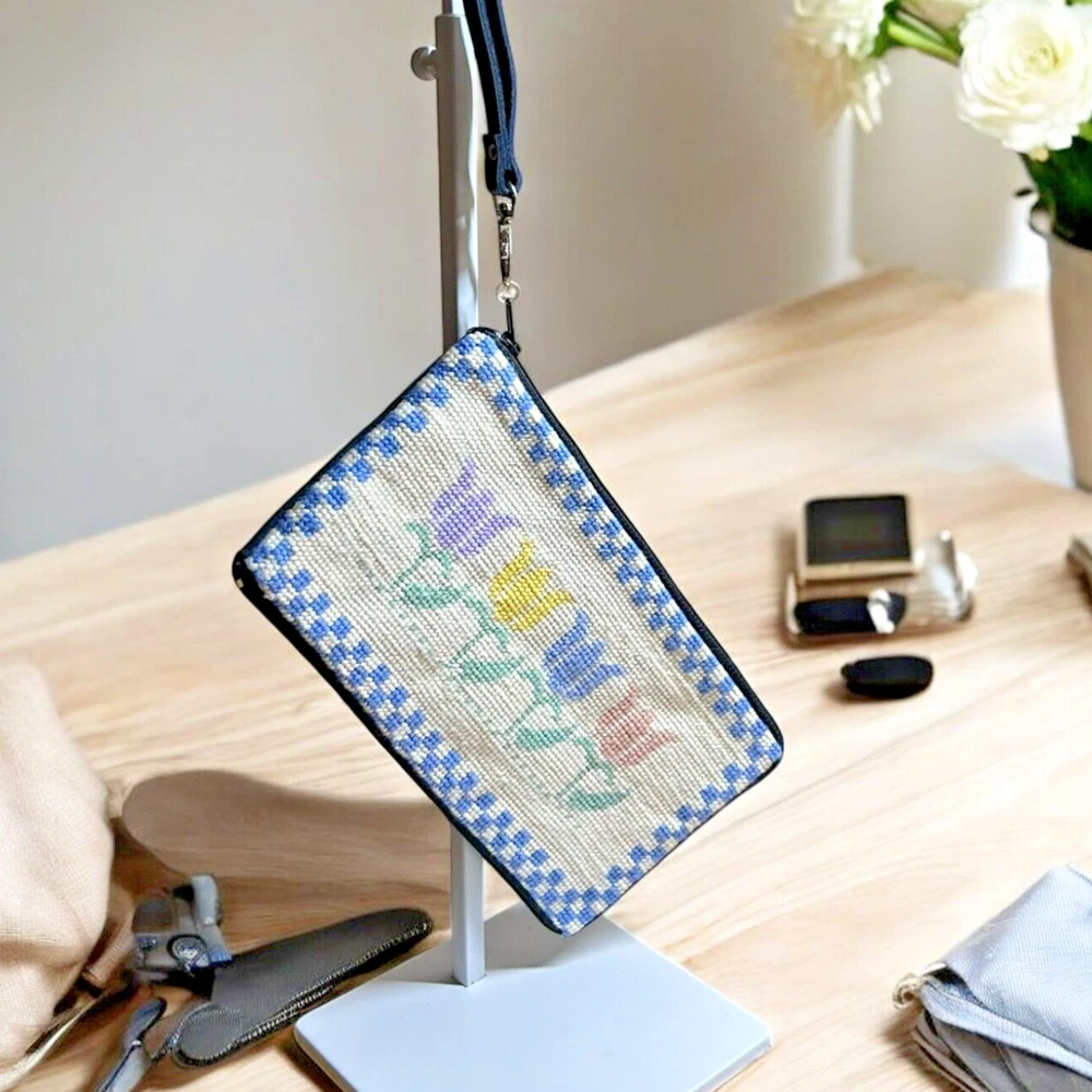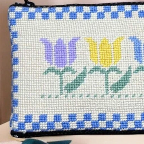 Type: Cosmetic Bag Brand: Handmade Features: Faux Leather Backing, Lined Feature: 6" Wristlet Uses: Purse, Makeup Bag, Pencil Case Pattern: Floral Model: Cosmetic Bag Dimensions: 8 3/4" x 4 1/2" Colors: Multi Colored Type of Embroidery: Needlepoint