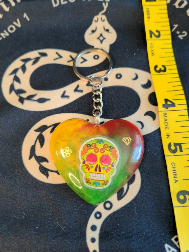 This handmade keychain is a unique and colorful addition to your accessory collection. The skull character is inspired by the Day of the Dead theme and is made of resin material. Measuring 4 inches in length and 2 inches in width, it is a perfect size for your keys or to clip onto your bag. The Tye-dye multicolor pattern adds a fun touch to the keychain, making it a great accessory for Halloween or any day. It is a brand new item without tags and is perfect for women who love to add a bit of personality to their style.