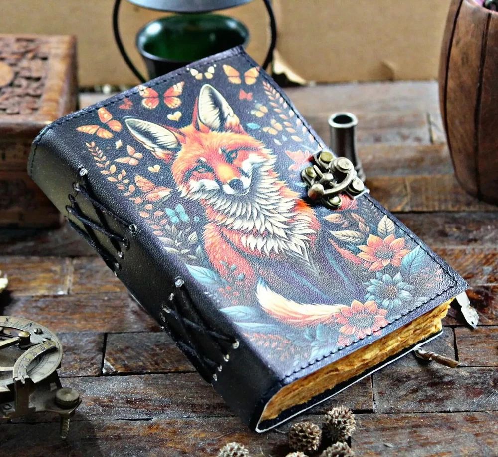 This handcrafted leather fox journal is a luxurious and limited edition notebook perfect for writing and sketching. With a rustic leather cover and personalized touches, this journal is ideal for those who appreciate high-quality craftsmanship. Made in India, this unique notebook is sure to make a special gift for anyone who enjoys creating their own masterpieces. Vintage lock closure • Genuine buffalo leather • Vintage deckle edge old paper • handmade rustic cotton paper • 100 Sheet (200 pages both side) Elevate your creative journey with our meticulously handcrafted Fox Leather Journal. Crafted with care and adorned with a stunning fox design, this rustic notebook is your perfect canvas for writing, sketching, or documenting your adventures. Each journal is a unique work of art, lovingly made from premium leather. Its acid-free pages provide an inviting surface for your thoughts, stories, and artwork. Whether you're an artist, writer, or nature enthusiast, this journal complements your creativity. The fox, a symbol of cleverness and adaptability, adorns the cover, inspiring you on your artistic endeavors. Embrace the charm of this Fox Leather Journal and let your creativity roam free. - Leather journal witchcraft book of shadows notebook is made with 200 pages of Antique Paper which looks like it was pulled from history. You will fall in love with the the antique handmade cotton paper which is unique to our Vintage Journal Notebook. ● The vintage clasp lock will keep all your valuable writing locked inside.Sturdy hand stitched binding to make sure that no paper comes out loose from your spell notebook. ● The witchcraft supplies journal is printed with a special seven stone called “Chakra healing” which helps to reveal inner truth within yourself and encourage self-awareness and self expression. We have taken extra to make sure that the emboss is perfect in every piece. ● Sketch, Doodle, Write on your Leather Blank Spell Journal with a Calligraphy Pen Fountain Pen, Brush Pen, Ball Pen, Acrylic Colours, Watercolor and many more. We guarantee no bleed through. ● Can be used as a notepad, journal, writing notebook, sketch book. 1.25 inch thickness, easy for handwriting, drawing or sketching and compact for carrying in your bag. Ideal for alternative ● Artist Sketchbooks, Photo Album, Traveling Notes, Business Executive, Logbook, Poetry Work, Journalists, Food Planner, Instagram Scrapbook and Bible Journaling. ● Best Gift For Your Companion: A Journal Is Like A Trusted Friend. You Can Use It To Solve Queries, Get Inventive, Or Record Valuable Memories For Them To Last Forever Or You Can Just Use It As A Gift For Your Wife, Son, Or A Daughter Or For Some Enthusiastic Writer In Your Family. Even For Looking For A Miraculous Spell Book Or A D&D Gamer Looking For His Quest Book. ● Perfectly Sized For Multi-Purpose Use: Length 5", Width 1", Height 7" Inches, This Easy To Carry Personal Diary Is Perfect To Use As A Health Journal, Sketchbook, And Poetry Journal. It’S An Ideal Journal Which Records Your Daily Thoughts And Life Lists. And Also Good For Designing, Doodling, Or Calligraphy Of Your Choice. Handcrafted Leather Fox Journal Rustic Notebook for Writing & Sketching Gift for him her, Blank spell Book of Shadows, Handcrafted best gift ignore. Grimoire journal leather notebook book shadow leather sketchbook leather journal junk journal witchcraft journal spell book book of shadows sketch book leather bound journal black journal fox journal