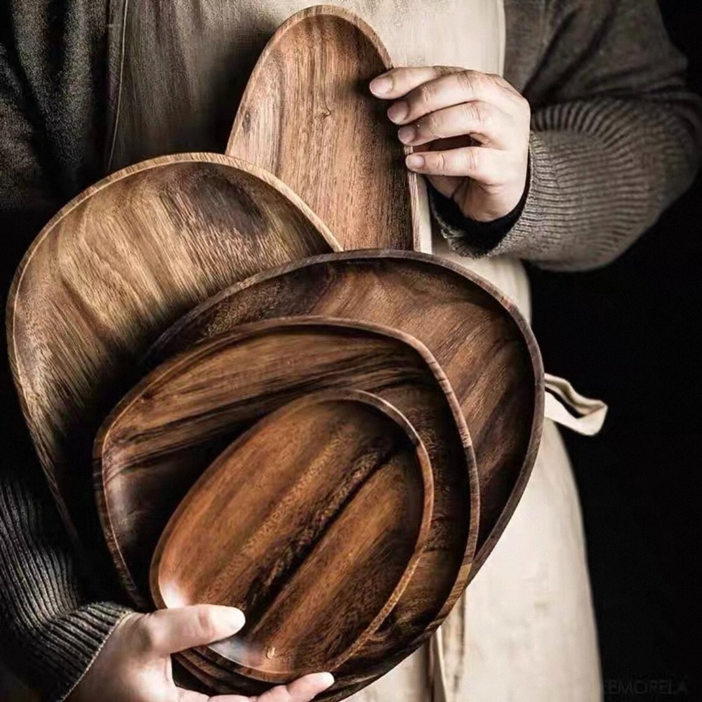 Bring timeless elegance and natural warmth to your table with these handcrafted wood plates. Made from solid, richly grained hardwood, each plate features a unique pattern and smooth finish. The organic oval shape and deep brown tones make them perfect for serving breakfast, desserts, bread, sushi, or charcuterie with a minimalist, Scandinavian or Japanese aesthetic. Features: Material: 100% natural hardwood Finish: Food-safe, smooth, and polished Style: Rustic / Scandinavian / Wabi-Sabi Shape: Organic oval (each piece is slightly unique) Use: Ideal for serving snacks, pastries, fruit, or decor Easy to clean and durable for daily use Size Options: Large – 11.8"x4.5" Small Available in different listing (Small – 5.1"x6.29") Care Instructions: Hand wash with mild soap. Do not soak or place in dishwasher. Occasionally treat with mineral oil to maintain natural luster.