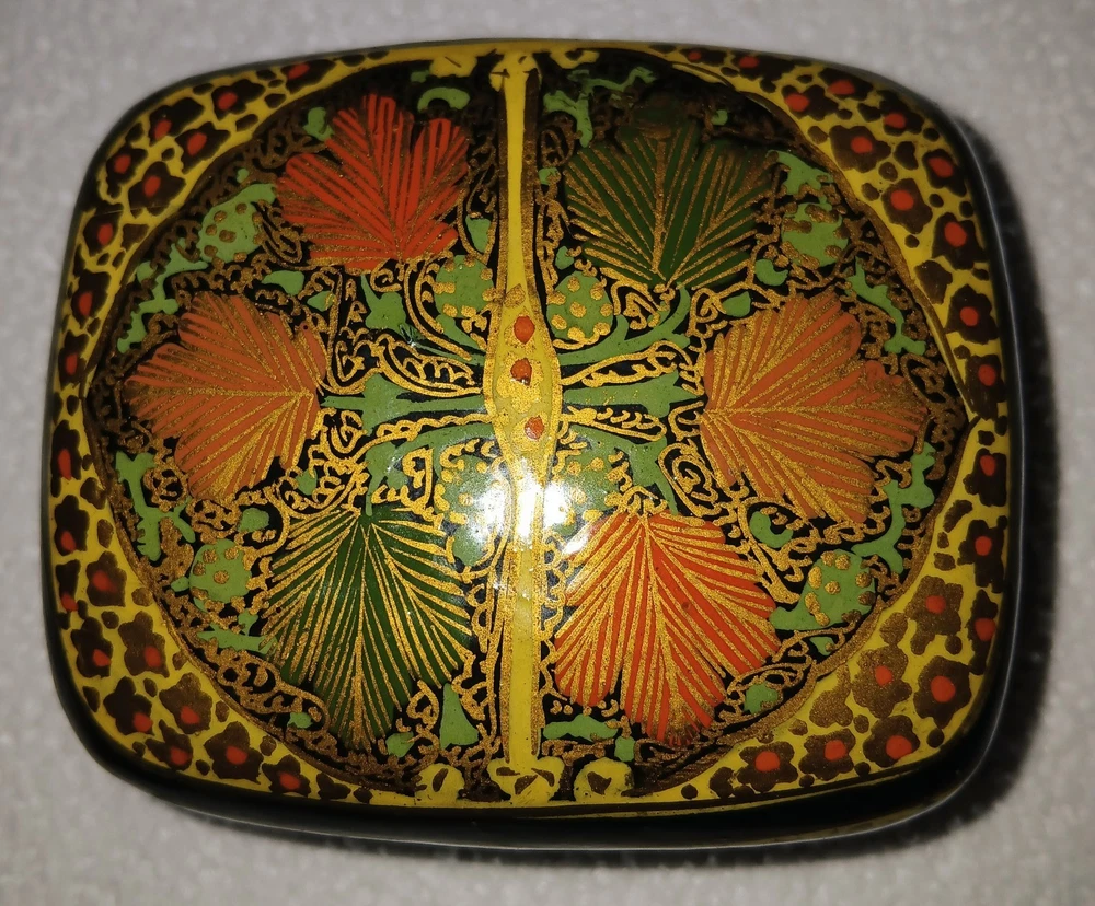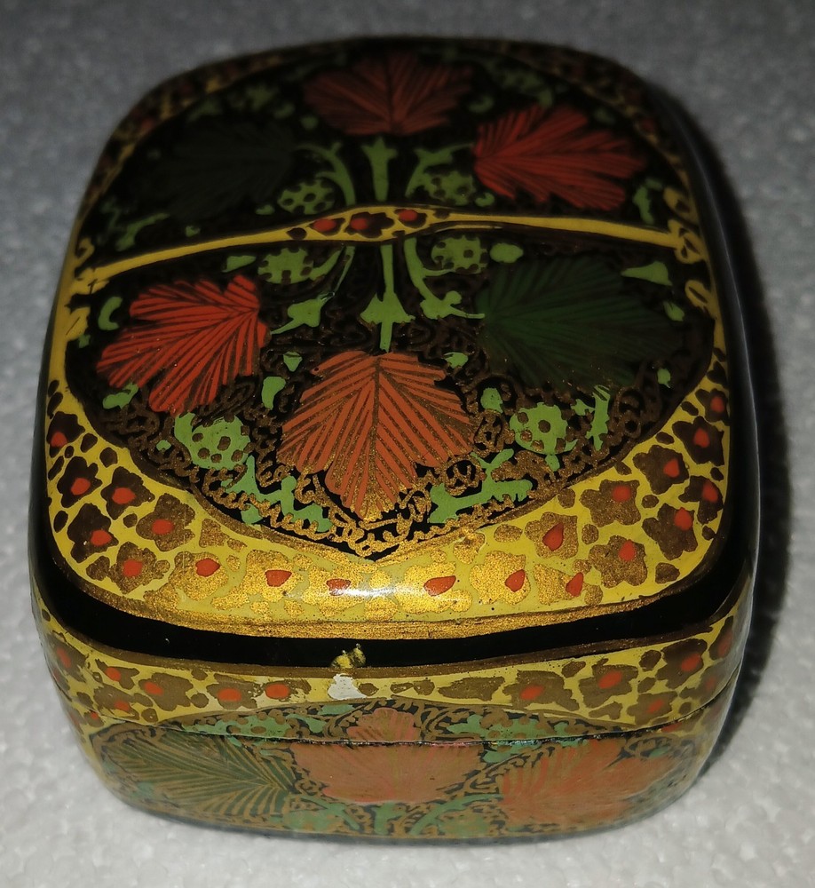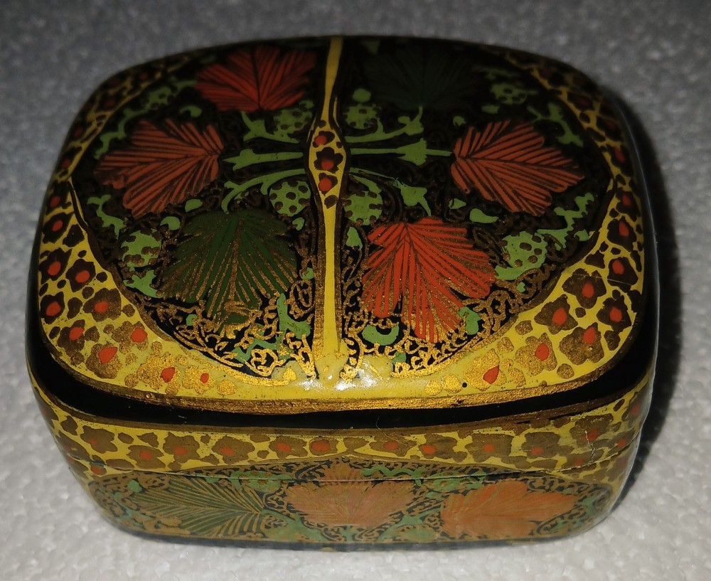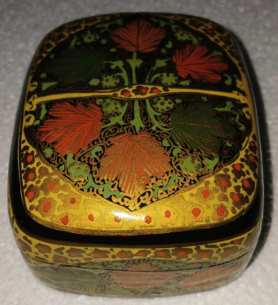 KASHMIR INDIA TRINKET BOX 1.) PLEASE CHECK THE EXPECTED DELIVERY DATES 2.) PLEASE BE PATIENT, there's a longer handling time on my auctions, but I try to ship faster... I work around chemo, dialysis and I'm mostly paralyzed so I rely on family members in their spare time for all of my shipping+ THERE IS NO WHITE ON THIS PIECE, ANY WHIT E IS GLARE 3.) KASHMIR INDIA LIDDED TRINKET BOX 4.) MEASURES 3-1/4" X 2-3/4" X 1-3/4" TALL 5.) HAND PAINTED AND LACQUERED 6.) EXCELLENT CONDITION WITH BRIGHT VIBRANT COLORS 7.) I DO COMBINE SHIPPING AND ANY OVERPAID AMOUNT IS REFUNDED ***