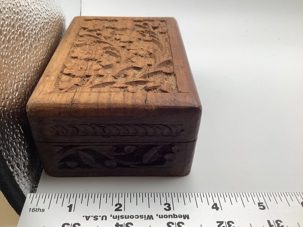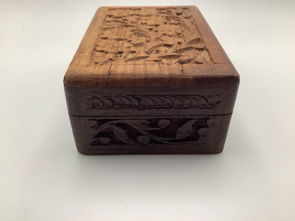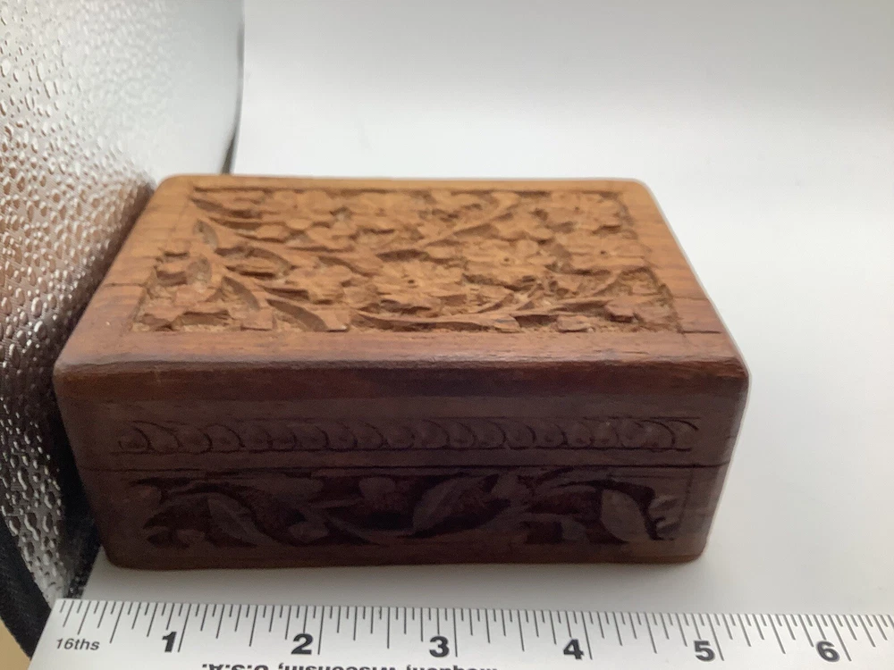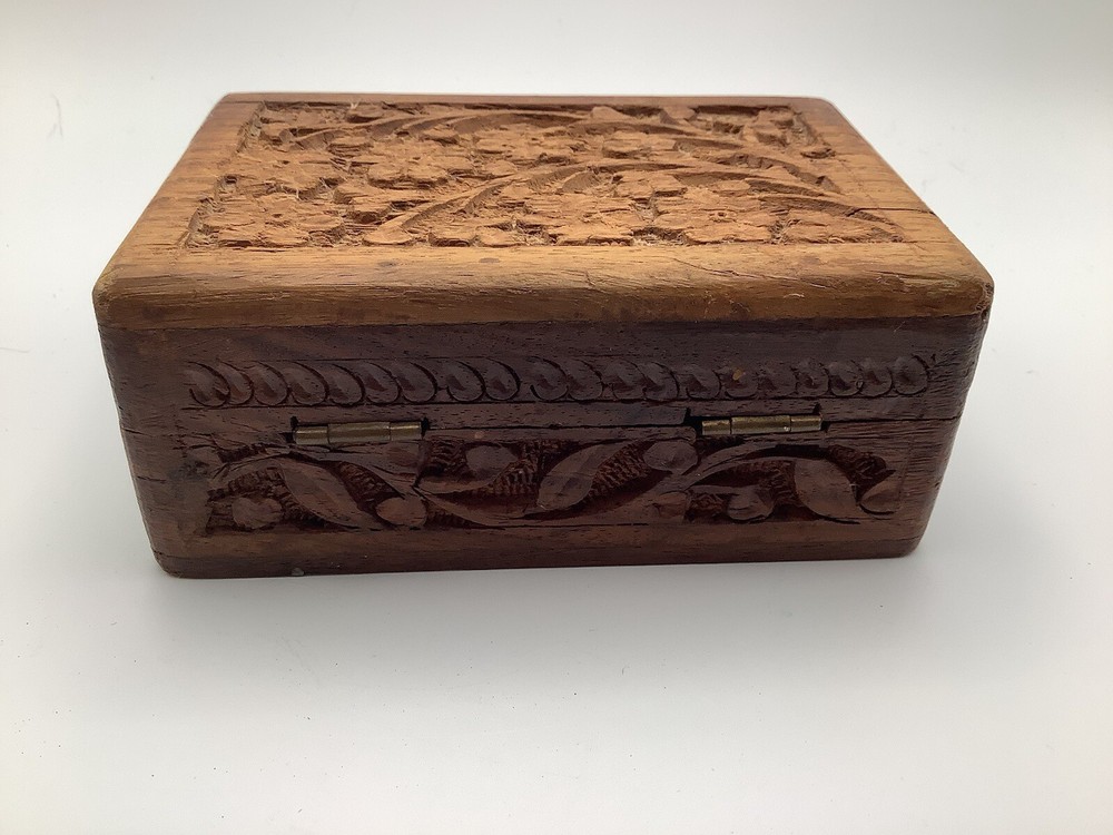 This vintage Carved Wooden Jewelry Trinket Box from India features a beautiful flower pattern and is lined with velvet. With intricate carvings and a medium size, this unique piece is perfect for storing small treasures and jewelry. Made with high-quality wood and velvet materials, this trinket box is ideal for any room and all occasions. The late 20th century design and handmade craftsmanship add to its charm, making it a lovely addition to any collection of decorative collectibles.