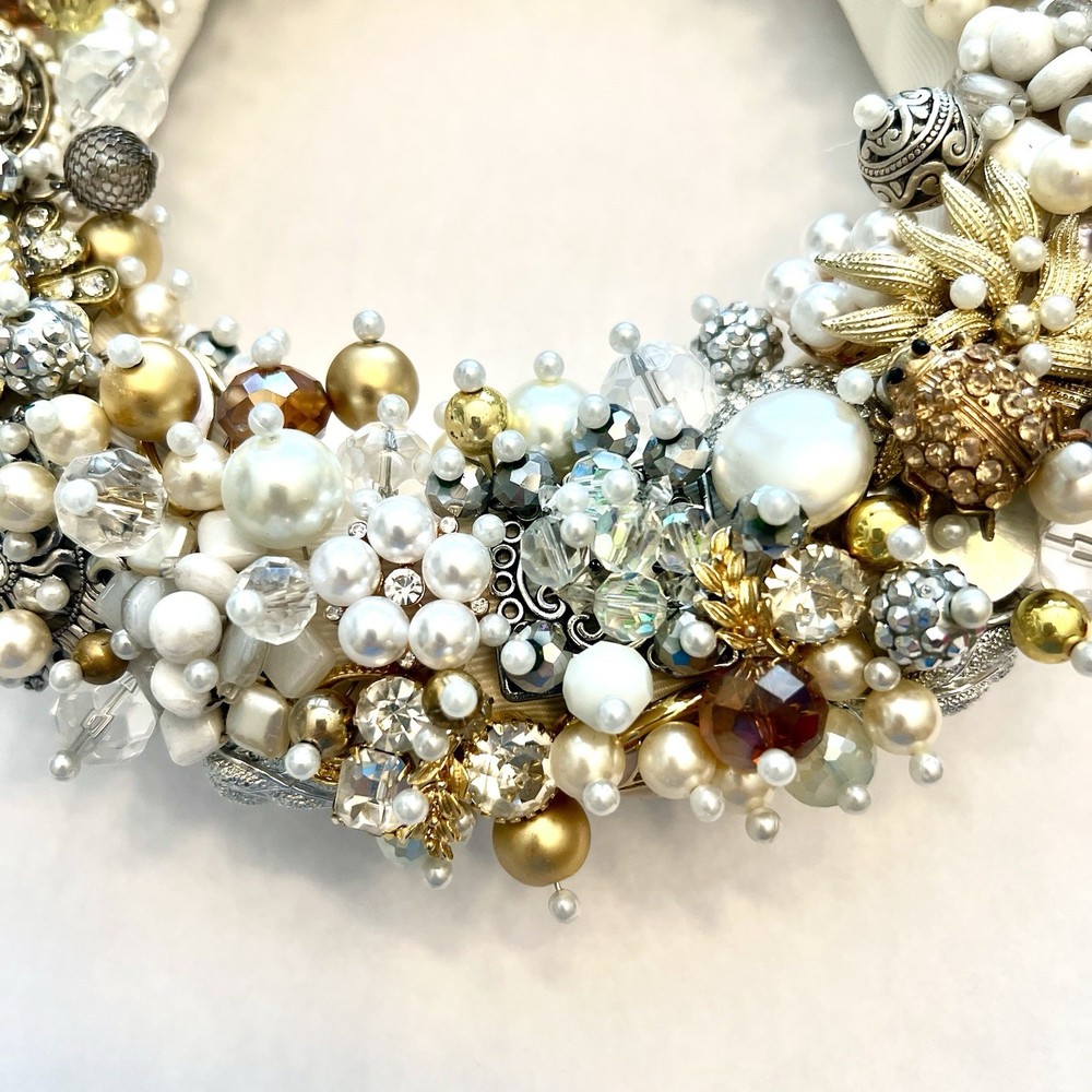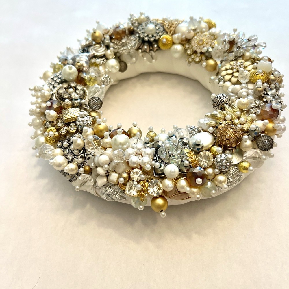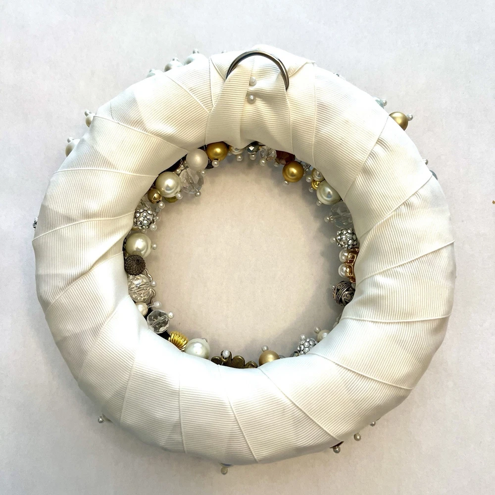 This hand-crafted decorative wreath hanger is a stunning addition to your holiday or everyday decor. Featuring a 9" round design with white, gold, and silver beads and rhinestones, this door or wall decoration is perfect for all occasions. Made in the United States, this wreath hanger adds a touch of elegance to your home with its intricate detailing and unique design.