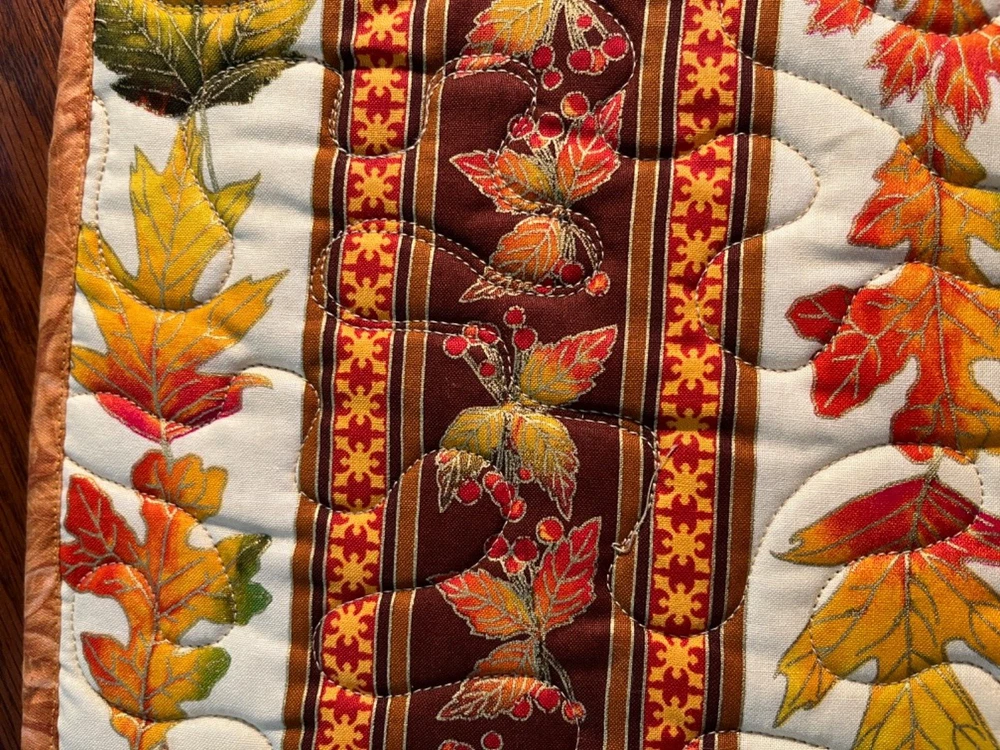 'Looking for a unique gift - add a candle or maybe a special vase and you have a wonderful gift! Perfect for Fall or have it for your Thanksgiving table! Makes great hostess gifts - especially for that Thanksgiving dinner. Enjoy the magnificence of fall with these colors and autumn leaves! NEW! - for Fall 2024 (1) Table Runner - Fall Print 9 by 30 inches (Please note the size.) Back: Brown Machine quilted. Center: Fall leaves in rust, golds on brown background Border: - Cream background with fall colored leaves, orange gold highlights HAND MADE TABLE RUNNERS SELL FOR 25.00 TO $35.00 AT MY LOCAL QUILT SHOP. When buying one, two, three of my auctions pay only one shipping charge - flat rate envelope. When buying four to eight pay one shipping charge - Medium flat rate.