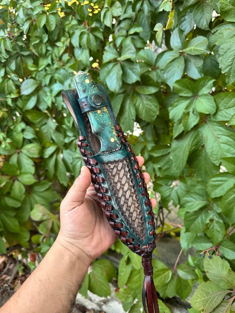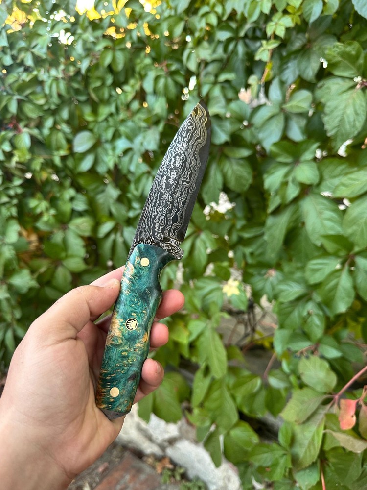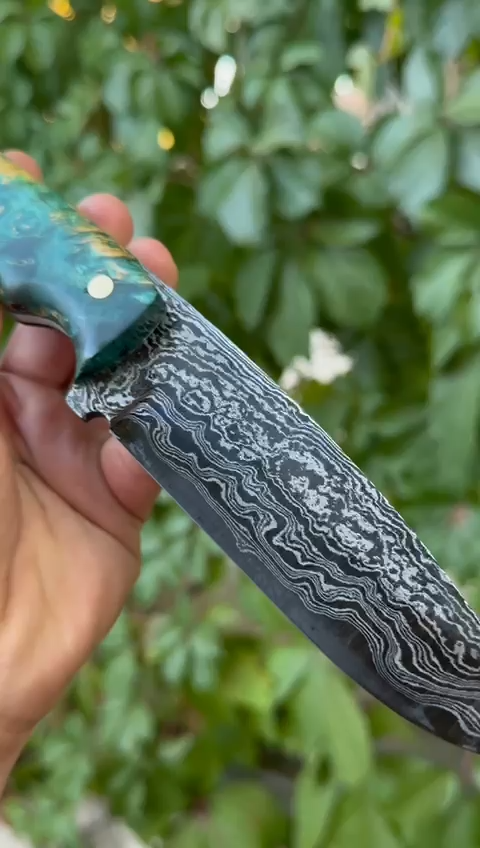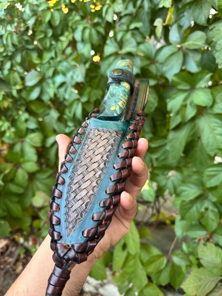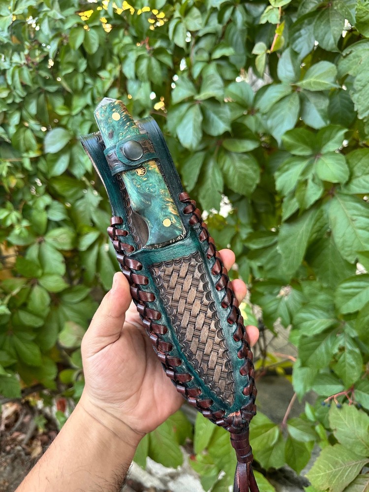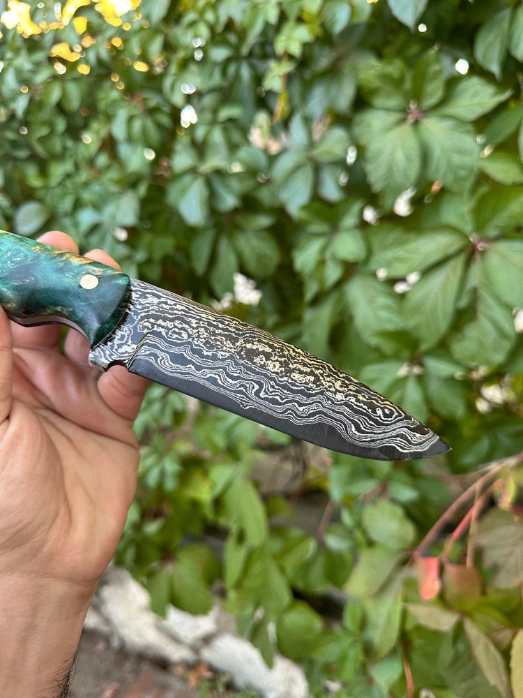 Damascus hunting knife, completely hand-forged with thousands of hammer blows! The knife you purchase, made of Damascus steel with its magnificent and unique patterns, will be unique to you! Its stabilized maple wood handle and its magnificent leather sheath, entirely handcrafted, make this knife even more unique! Hurry up to get one of these limited edition knives. 🔪 FEATURES 🔪 Steel:Carbon Damascus Steel Steel Hardness: 60 HRC Blade: 5 inches(approx.) Total Lenght: 10 inches (approx.) Sheath: Custom Handmade Leather Sheath Areas of Use: Whether you're camping, hunting, or collecting, this knife offers both function and art.