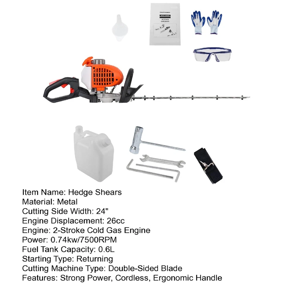 | | | | | | Handheld 26CC Gas Powered & Cordless & 2-Stroke Brush Weed Chainsaw Trimmer ro > > > > > > < < < < < < < < < < < < < < < < < < < < < > > > > > > > > > > > > > > > > > > > > > Description: Trimmer Head: The brush cutter attachment has a heavy-duty 24" wide blade, which is ideal for cutting thick bramble, shrubs, weeds, brush, nettles and thick overgrowth. Ergonomic Handle: Featuring ergonomic handle design, the gas weed eater is easy to grip and improve working efficiency, reducing fatigue and maximum cutting control. Lightweight Design & Easy to Store: Lightweight design is easy to handle and hold and includes a detachable shaft for easy transport and storage. Designed for moderate outdoor work, it gives you the freedom to quickly and easily tackle a range of jobs, from trimming hedges to clearing away excess branches. Fast Starts: With the 26cc gas hedge trimmer, you can start work right away without wasting time struggling to get the trimmer going. Its engine and starter are specially designed for quick starts with minimal effort. Wide Applications: The handheld Hedge Trimmer is designed for easy and efficient trimming of hedges, bush, shrubs for home, yard, garden and so on. Item Name: Hedge Shears Material: Metal Cutting Side Width: 24" Engine Displacement: 26cc Engine: 2-Stroke Cold Gas Engine Power: 0.74kw/7500RPM Fuel Tank Capacity: 0.6L Starting Type: Returning Cutting Machine Type: Double-Sided Blade Features: Strong Power, Cordless, Ergonomic Handle Size Details: L: 90cm/35.43", W: 25cm/9.84", H: 25cm/9.84" (Approx.) Notes: Due to the light and screen setting difference, the item's color may be slightly different from the pictures. Please allow slight dimension difference due to different manual measurement. Package Includes: 1 x Hedge Shears 1 x Installation Tool 1 Pair of Gloves 1 Pair of Goggles Payment Shipping Return Contact Us 1. We acceptPayPal,Credit card,Debit card,Apple Pay,Google Pay ect as payment. 2. Please be sure your shipping address is correct before make a payment. 1. We ship to your eBay or Paypal address. Please make sure your eBay and Paypal address is correct before you pay. 2. Items will be shipped within 1-7 business days when we received payment. 3. Delivery time depends on destination and other factors. 4. International buyers please note: a. Import duties, taxes and charges are not included in the item price or shipping charges. These charges are buyer's responsibility. We will try our best to reduce the risk of the custom duties. b. Please check with your country's customs office to determine what these additional costs will be prior to buying. 30 DAY RETURN POLICY Customer Satisfaction is our main goal, all items are quality checked prior to being listed and sent out. Please contact us prior to leaving any Negative Feedback and allow us to make things right! If you not satisfied with it please include the original packaging and return form & tracking number otherwise the return may take longer to process the refund. Once we have received the item and inspected it we will issue the refund or resend within 1-7 business days. Please contact us in time if any enquriy under any circumstances. We greatly appreciate your positive feedback and we'll do the same to you. We care about our valued customers, and will always try our best to help you, if you have any problems. Working time: GMT+8 / 9:00-18:30 in normal we will reply you in one working day.