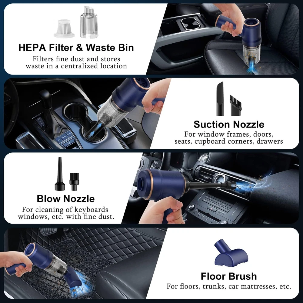 95658-chn-1 đăRechargeable Battery and Fast ChargingăThe Electric Vacuum Cleaner has a built-in 4000mAh battery with a fast charging port. It can be easily charged using a car charger, mobile power, laptop, rechargeable battery, and other methods. It takes only 3 hours to charge. This reusable Vacuum Cleaner is a perfect replacement for compressed air canisters and is environmentally friendly and energy-efficient. It also saves money and time âĄăPowerful Air Duster and Vacuum Cleaner 2 in 1ăOur Vacuum Cleaner has two functions: it can suck or blow. You can use it to easily blow away dirt, debris, dust, and other particles from the surface of your items, as well as to suck out the tiny stubborn dirt hidden in keyboards, corners, and crevices. The powerful function of the Vacuum Cleaner collector makes the dust in all places have nowhere to hide and makes all of your items look new đăEffortless MaintenanceăWith just one-click dismantling, you can easily dump garbage and clean the Vacuum Cleaner. The Hepa filter can be washed and reused, ensuring efficient suction power while keeping dust and dirt outside to prevent blockage âăSimple DesignăThe Vacuum Cleaner has a stylish design and weighs only 0.72 lbs, making it very compact and lightweight. It is comfortable to hold and saves space, making it easy to carry and store. In addition, it is designed with LED lights, so you can easily clean in dark places or at night. The user-friendly design brings great convenience to your cleaning work đăWide ApplicationăThe Cordless Vacuum Cleaner comes with many different detachable brush head nozzle accessories for cleaning various scenes. For example, it can thoroughly clean computer keyboards, cameras, air conditioners, sofas, windows, pets, plants, and more. You can use the Vacuum Cleaner as you like according to your needs, making cleaning easier Product Description