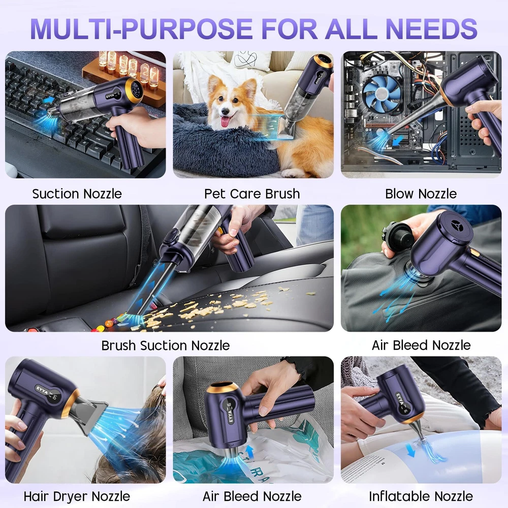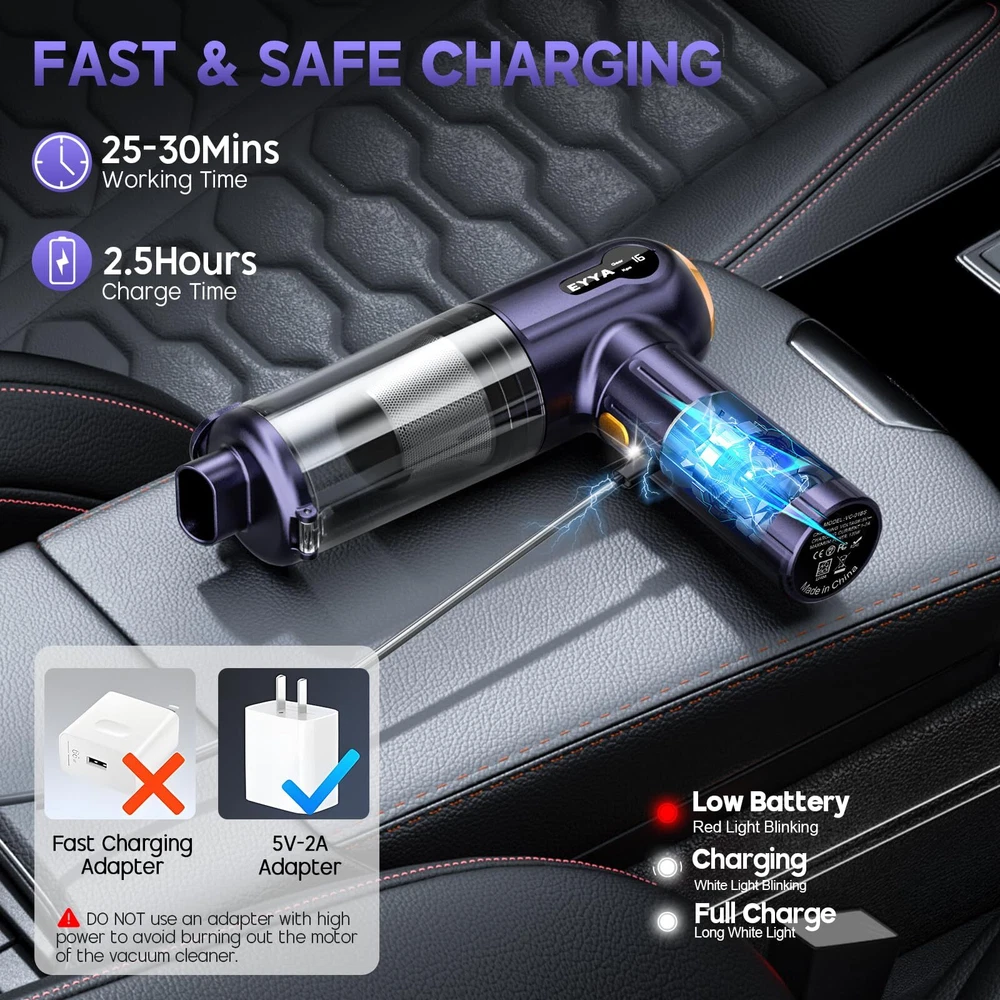 🟣【16000PA Powerful Suction】120W powerful motor provides strong suction and blowing options of 1 Gear-12KPA and 2 Gear-16KPA, you can adjust the vacuum cleaner's gear according to your cleaning needs. Whether cleaning up tiny dust or larger debris particles, it is easy to deal with. Car vacuum cleaner fast heat dissipation function keeps the motor stable at a high speed of 108,000RPM, preventing overheating and enhancing safety 🟣【7 Multi-Purpose Accessories】Multi accessories for all of your needs. Long suction nozzle, brush and long nozzle make it easy to clean all kinds of dust and garbage. Hair dryer nozzle provides powerful wind to quickly dry damp clothes or hair. Pet care brush can suck away hair while brushing your pet. Large universal nozzle can vacuum storage bags or inflate mattresses and rafts. Small universal nozzle can inflate and deflate yoga balls, swim rings and more 🟣【Dual Filtration System】Handheld vacuum cordless cleaner comes with an upgraded dual filtration system that prevents suction loss and clogging. With reusable filters, the steel filter can effectively filter large particles of debris, and the washable HEPA filter can filter tiny particles and dust to prevent damage to the motor. Unique -click dusting and U-locking design makes it easy to empty the dust cup while preventing accidental touching of the button 🟣【Digital Display & Fast Charging】Handheld car vacuum cleaner is equipped with a digital display that clearly shows the current number of gears used and the suction power level, which can help you better control the cleaning progress. 4000mAh reusable battery can be fully charged in just 2.5 hours. The working times of Gear-1 is 30min and Gear-2 is 25min under full charge. Note: Please don't use high power adapter, 5V/2A adapter can be used for charging 🟣【Portable & LED Light】Car vacuum portable cordless cleaner has a cordless design, so you don't have to worry about cords when cleaning. Our mini vacuum cleaner is made of lightweight material, only 0.66LB, making it easier to hold. Compact size can be easily stored in a drawer or locker to take up no space. Equipped with an LED light to illuminate dark corners, allowing you to easily clean without light restrictions