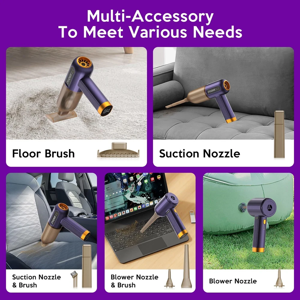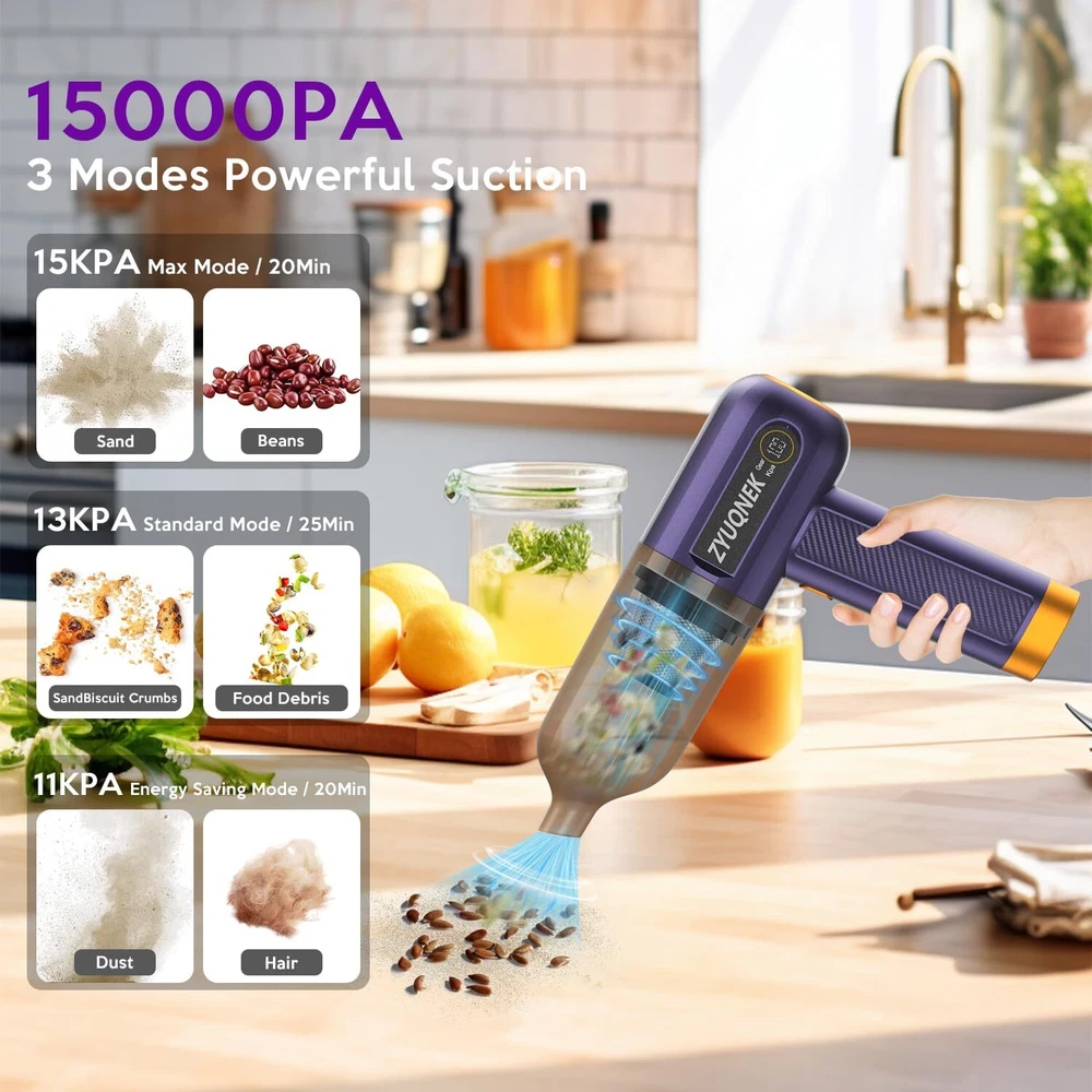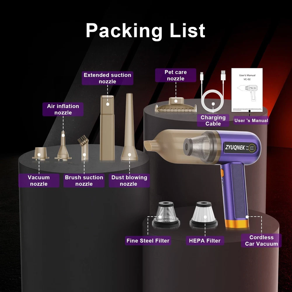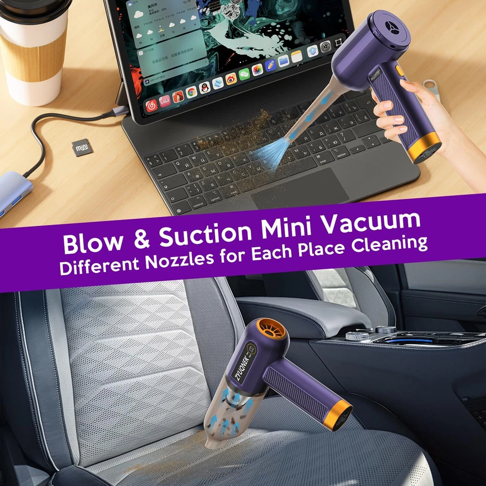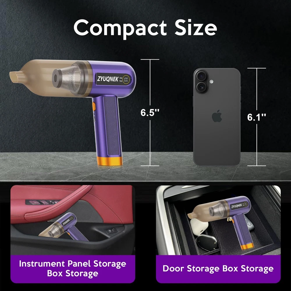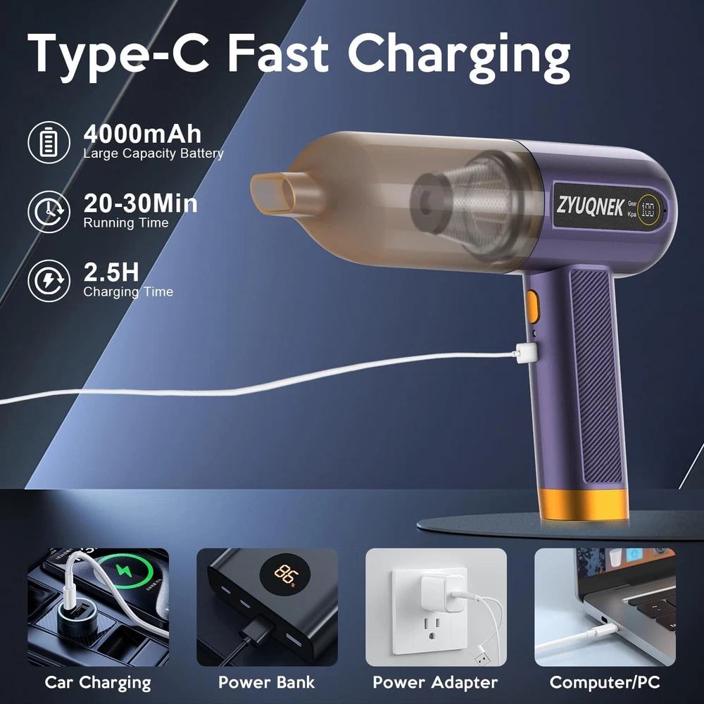 Unmatched Suction Power: The VC-02 car vacuum features a powerful 15000PA suction, making it ideal for removing even the most stubborn dirt and debris from your car, home, or office. This powerful suction makes it one of the best car vacuum cleaners available. Versatile Cleaning Options: With 3 adjustable speeds and 7 multi-purpose attachments, this handheld vacuum adapts to various cleaning tasks, from carpets and upholstery to tight crevices and electronic devices. Perfect for car vacuum portable cordless use. Efficient Filtration: The dual filtration system ensures that dust and allergens are effectively captured, providing a cleaner environment and prolonging the filter's lifespan. Ideal for those needing a mini vacuum cleaner. Convenient and Portable: The compact and cordless design allows for easy maneuverability and storage, making it a perfect travel companion for maintaining cleanliness on the go. Its lightweight nature makes it a top choice for a mini vacuum. Extended Runtime & Fast Charging: The 4000mAh battery delivers up to 30 minutes of uninterrupted cleaning, and the Type-C fast charging ensures the vacuum is always ready for action. A high-power vacuum cleaner for car owners.