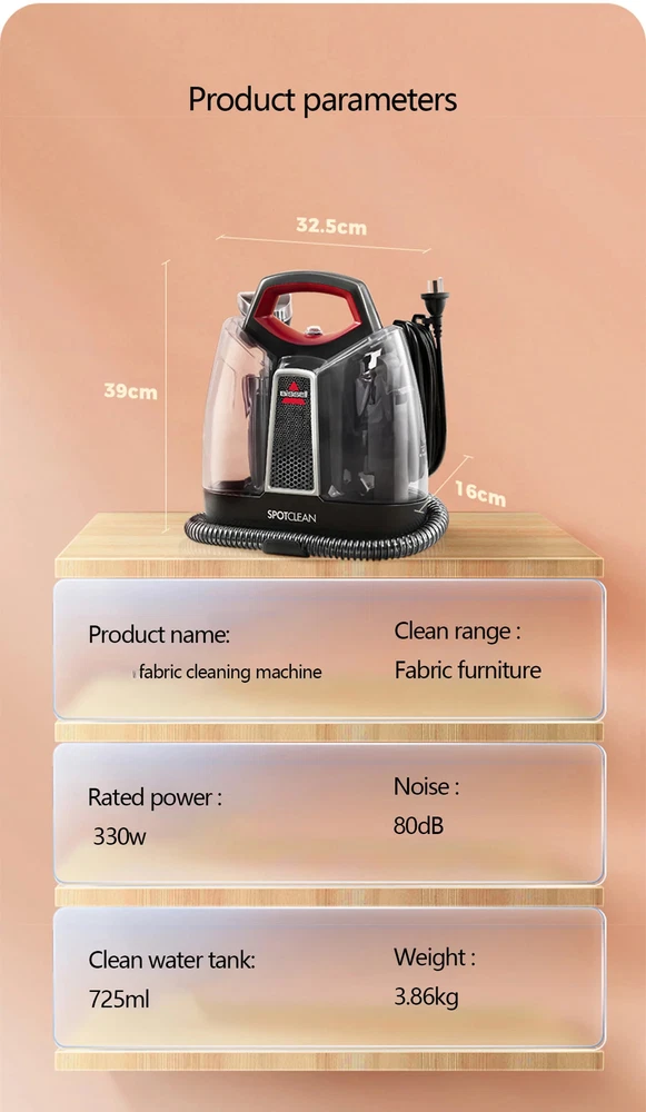 Household Handheld Steam Cleaner Sofa Carpet Curtain Car Vacuum Cleaner Spray Suction Integrated Machine Cleaning Machine Product parameter Model: 3698-Z Power: 330W Voltage: 220-240V Function: wet and dry Cable length: 5m Size: 39*32.5*16cm Net weight: 3.86kg Product parameter 1. Small fabric sofa and carpet cleaning machine, spray and suction integrated cleaning machine, household vacuum cleaner 2. Integrated suction and washing, clean and separate dirt, fast dissolve the dirt Heatwave heat wave technology 3. Deep moisture absorption, go deep into the surface layer 2, spray water and absorb water as a whole to clean, absorb and wash in one step 4. Strong pressure water seepage, low-grind fine dense brush to clean the colleague without damaging the material, clean dirt separation, clean water tank 725ML, sewage tank 1100ml Suck and wash in one Simultaneous washing and suction Clean and dirt separation No secondary pollution Quickly dissolve dirt Heatwave technology Deep moisture suction 2cm deep into the surface Pollution is difficult to remove from hiding Precipitation stains are like icebergs. After the surface is cleaned, 90% of stains are still hidden in the bottom of the fabric Deep suction Water spraying and water suction are integrated and clean In-depth cleaning of deposited stains and old spots in the fabric Between back and forth, the washing and suction is done in one step Moisture Suction Technology Three-step cleansing and renewal 1 spray Strong pressure seepage Press on demand, spray water instantly, spray evenly 2 brush Low-wear fine brush Flexible as silk, clean without damaging the material 3 suck Focus on suction design Suck stains on the bottom of the fabric Clean and dirt separation No secondary pollution To be used with the original cleaning fluid Purify the home environment and maintain the fabric A heated water tank Dissolve stains quick one step Proprietary heatwave technology Keep the water tank at its initial water temperature, helping to break down stubborn stains ● Wash the carpet ,it is recommended to use water below 30 degrees; ● Clean stains, blood stains, it is recommended to use cold water; ● Cleaning fabrics such as sofas, it is recommended to use warm water from 25 to 40 degrees. Handle every accident with ease The mat at the door Old footprints sofa Milk stains/crayon marks Long hair carpet in the living room Watermelon juice/drink mattress Urine stains/milk stains/holidays Car seat Coffee/drinks curtain Old stains/dust Get closer Pet odors go nowhere Quickly clean pet urine stains, dirty footprints Relieves odors at home Small and convenient,It's easy to play from a distance,6.3m large cleaning radius,From the living room to the bedroom, there is no need for frequent interstitial changes Easy to store,Bag size, does not take up space,Easy to carry away, easy to store Clean easily and hide in detail. ①Soft plastic switch Soft touch, waterproof and static-resistant ②Wire hooks Tangled wire is good to store, wires do not tangle feet ③The hose hook Around bunching design, save storage space Product parameters Product name: fabric cleaning machine Clean range :Fabric furniture Rated power : 330w Noise :65dB Clean water tank: 725ml Weight :3.86kg