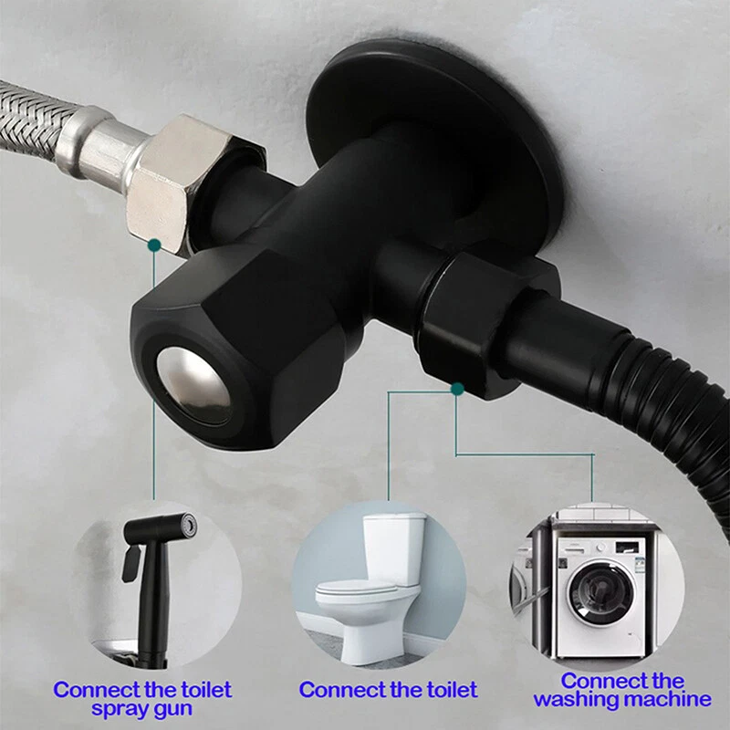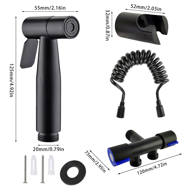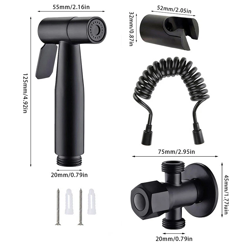 Please check the size carefully before purchasing, pay attention to the valve caliber! (The size of this connection angle valve is G1/2 inch) Color: Black (We also have brushed gold and brushed colors, you can search in our store) Bidet Material: Stainless Steel Valve material: brass Feature: Adjustable water pressure Connection: G1/2 inch Hose length: 1.2-1.5m Usage: bidet, rinsing, cleaning, diaper sprayer, washing, feminine hygiene Delivery content A : 1pc Toilet Sprayer or B : 1pc Toilet Sprayer+2m Hose+1pcs base or C : 1pc Toilet Sprayer+2m Hose+1pcs base+1pcs Single control double outlet valve or D : 1pc Toilet Sprayer+2m Hose+1pcs base+1pcs Double control double outlet valve Notice: Please allow 1-2cm error due to manual measurement. Due to the different display of each computer, the pictures may not reflect the actual color of the item. On Feb 4, 2025 at 20:17:57 PST, seller added the following information:
