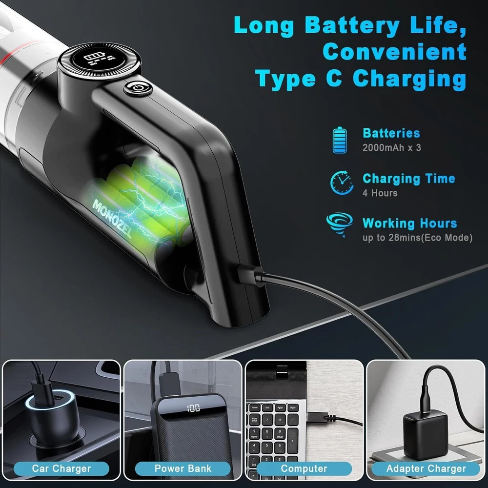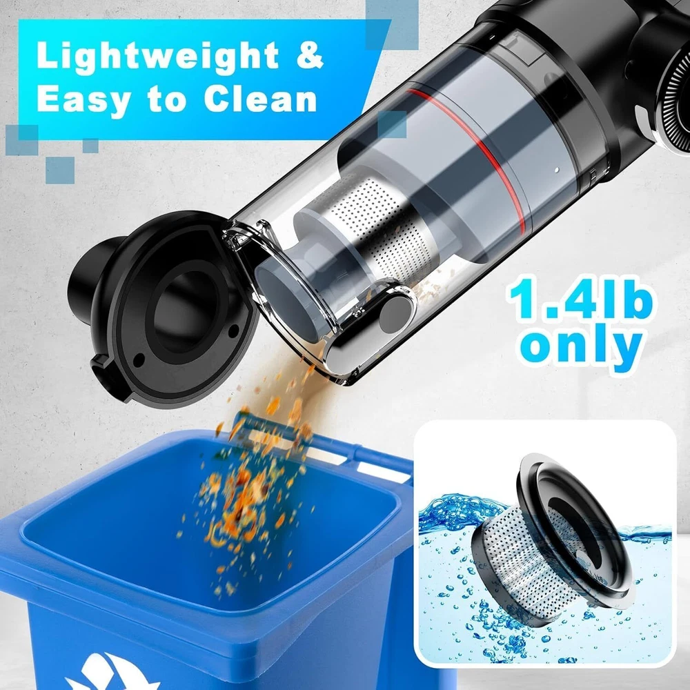 Special Feature Cordless Filter Type HEPA Filter Included Components Adaptor Is Cordless? Yes Surface Recommendation All floors Power Source Battery Powered Voltage 5 Volts (DC) Item Weight 1 Pounds About this item 15000Pa SUCTION AND BRUSHLESS MOTOR: Built with the upgraded brushless motor, our hand held vacuum cleaner has a suction up to 15000Pa(Max mode), very powerful!!! It also has an Eco mode of 10000Pa for simple cleaning tasks. It can help you to do all-around cleaning with a powerful motor and long battery life. The portable vacuum cleaner cleans dust, crumbs, and pet hair from carpets, living rooms, kitchens, and offices with outstanding performance. LONG BATTERY LIFE AND FAST CHARGING: With multiple 2000mAh*3 batteries and quick charge tech, the battery life is extended by about 26 minutes when fully charged for 4 hours. The LED light on your cordless car vacuum works well to illuminate those dark, hard-to-see places. Only need to press the switch and it will start working, don't have to hold it down with your hands, which is very convenient. FULL PROFESSIONAL ACCESSORIES: The brush tool can clean hair and dust that is on the surface, and the crevice nozzle tool can be used to clean sofas, crevices, and corners. An extension tube can dust baseboards, blinds, and those pesky cobwebs in the ceiling corners. Any inch of your house/car can be covered with the full accessories. Perfect for those who have pets also. It comes with 2 reusable durable HEPA filters to meet your usage needs. The included adapter can better protect charging. EASY TO CLEAN: With just one click dismantling, you can easily dump garbage and clean the Vacuum Cleaner. Only weighs 1.4lb, portable and easy to hold. The enhanced HEPA filter can be washed and reused, ensuring efficient suction power while keeping dust and dirt outside to prevent blockage. Please dry it before putting it back into the vacuum. Special Feature Cordless Filter Type HEPA Filter Included Components Adaptor Is Cordless? Yes Capacity 1.4 Liters Wattage 100 watts Runtime 26 minutes Charging Time 4 Hours Maximum Suction 4.33 Inches Recommended Uses For Product Home, Car, Office, Carpet, Hard Floor, Hardwood, Tile Floor, Rug, Bare Floor Form Factor Handheld Color Black Model Name VC028 Product Dimensions 3.2"L x 3.2"W x 14.5"H Battery Description Lithium-Ion
