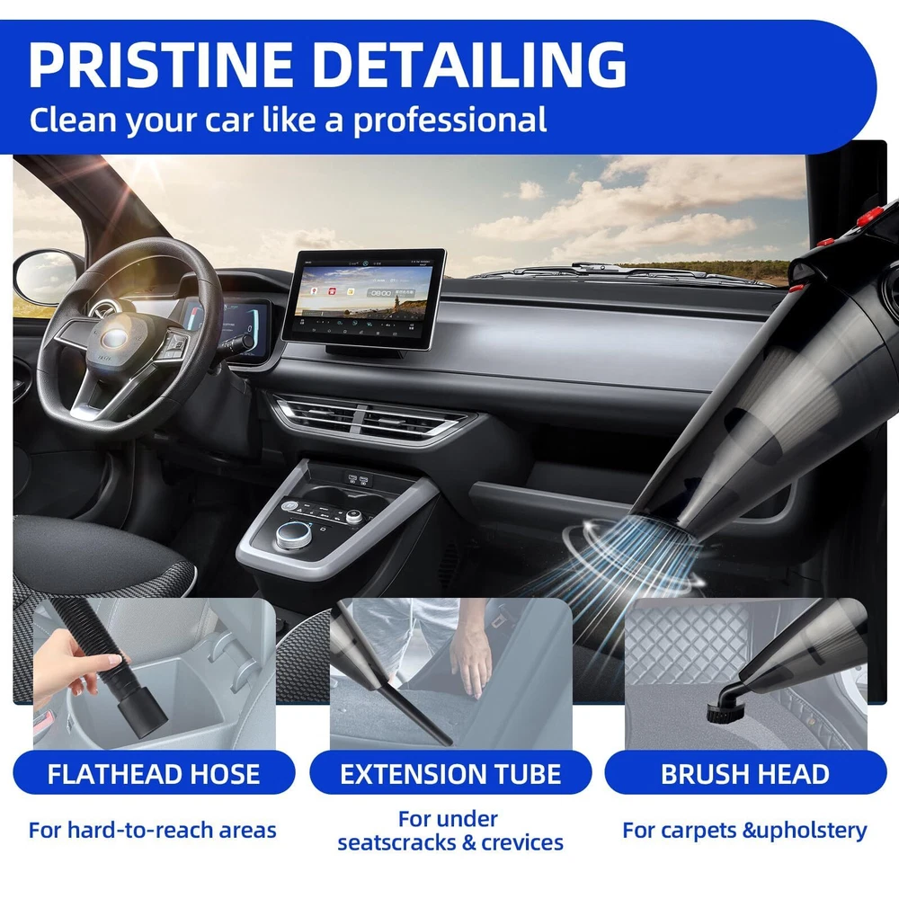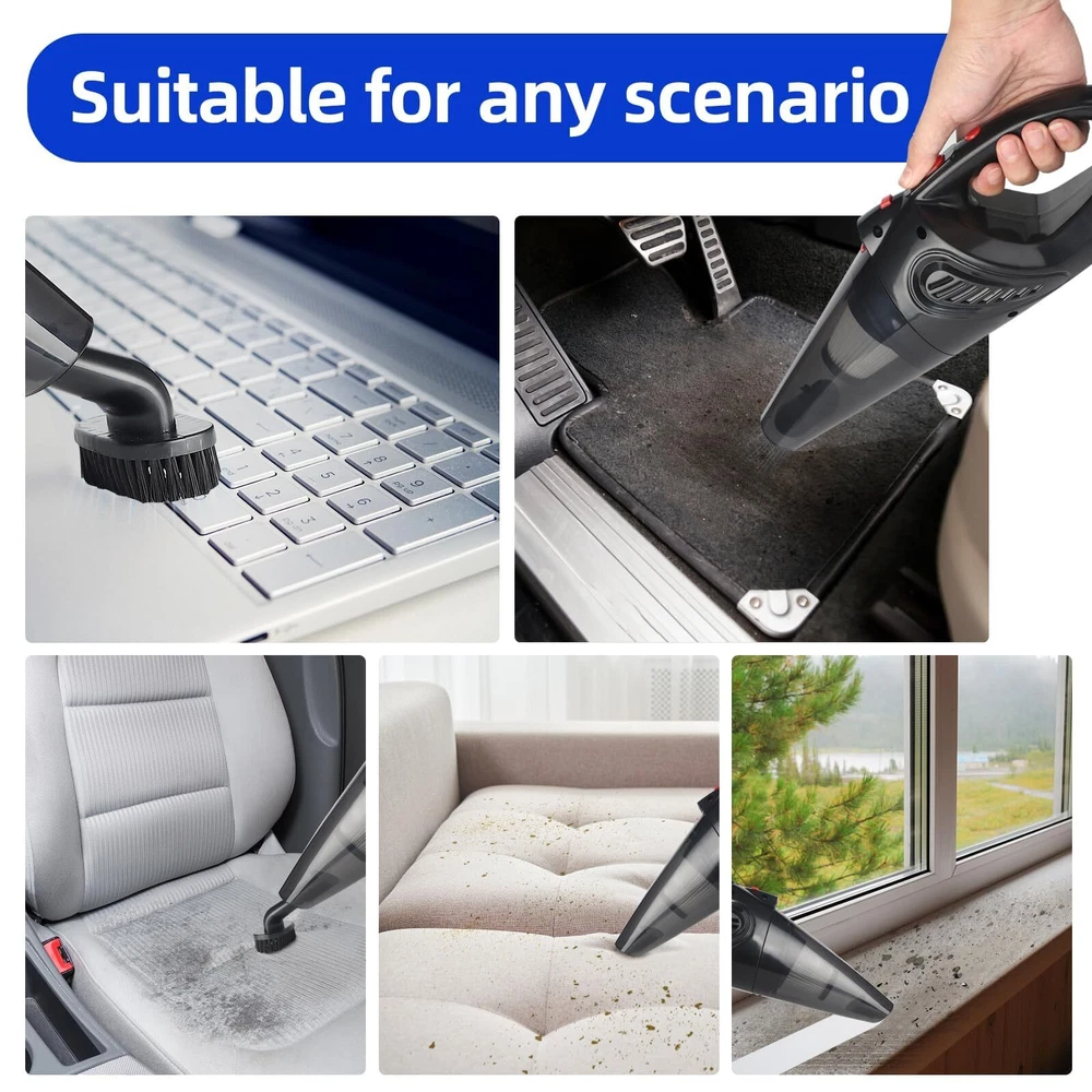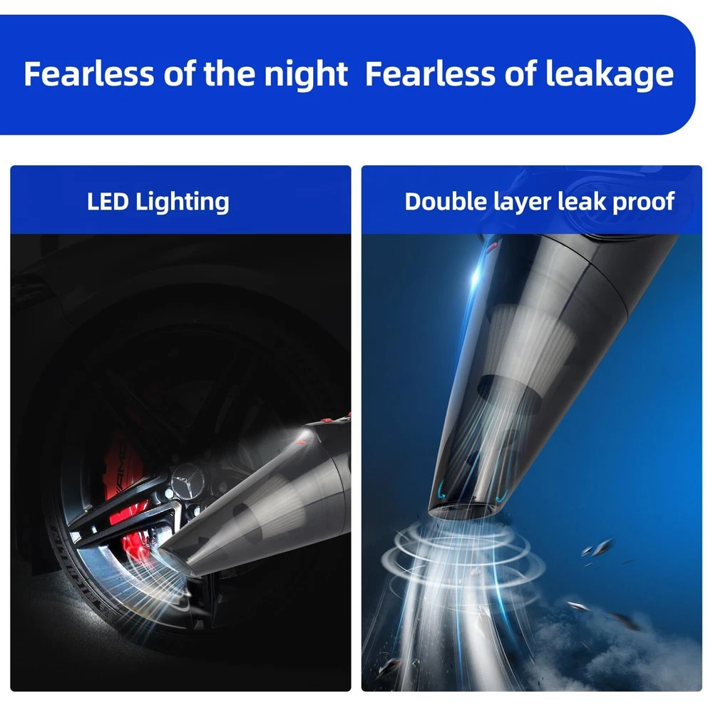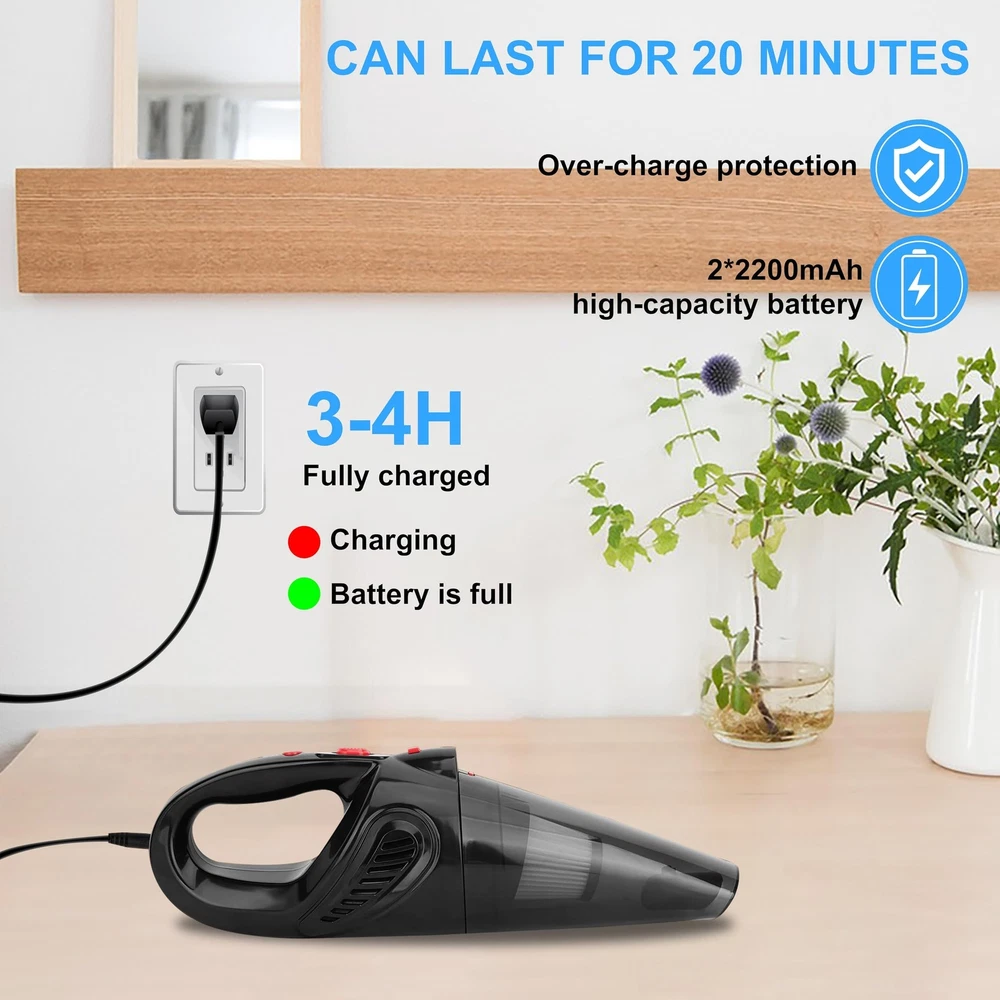 High Performance Big Suction:9000Pa small hand held vacuum cordless with new upgraded high-performance motor,dustbuster hand vacuum cordless rechargeable brings the super power of burst wind suction upgraded core technology,car vacuums hand with best suction cordless,thoroughly removes dust, crumbs,and pet hair from carpets,kitchens,living rooms,and offices. Vacuum Portable Vacuum:The rechargeable handheld vacuum utilizes the latest in dual high efficiency filtration technology.It provides more efficient cleaning power,prevents frequent clogging of the filter,dust vacuum for bed. Small Cordless Vacuum:Dust vacuum cordless combines the body design with LED lights.The LED lights can illuminate all the places you need to clean and can be paired with different cleaning accessories,all kinds of garbage can be sucked up in go,dust busters cordless rechargeable,dirt handheld vacuum makes the cleaning work easier. Lightweight and portable:Portable vacuum cordless wet & dry vacuum cleaner body is lightweight,mini vacuum easy to use and carry around on a daily basis.500ML large-capacity dirt bowl allows you to clean all places at once, making daily cleaning more convenient and efficient. 4 in 1 Vacuum Cordless:With extra 3 different nozzles for various cleaning needs. The cordless vacuum cleaner easily reaches hard-to-clean narrow crevices, is lightweight (1.6 lbs.) and ergonomically designed so you can easily operate it by hand. Storage bag provides full protection for the car vacuum cleaner.