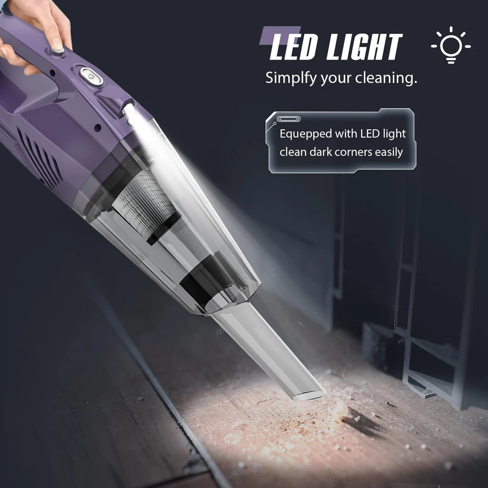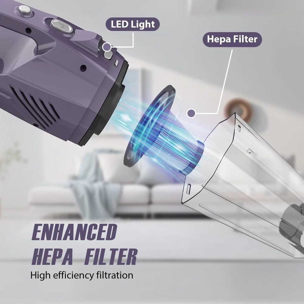 ❤Powerful Suction and Cordless Design:The handheld vacuum cordless stands out with its stylish and beautiful appearance. Strong suction power and upgraded motor to help you deal with a variety of dirt such as small debris, hair and food residue.The cordless design of this handheld vacuum allows you to clean stairs, rooms, cars or hard-to-reach corners anywhere.Its small size makes it easy to find its place in a cabinet, garage, laundry room or any other suitable corner. ❤Lightweight and LED Light:The hand held vacuum cordless weighs only 1.6 pounds, you can use the car vacuum portable cordless with one hand to finish the cleaning job. The bright LED light makes the hand vacuum cordless rechargeable easy to clean in dark areas, perfect for cleaning your car at night. Exquisite workmanship provide an unparalleled experience to you. ❤Washable Filter and Long Battery Life: The dust buster hand vacuum can work for up to 20 minutes after a full charge to help you with all aspects of cleaning. The enhanced Hepa filter is designed to prevent clogging of the filter while ensuring perfect suction power. Tip: If the hand vacuum cordless jus accidentally absorb wet objects and water, you need to dry it immediately to avoid damaging the motor. ❤Multi-functional Attachment:The portable car vacuum cleaner gives you three cleaning accessories.The hose and transparent clear crevice tool for stairs, corners, car seats and hard-to-reach spaces.The brush can can loosen the hair and dust stuck on the objects for better cleaning and dusting of carpets and sofas.Tip: Comes with usb charging cable (charging head is not included), the USB charging cable will always light up green when fully charged. ❤Good After Service: This cordless handheld vacuum cleaner can be used at home as well as a helper for traveling out. It is also a good present for friends and relatives. If you have any questions about the car vacuums cleaner, please contact us as you please, we will try our best to help you within 24 hours. We always welcome your inquiries and will do our best to help every customer.