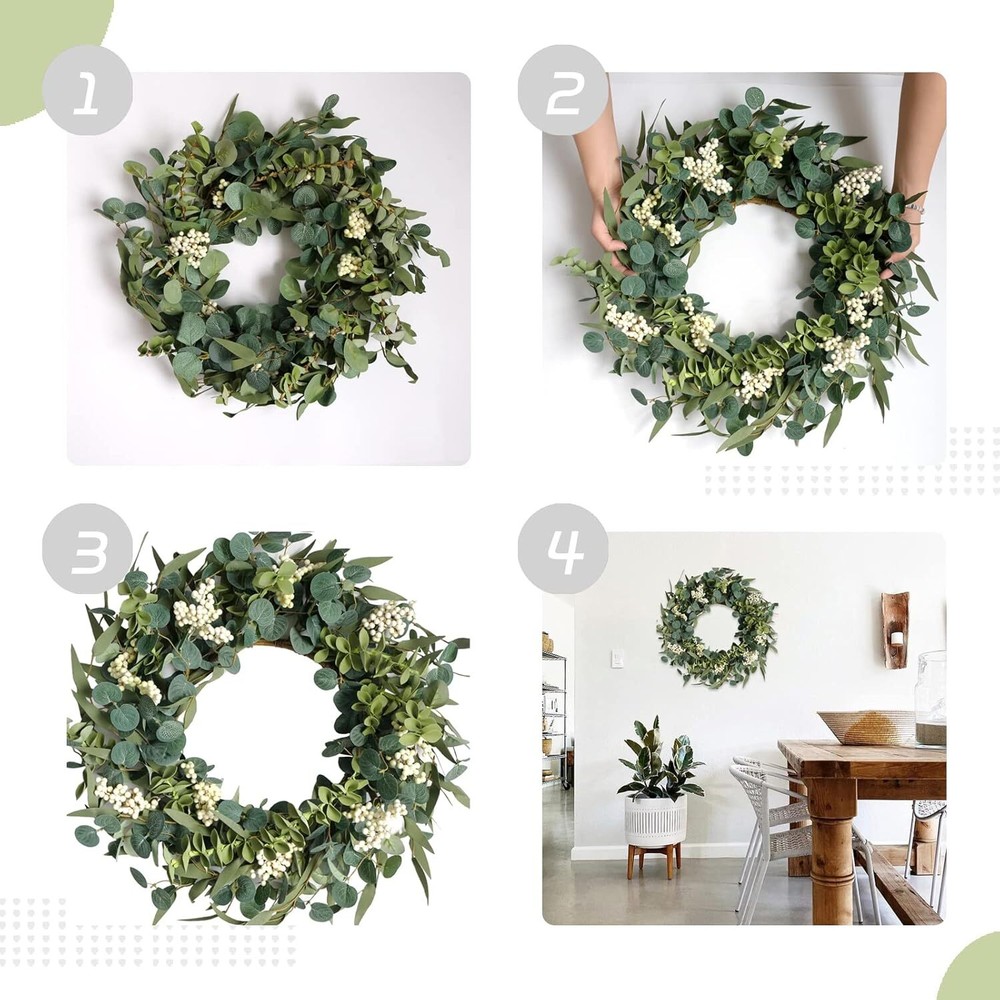 Elevate your space with the **20-Inch Artificial Eucalyptus Wreath** – a timeless, nature-inspired decor piece designed to bring the serene beauty of the outdoors to your home. Perfect for decor enthusiasts who adore natural aesthetics, this handcrafted wreath blends rustic charm with versatile elegance, making it ideal for year-round celebrations, farmhouse styling, or thoughtful gifting. 🍃✨ Features: ✨ All-Season Elegance in 20 Inches With a generous 20-inch diameter, this wreath creates a striking focal point for any space. Its lush blend of artificial eucalyptus leaves, willow sprigs, and tiny white berries mimics nature’s perfection, offering a fresh, vibrant look for spring, summer, holidays, or everyday decor. ✨ Handmade with Premium Craftsmanship Every detail is meticulously crafted by hand, ensuring a realistic, high-quality finish. The durable artificial foliage retains its shape and color, while the reinforced wire frame guarantees longevity – no wilting, watering, or maintenance required! ✨ Versatile Decor for Every Occasion - Front Door Welcome: Impress guests with a lush green greeting. - Indoor & Farmhouse Charm:Adorn walls, windows, mantels, or rustic kitchens. - Outdoor Oasis (Shaded Areas Only): Spruce up porches, patios, or garden gates. ✨ Upgraded Design for Durability & Style The new 2025 version features a sturdy, weather-resistant base (for shaded outdoor use) and an earthy burlap bow for added farmhouse flair. Its lightweight design ensures easy hanging indoors or outdoors with any standard hook. ✨Warm note:Each package contains one wreath. Shipping and packaging may cause the wreath to warp, don't worry, you can take the wreath out and adjust it to your liking. Thank you for your purchase. If you have any questions about your wreath, please feel free to contact us and we will provide you with the best solution. Specifications: Color - Green Material - Foam, Plastic Mounting Type - Door Mount Shape - Round Product Dimensions - 3.5"D x 20"W x 20"H Seasons - Summer, Spring Indoor/Outdoor Usage - Outdoor, Indoor Package List: 1pc